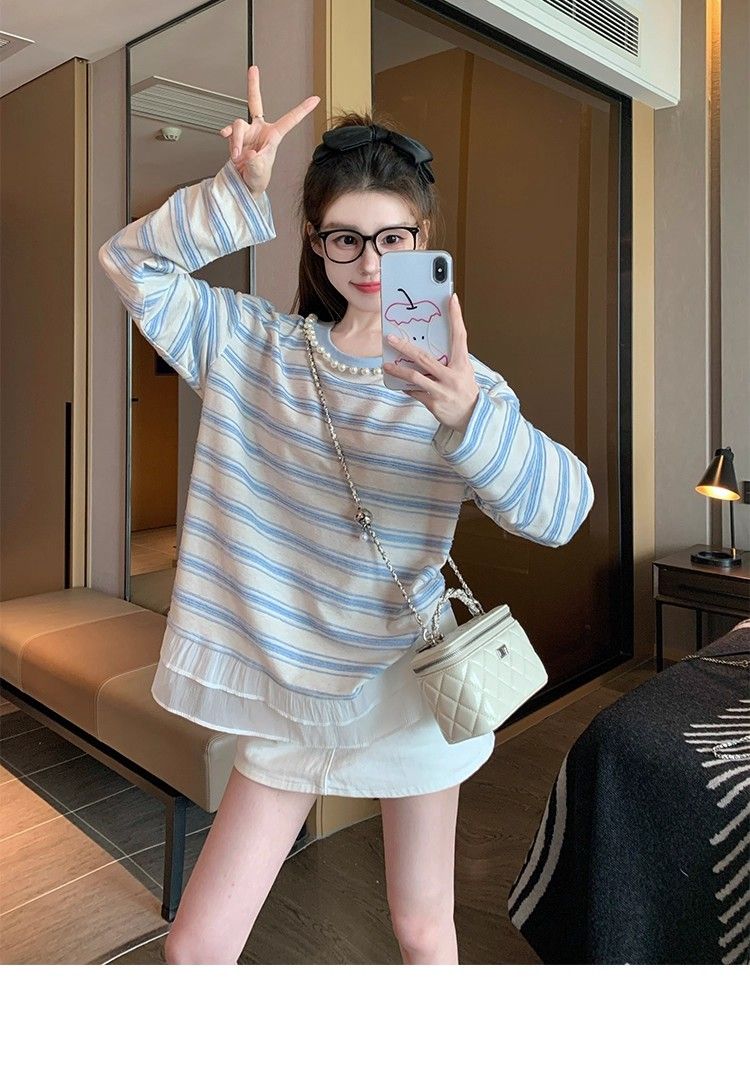 공식 사진, 오리지널 품질, 플러스 사이즈(300파운드), 여성용 줄무늬 핸드 비즈 장식 긴팔 티셔츠, 가을용 상의.