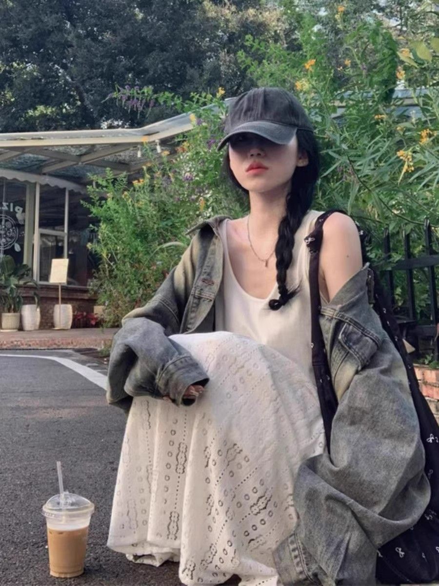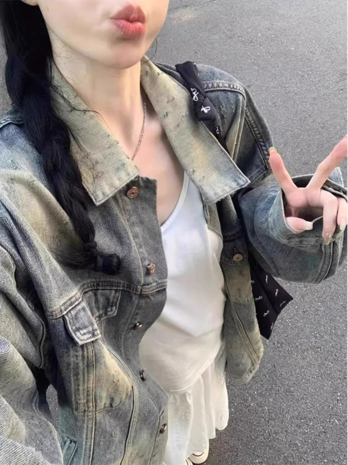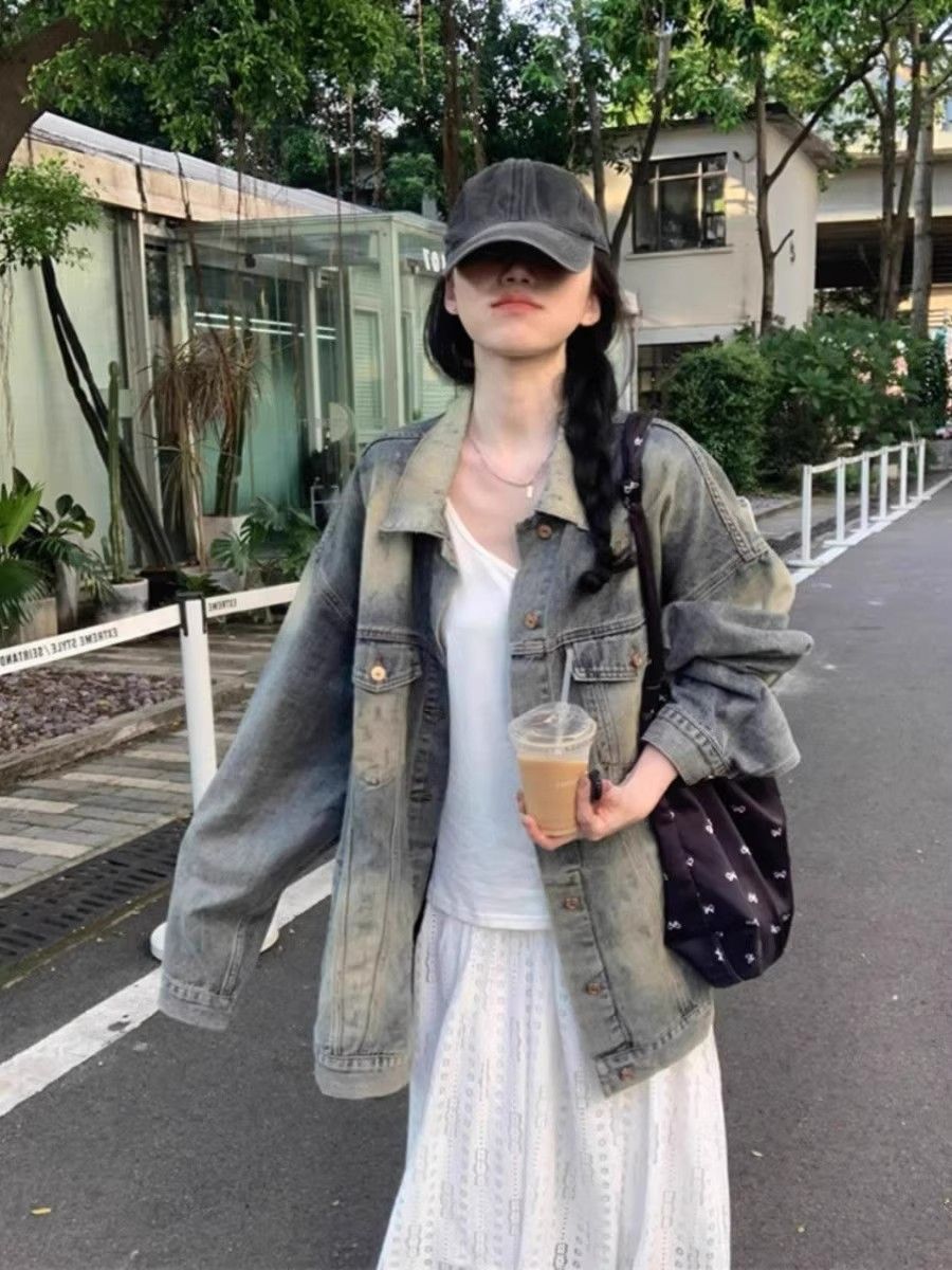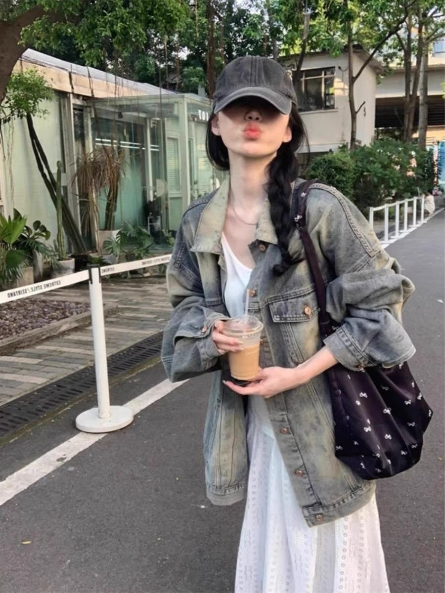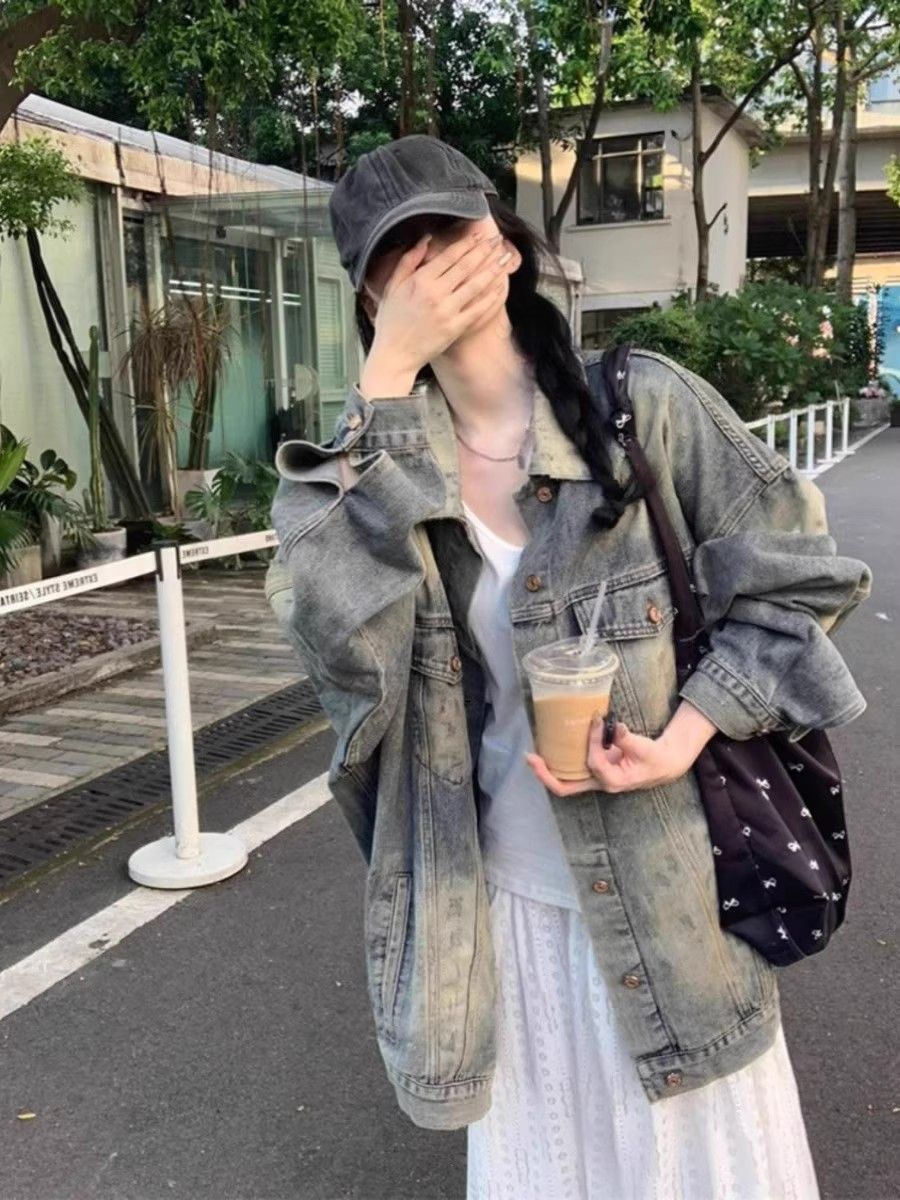 怀旧复古水洗做旧中长牛仔外套女春秋新款宽松时尚港风