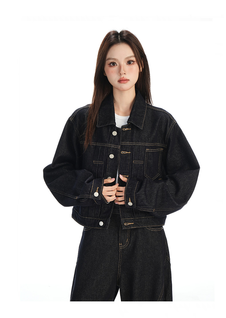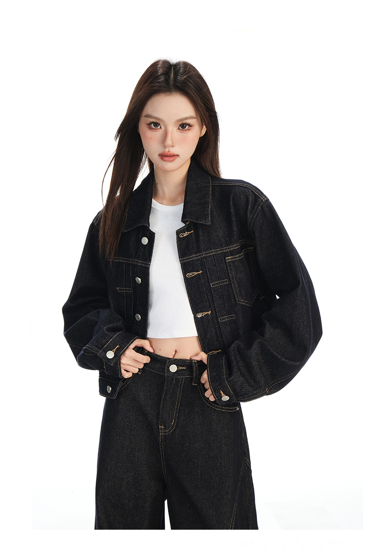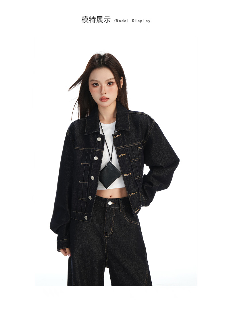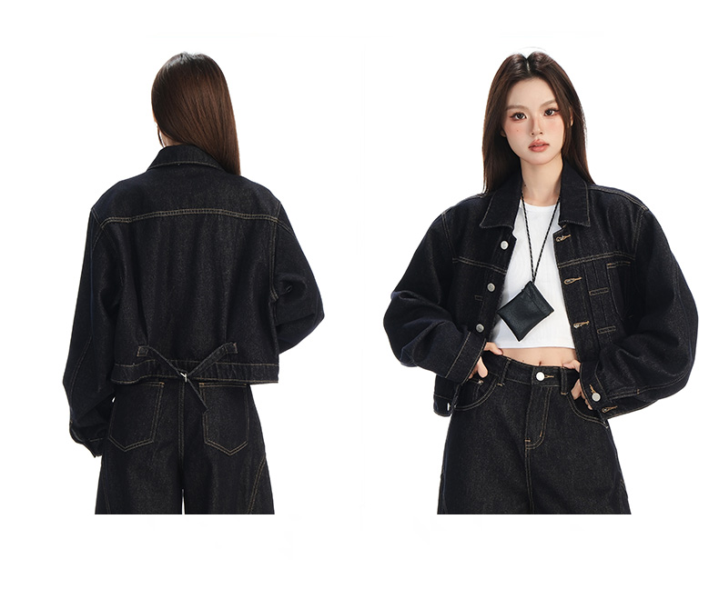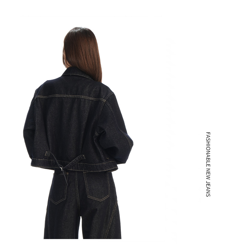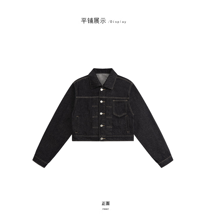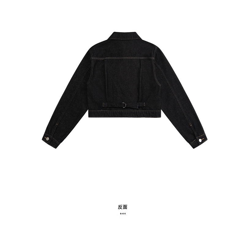实拍黑金深色翻领纽扣后系带短款牛仔服女新款防褪色复古时尚百搭