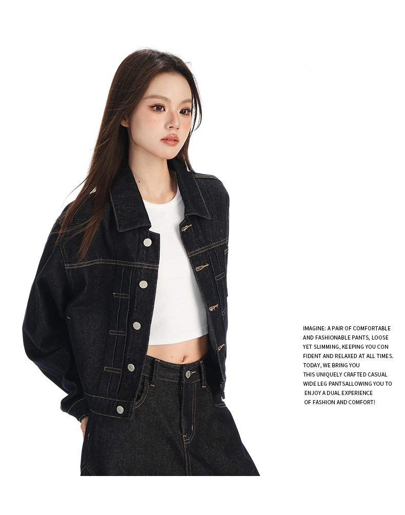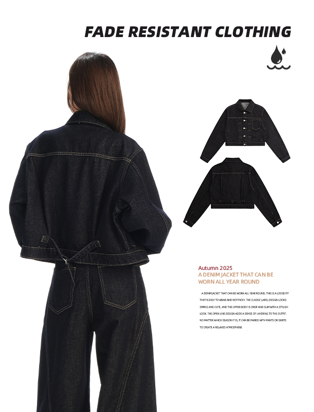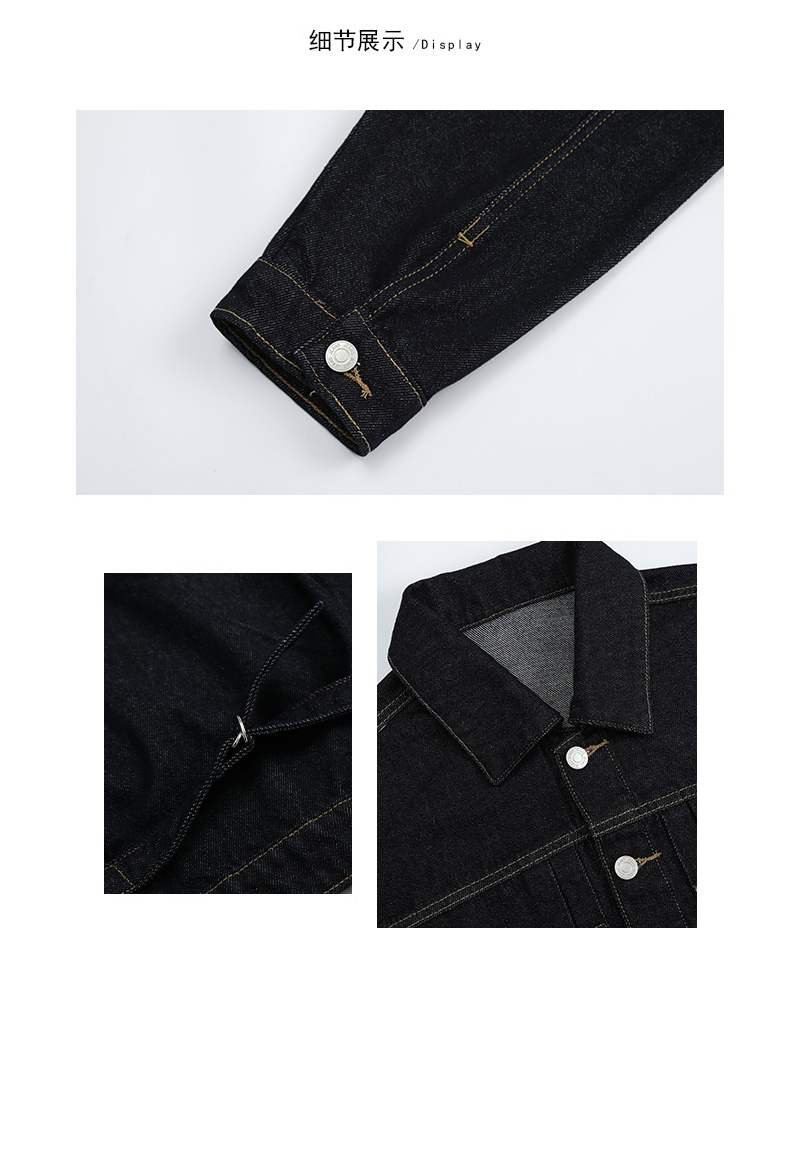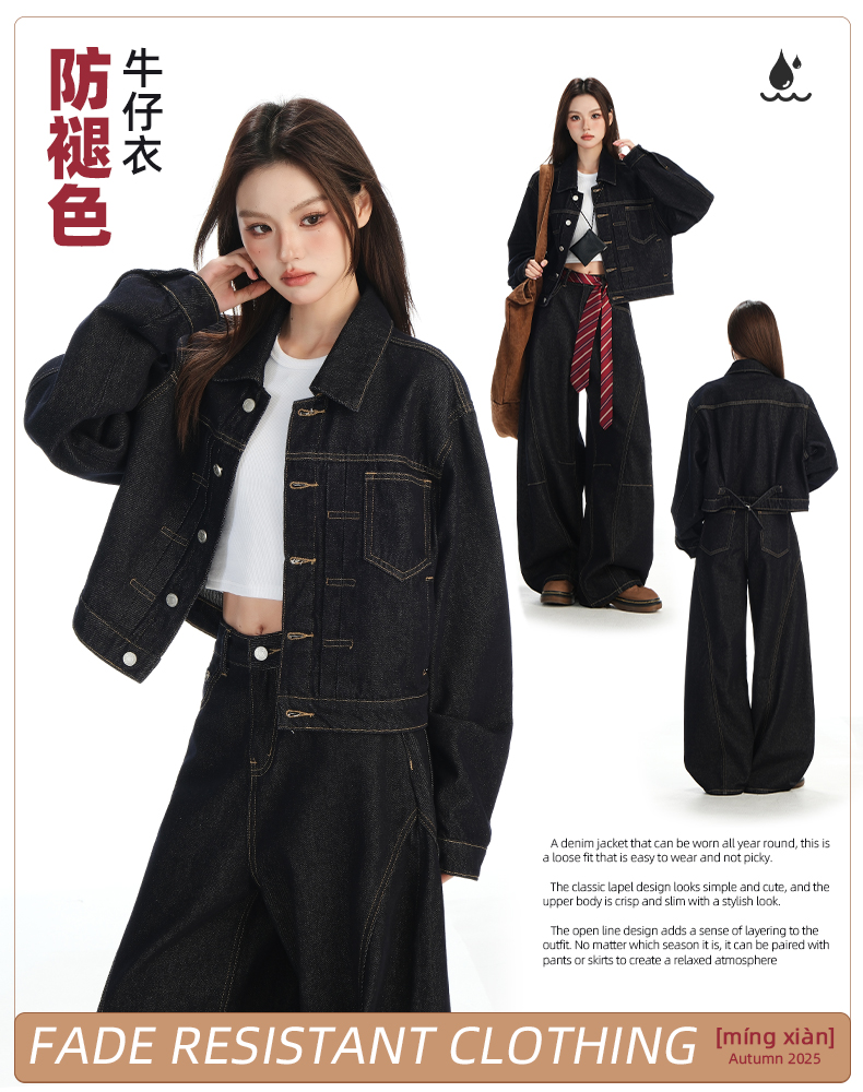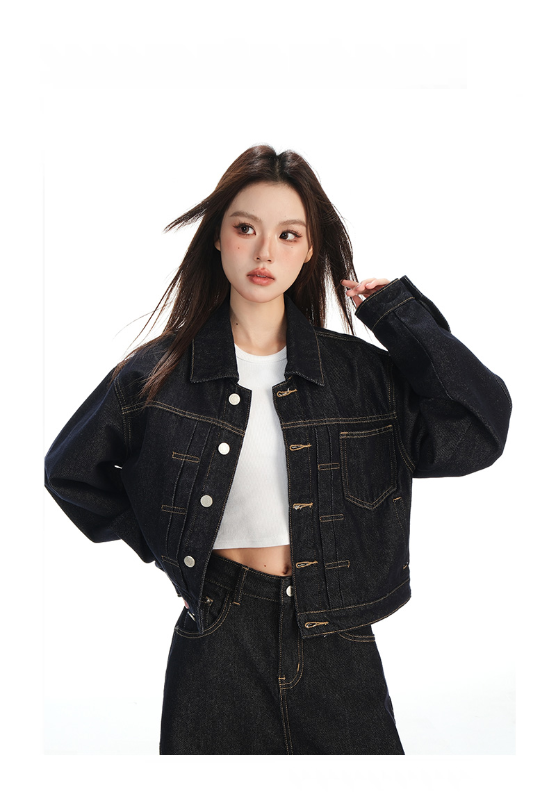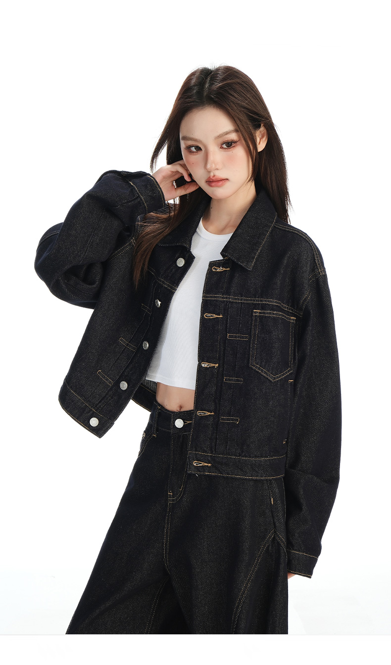 实拍黑金深色翻领纽扣后系带短款牛仔服女新款防褪色复古时尚百搭