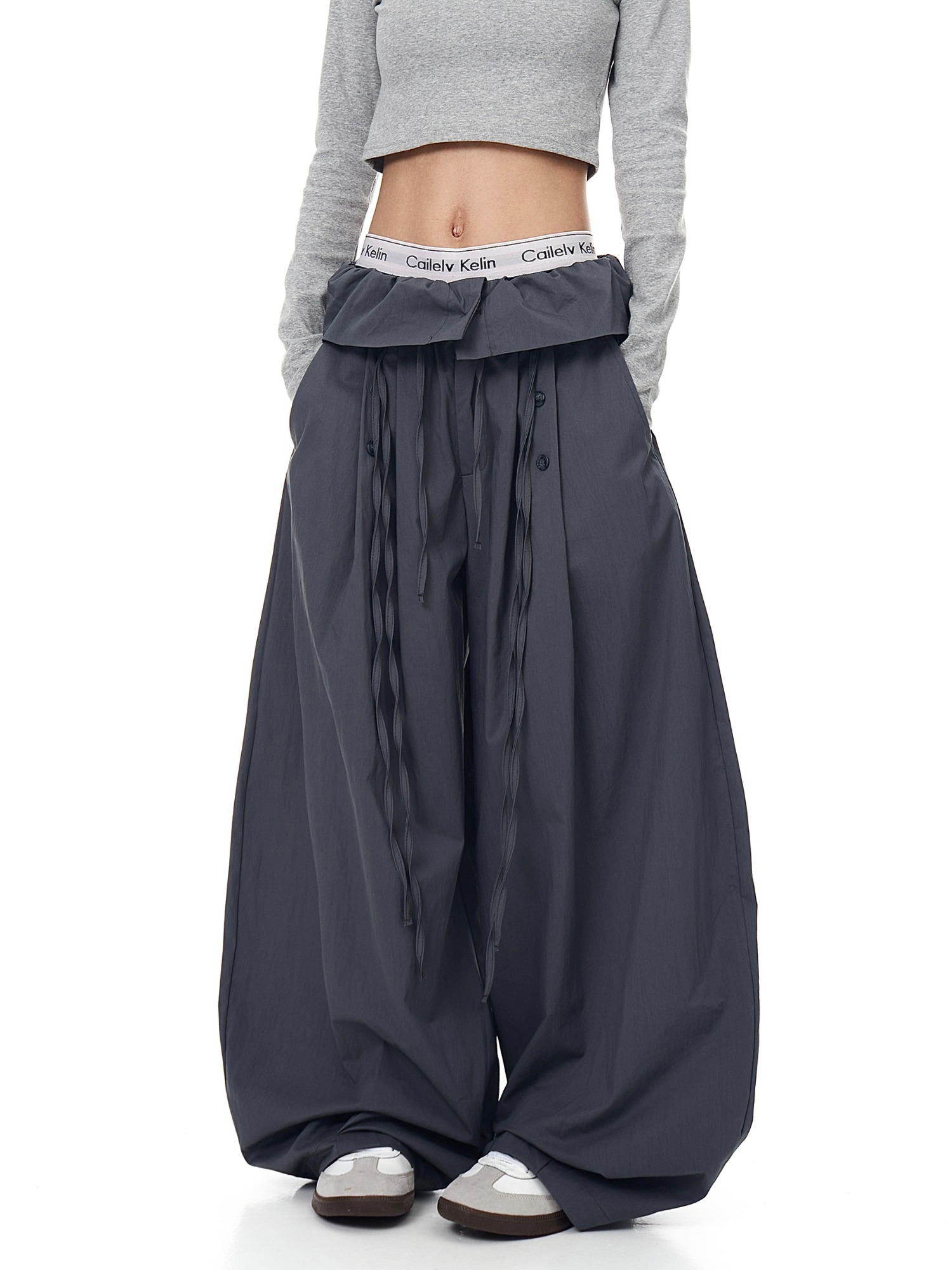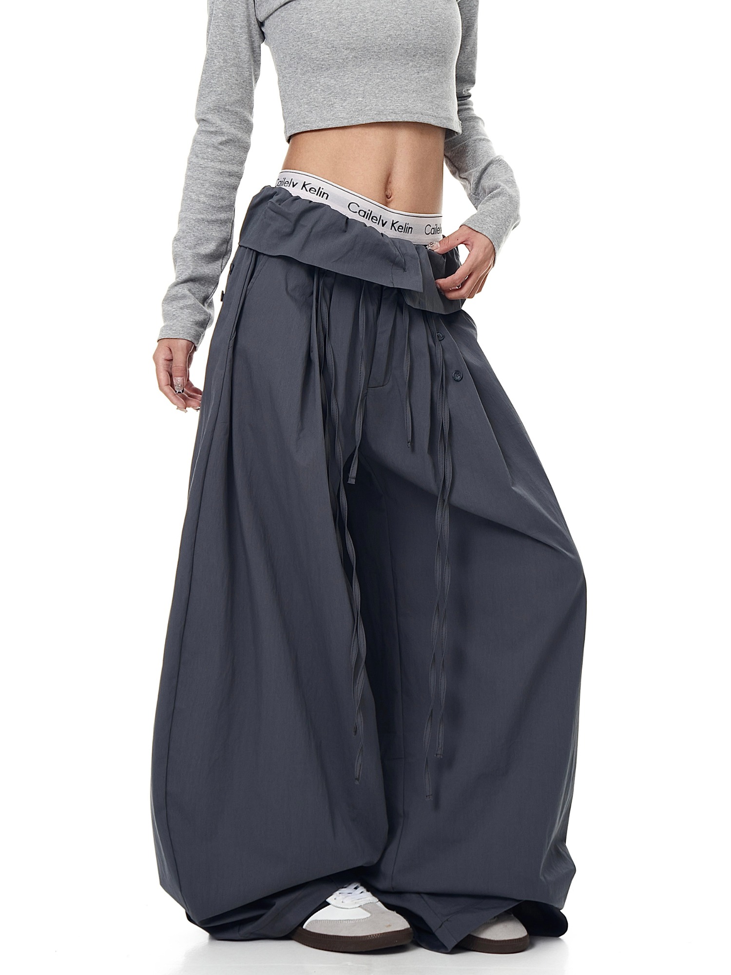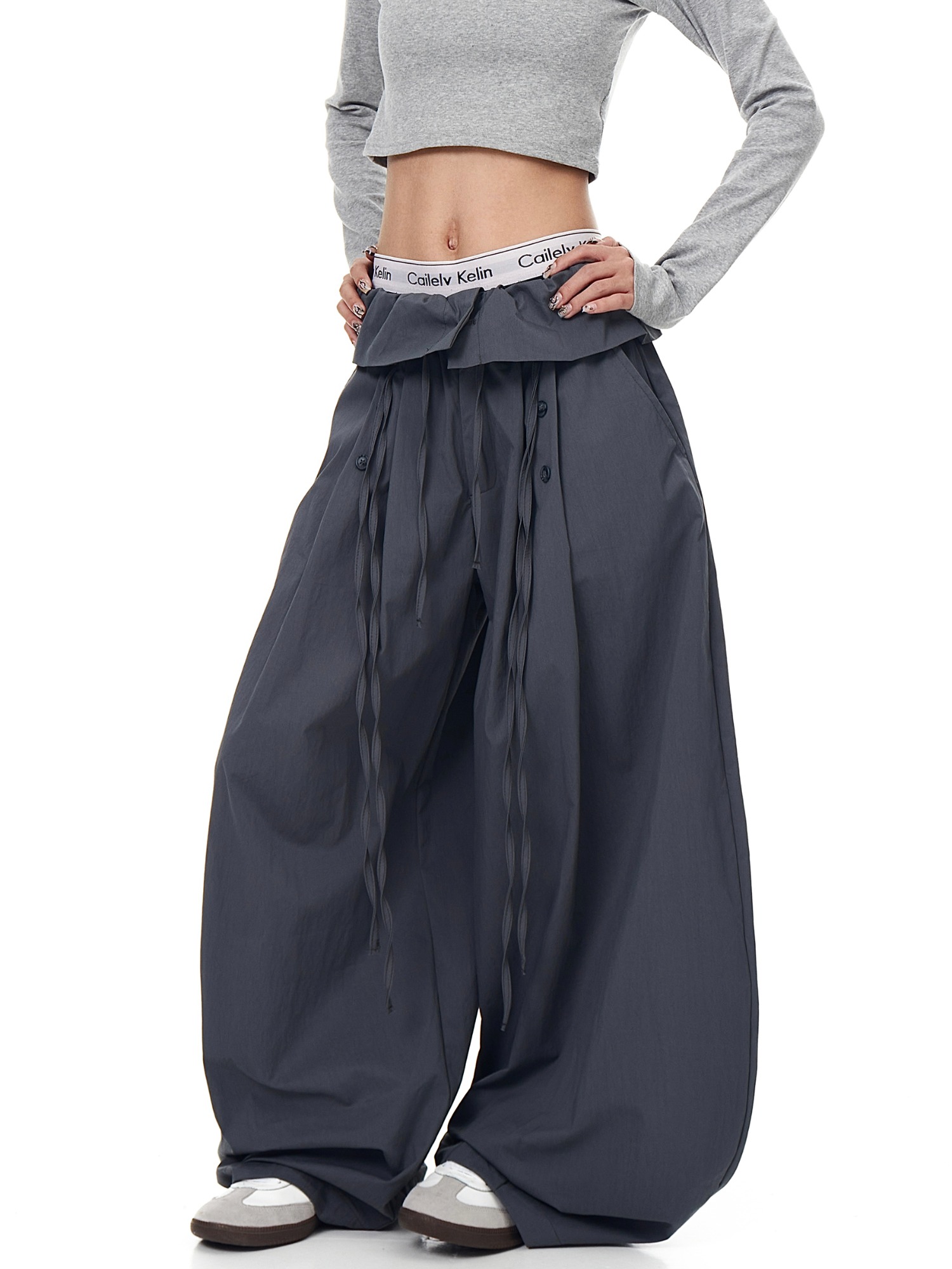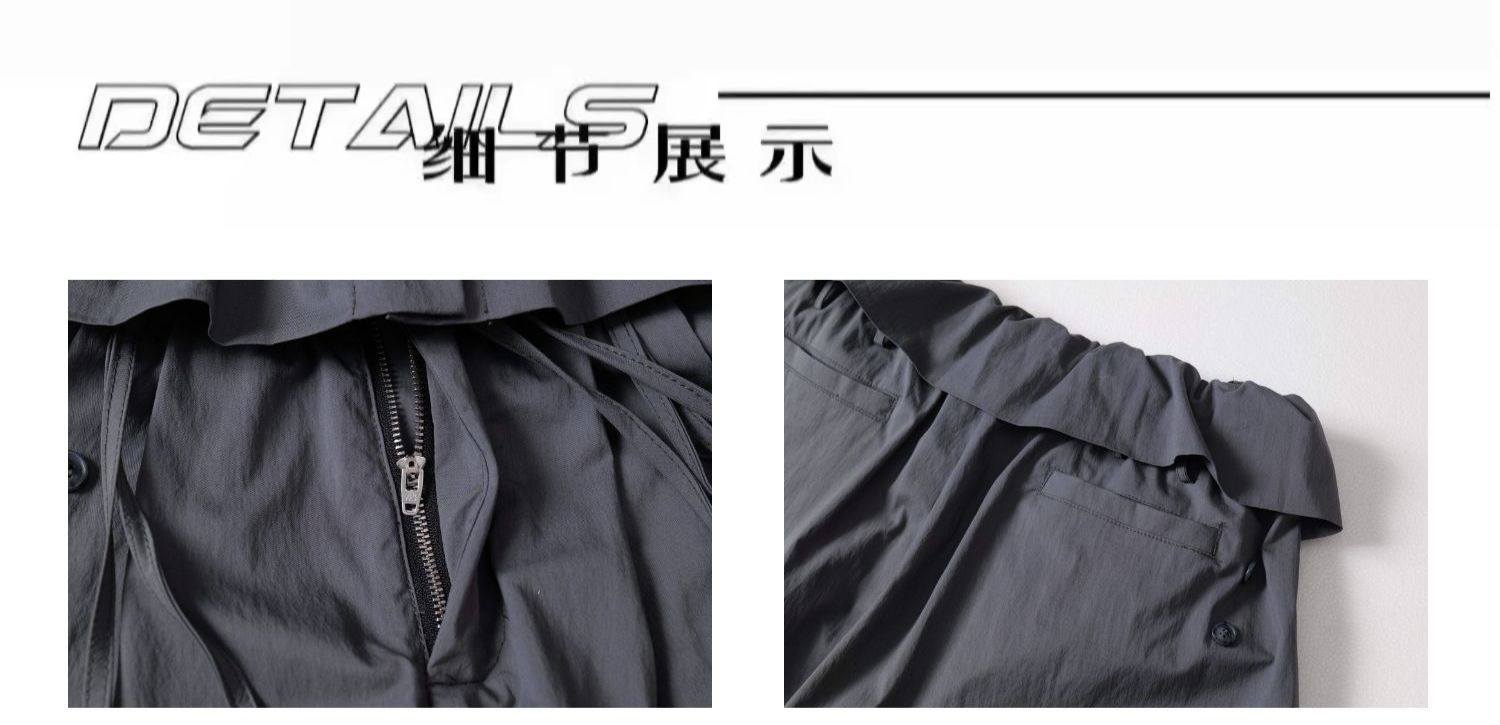XXDIRLY美式高街荷叶边拼接弯刀休闲裤女宽松阔腿设计感褶皱裤子