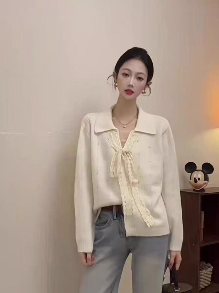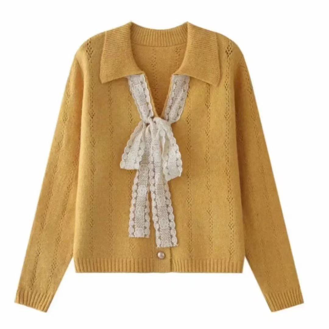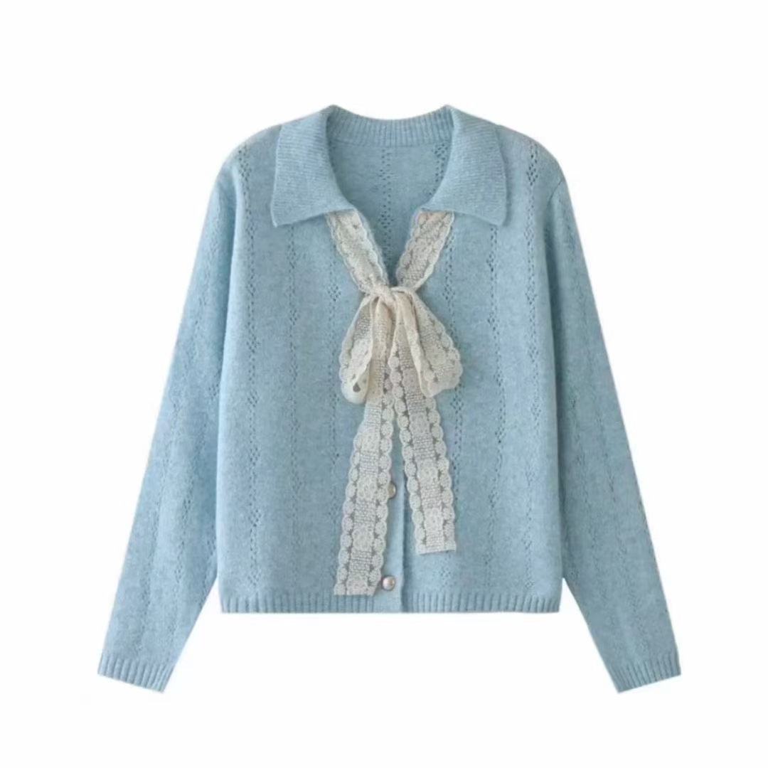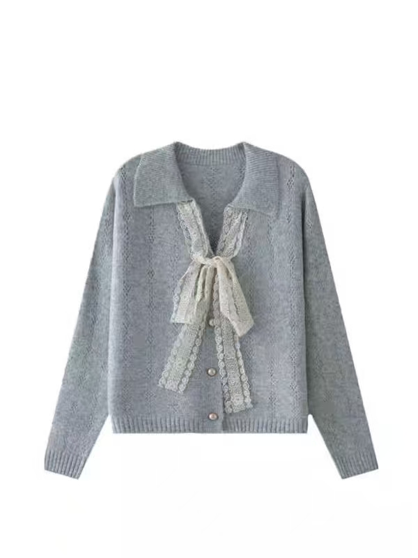 레이스 장식 리본 브이넥 긴팔 니트 가디건 (여성용), 초가을에 어울리는 트임 디테일의 루즈핏 고급 미니 탑.