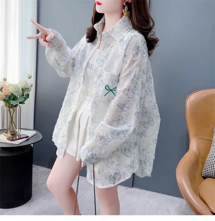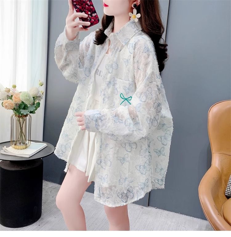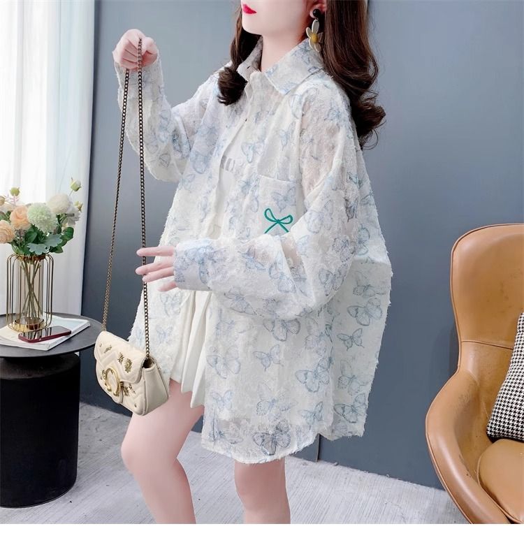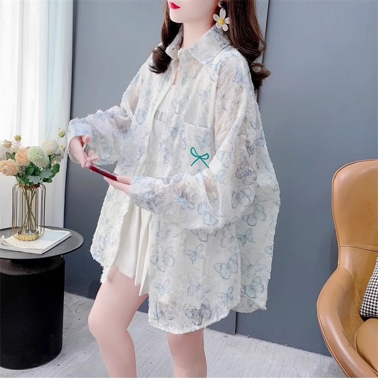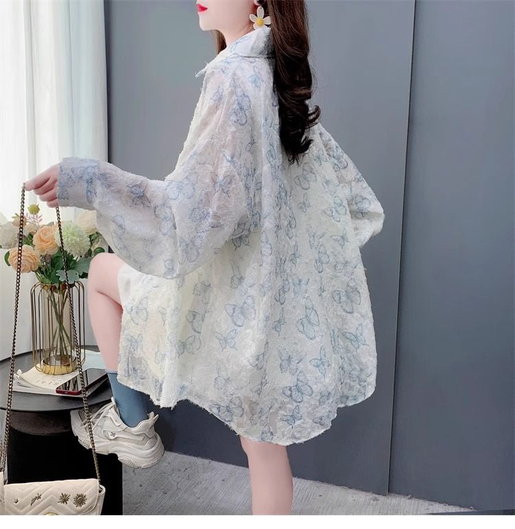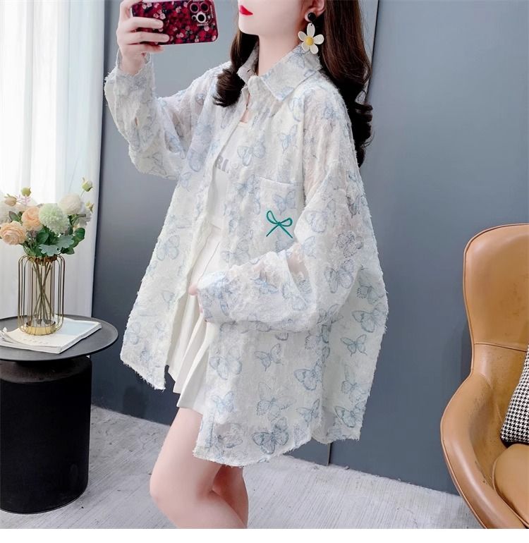 100% 폴리에스터 버터플라이 프린트 얇은 자외선 차단 셔츠 여성용 여름 루즈 미드 길이 셔츠