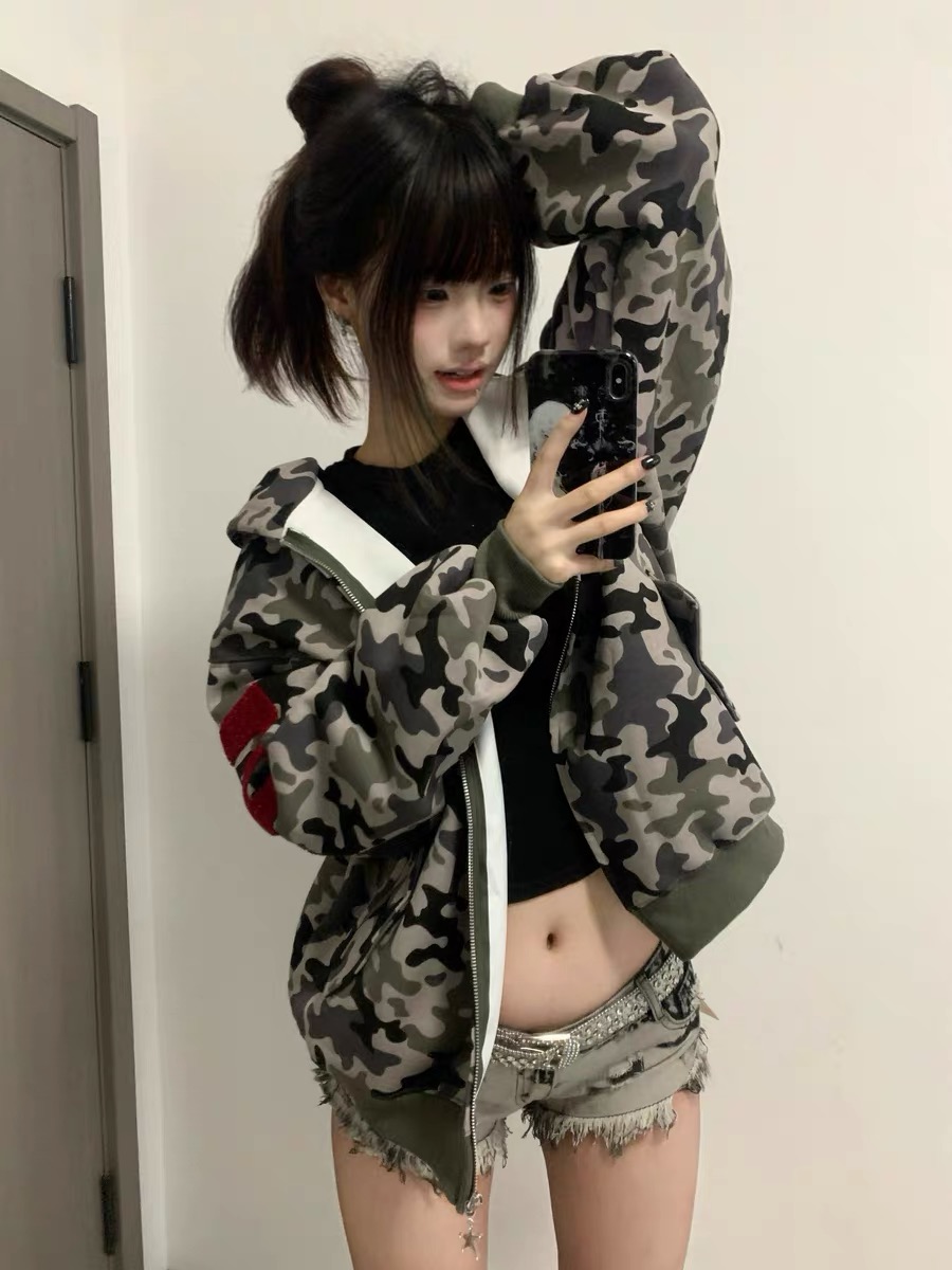 자수 카무플라주 2025 지퍼 후드 스웨트셔츠 가디건 (남녀 공용, 봄/가을 커플 후드 재킷 탑)