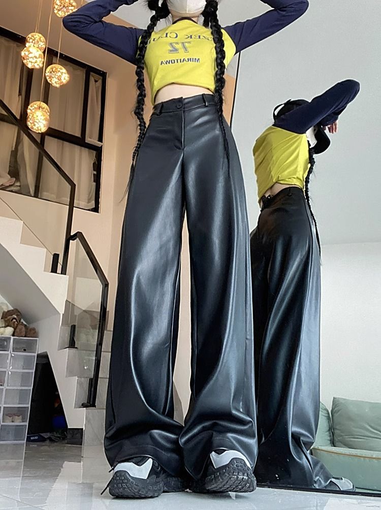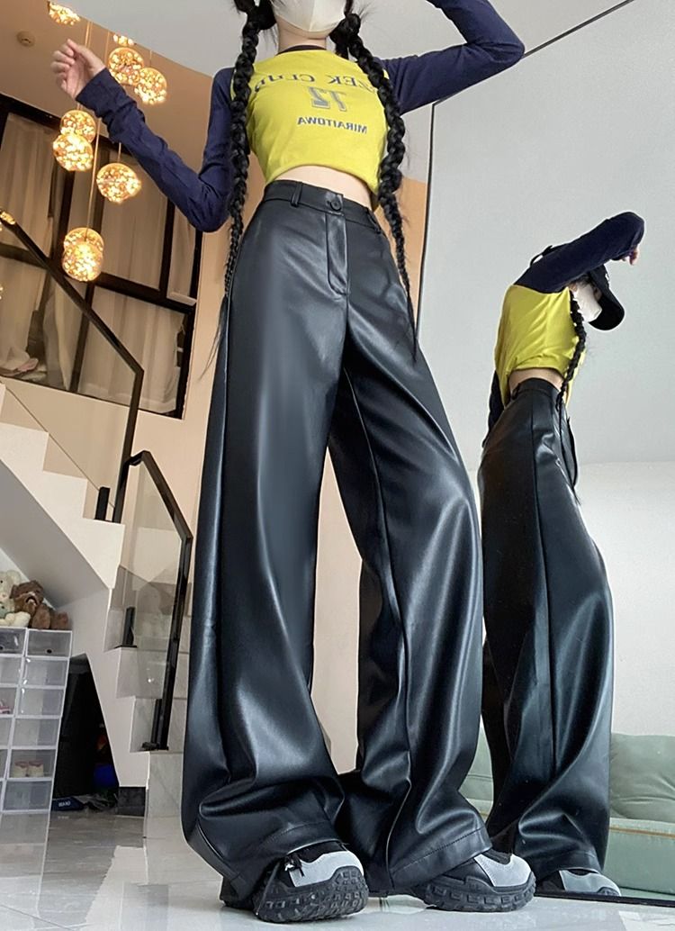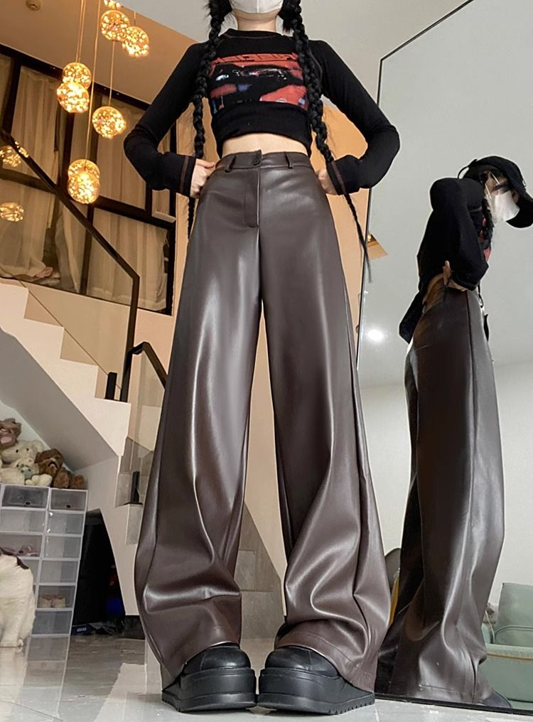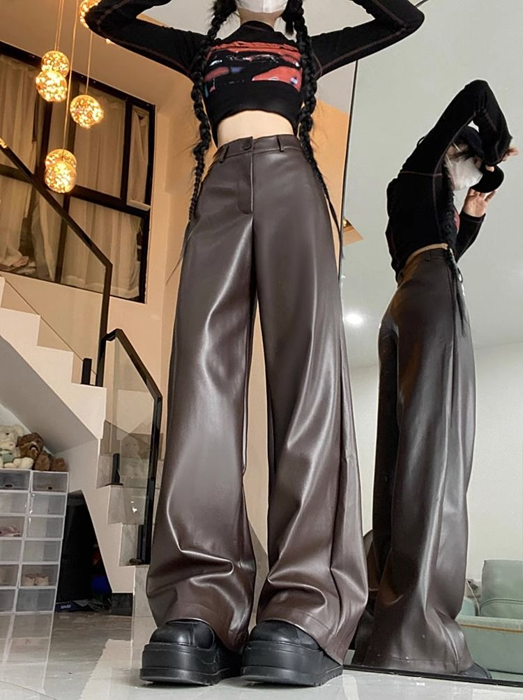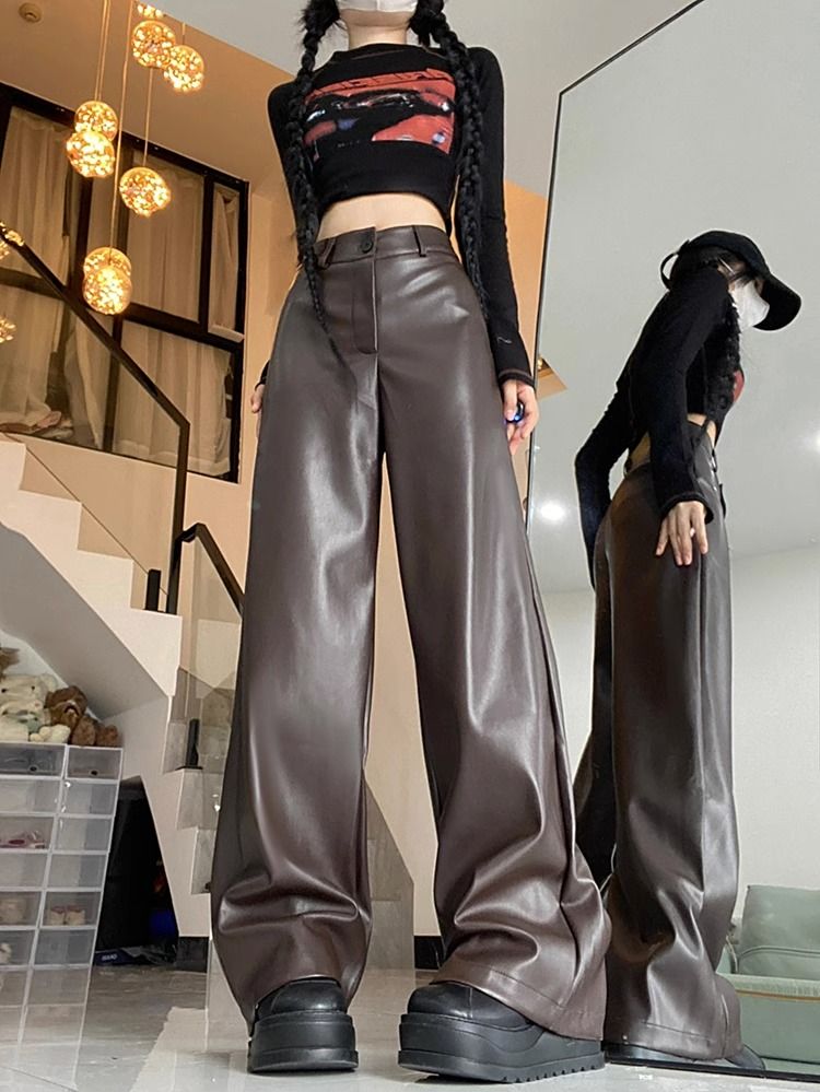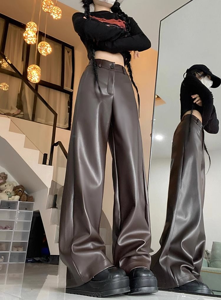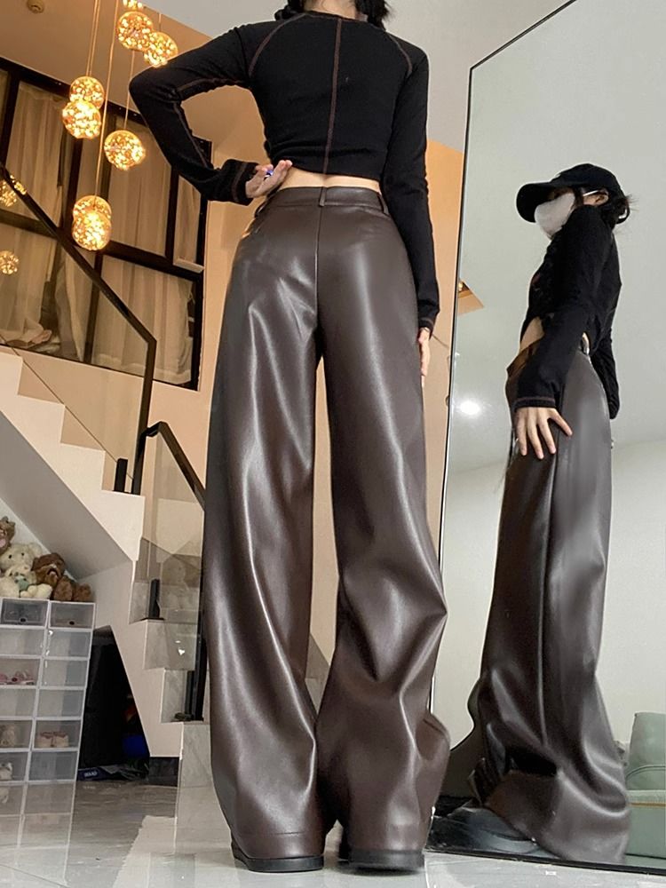 여성용 미국 레트로 스타일의 고급 PU 가죽 캐주얼 팬츠, 가을/겨울용, 하이웨이스트, 슬림핏, 와이드 레그, 바닥까지 내려오는 길이, 트렌디한 디자인.