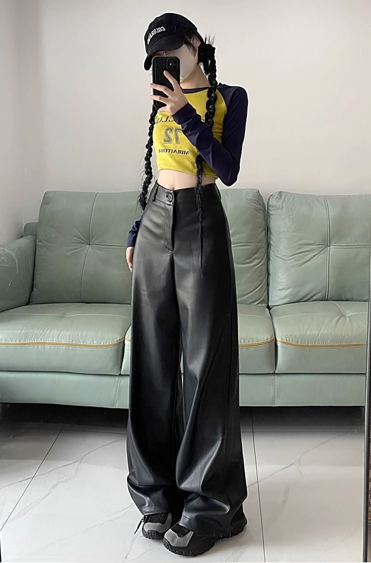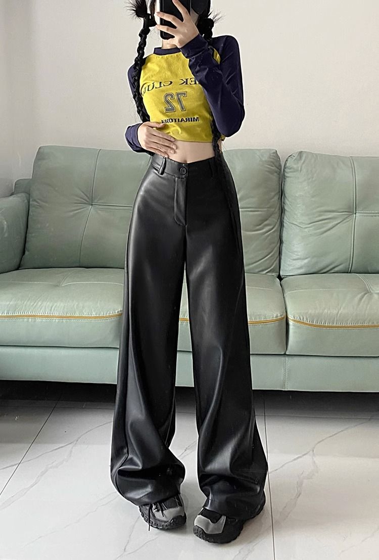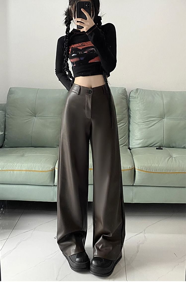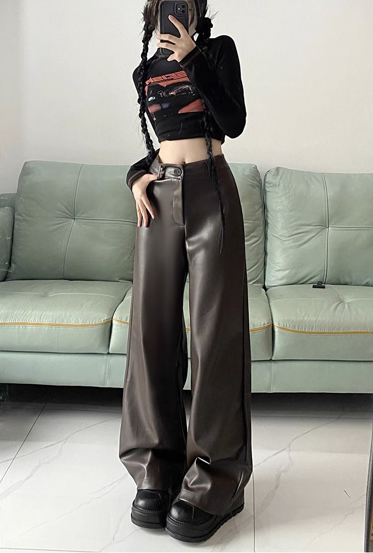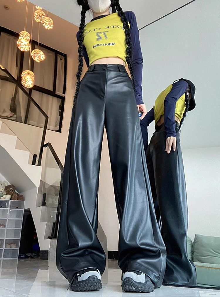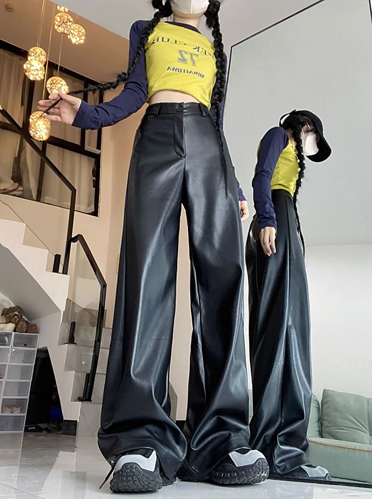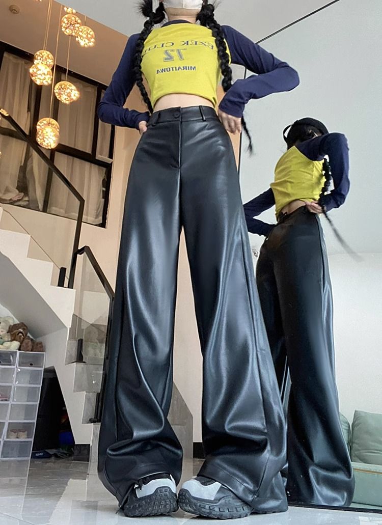 여성용 미국 레트로 스타일의 고급 PU 가죽 캐주얼 팬츠, 가을/겨울용, 하이웨이스트, 슬림핏, 와이드 레그, 바닥까지 내려오는 길이, 트렌디한 디자인.