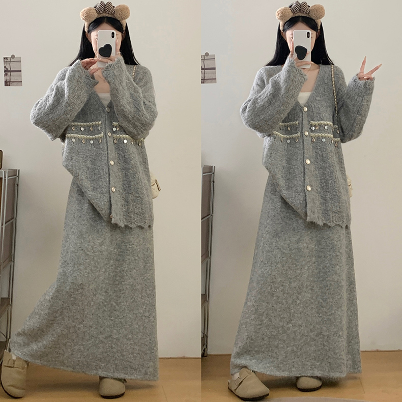 플러스 사이즈의, 세련되고 편안한 V넥 스팽글 그레이 스웨터 카디건 + 스커트 세트의 실제 사진입니다.