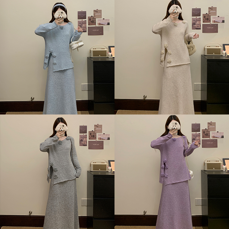 플러스 사이즈 프랑스 루즈핏의 편안한 스타일, 입체적인 꽃무늬 슬릿 풀오버 니트 스웨터와 스커트 세트의 실제 사진입니다.