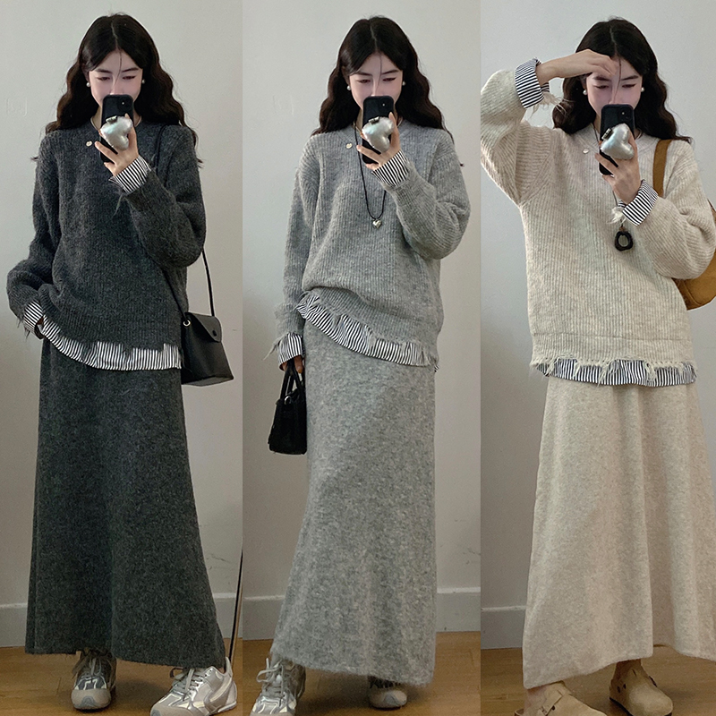 플러스 사이즈 겨울 캐주얼 워싱 패치워크 스웨터 (루즈핏, 슬림핏, 몸매 보정 효과) 실착 사진입니다. 스커트 세트도 포함되어 있으며, 출퇴근용으로도 적합합니다.