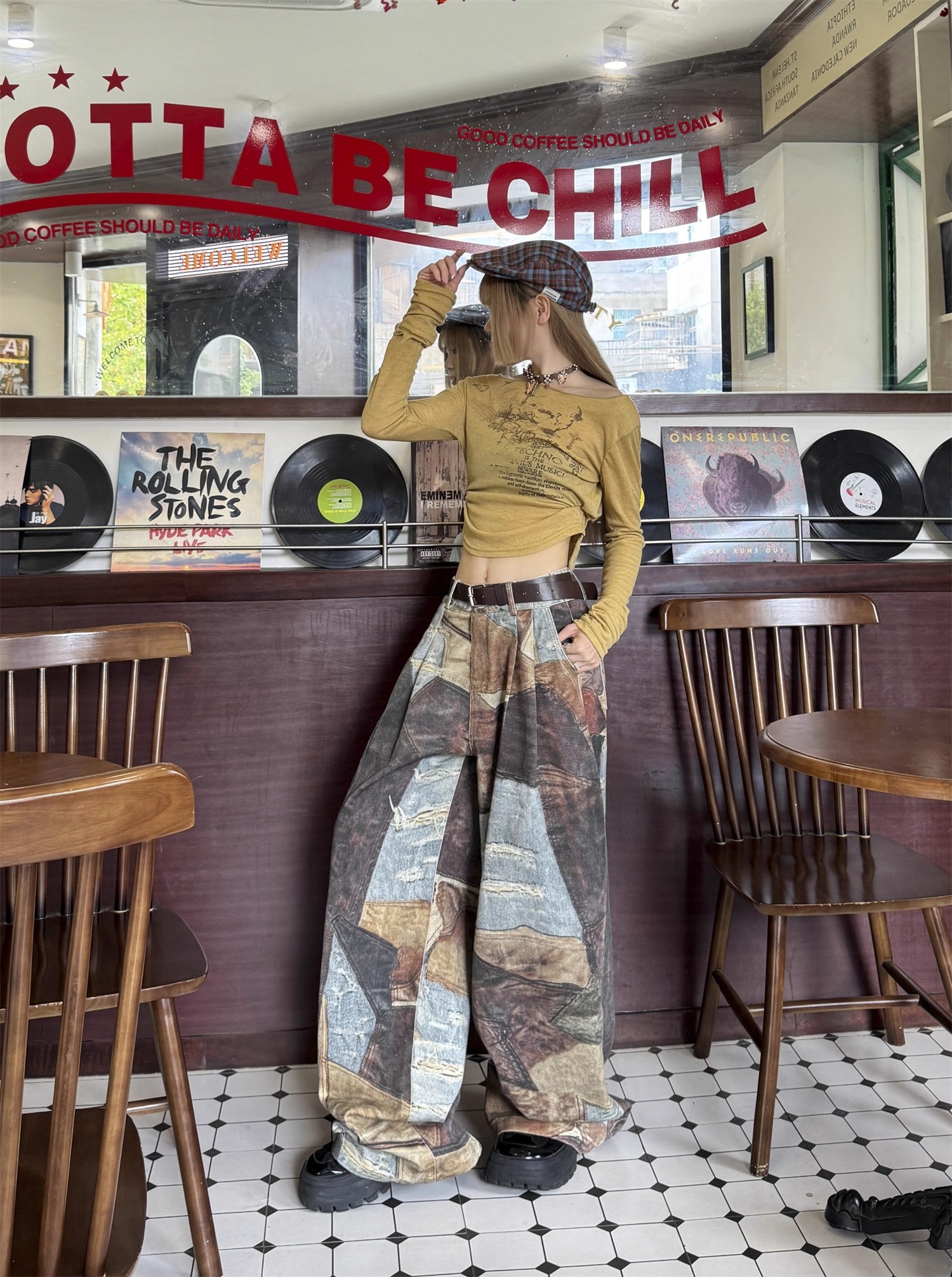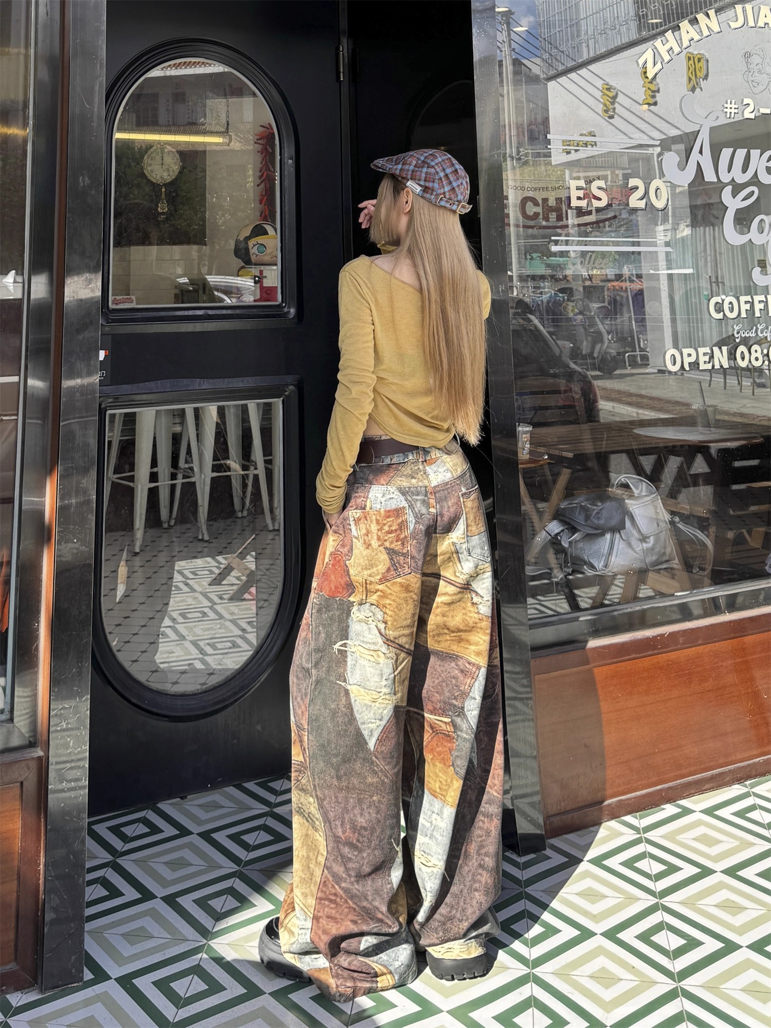 여성용 노르딕풍 빈티지 프린트 와이드 데님 청바지. 빈티지하면서도 스타일리시한 디자인으로 봄과 가을에 딱 맞습니다. 로우웨이스트 디자인입니다.
