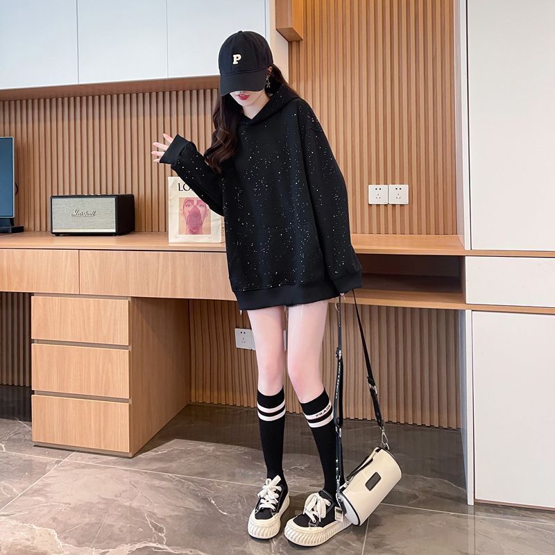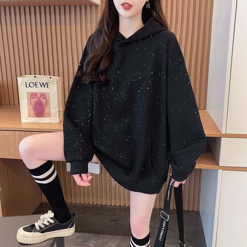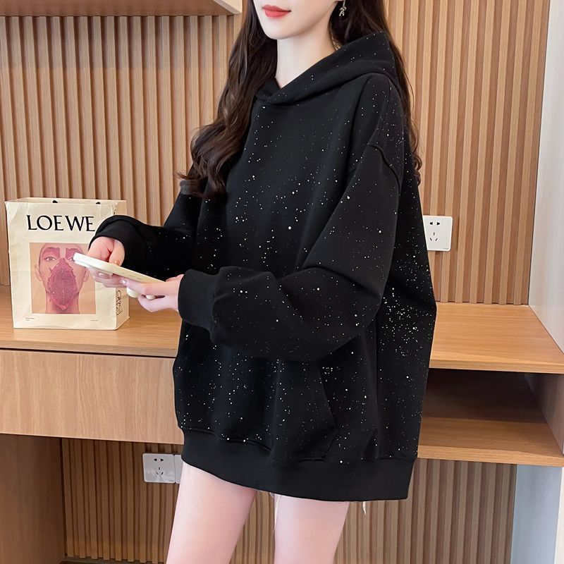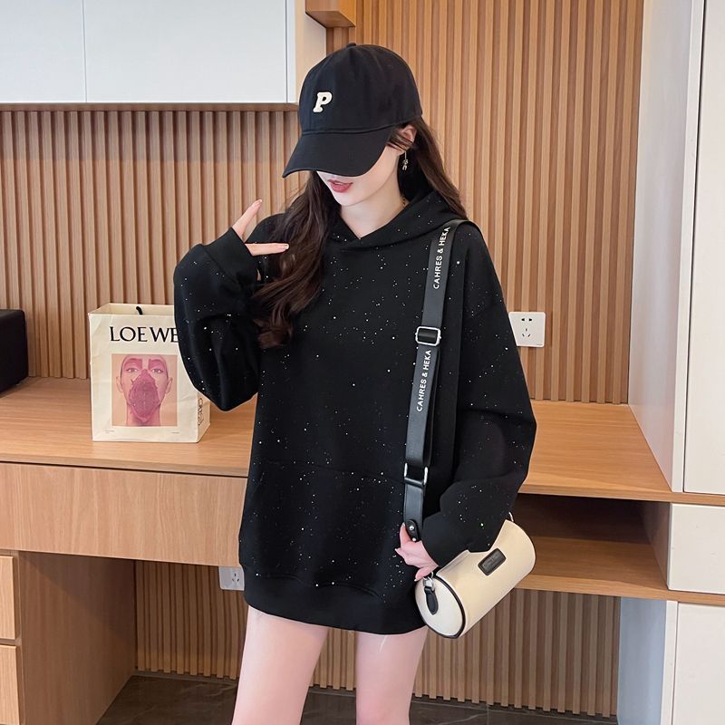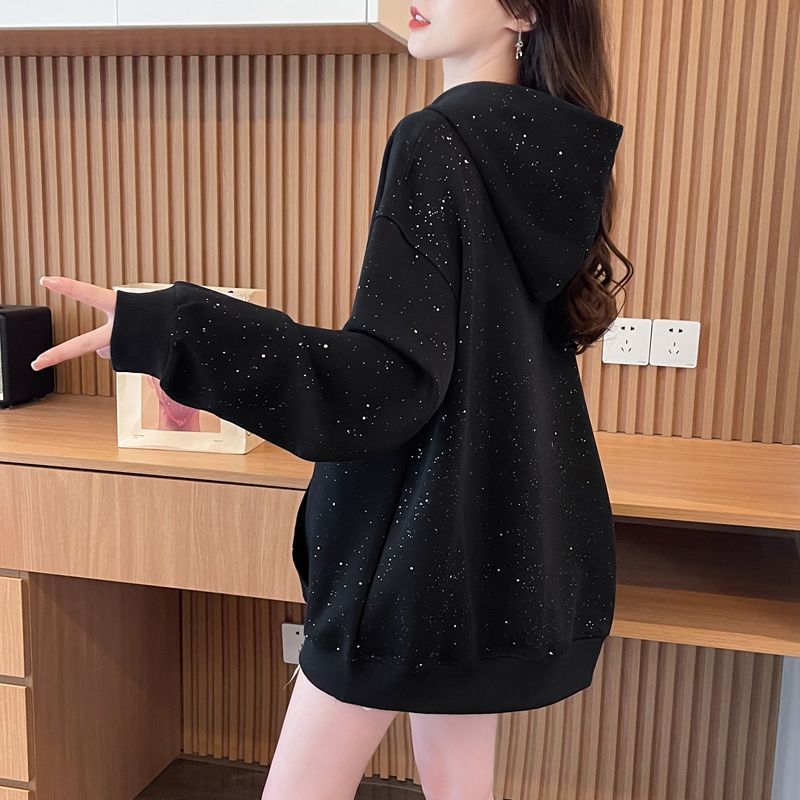모조 코튼과 밀크 실크로 만든 얇고 반짝이는 후드 스웨트셔츠/오버코트의 실제 사진으로, 플러스 사이즈에 적합합니다.