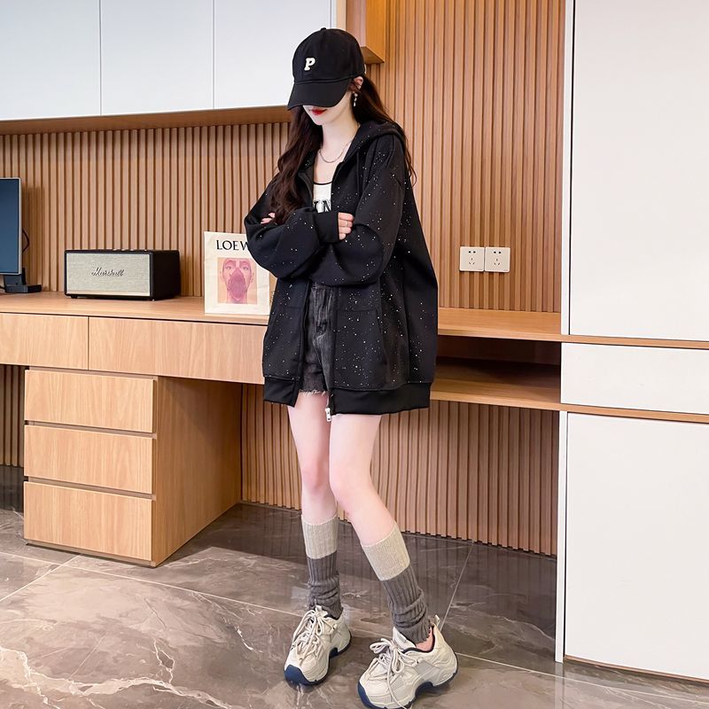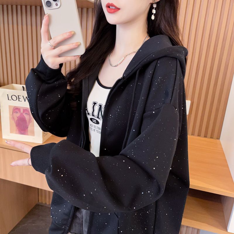 实拍仿华棉复牛奶丝薄款亮闪闪拉链卫衣女大码外套