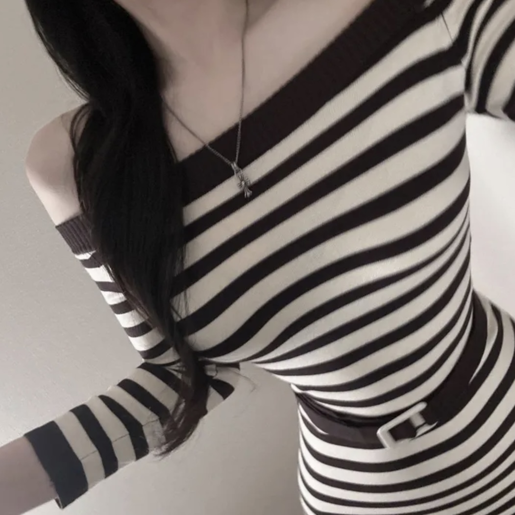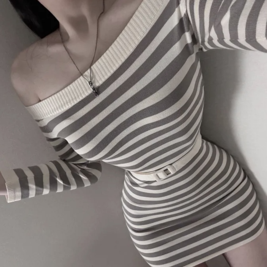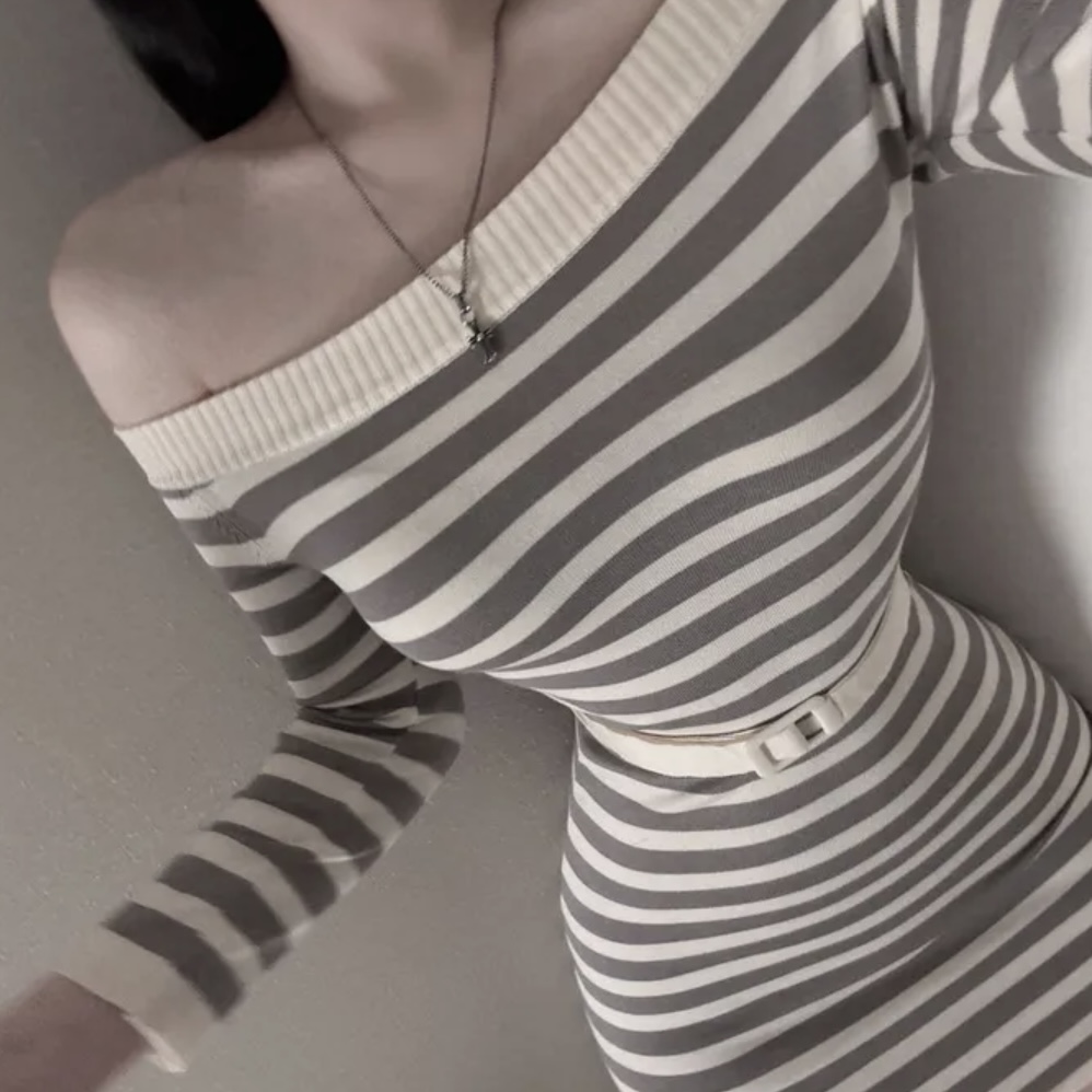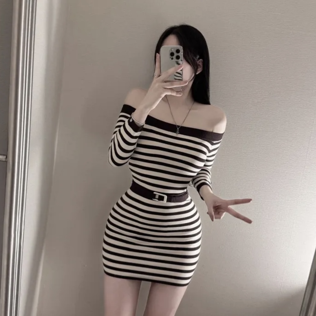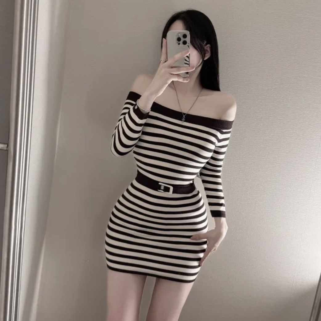 배송 완료! 한국풍의 오프숄더 컬러블록 스트라이프 드레스에 벨트를 매치하면 날씬해 보이는 효과가 있어요.
