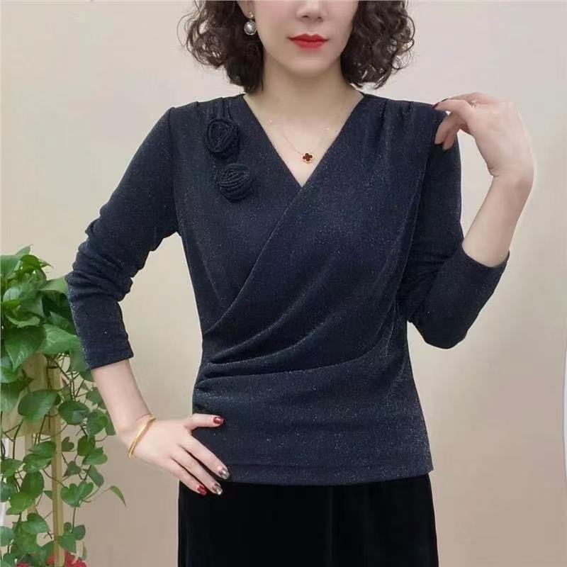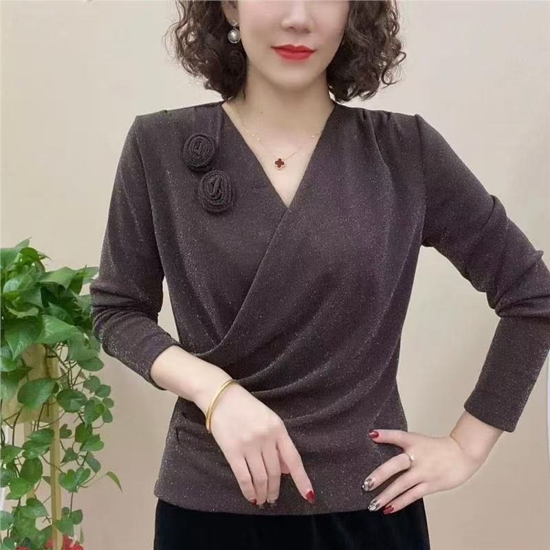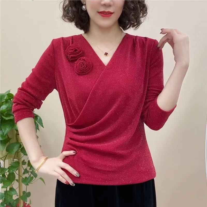 재고 있음 2025년 가을/겨울 신상품 우아한 로즈 V넥 여성용 슬리밍 긴팔 상의, 세련되고 다재다능한 베이스 레이어