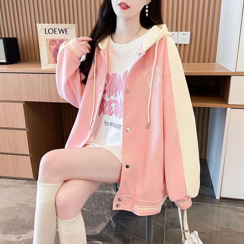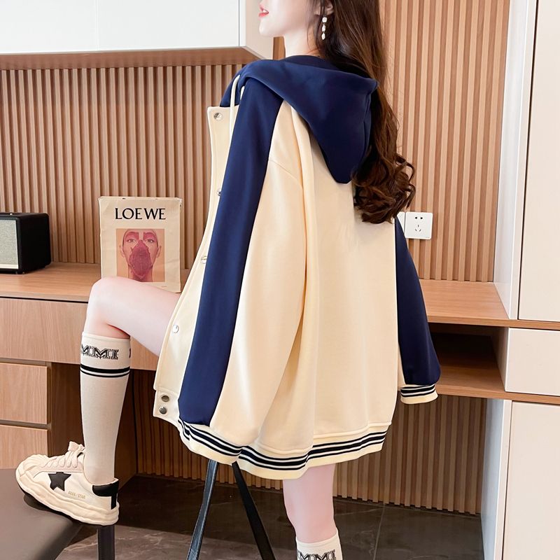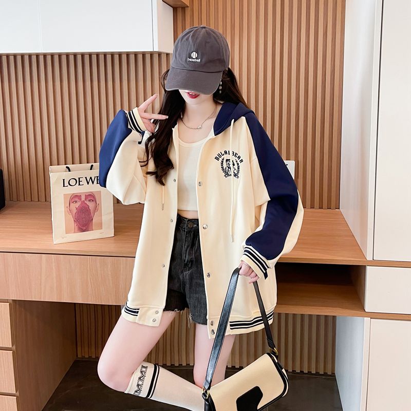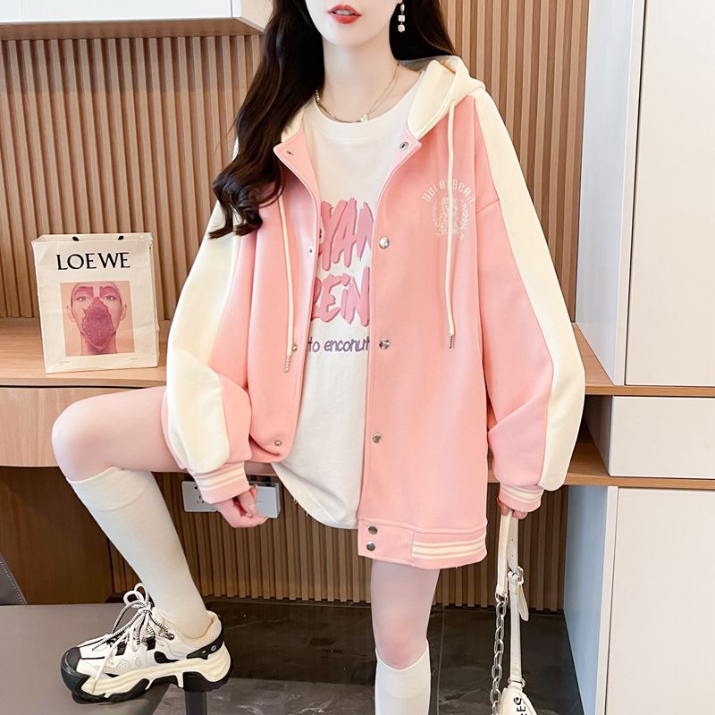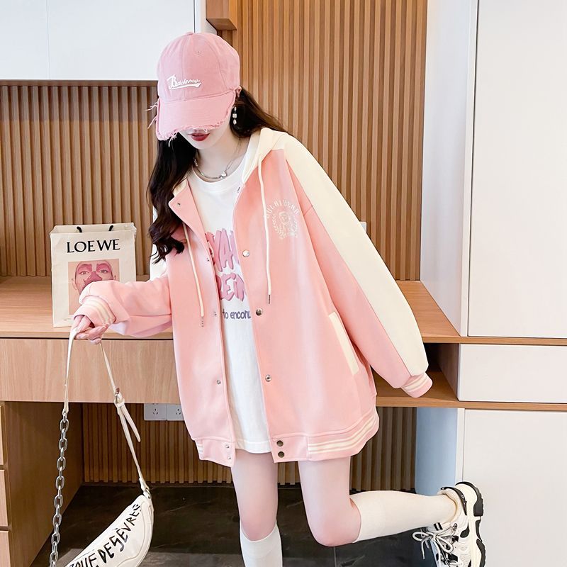 모조 코튼과 밀크 실크로 만든 여성용 플러스 사이즈 야구 재킷/후드티의 실제 사진입니다. 봄/가을에 입기 좋은 두 조각으로 스타일링했습니다.