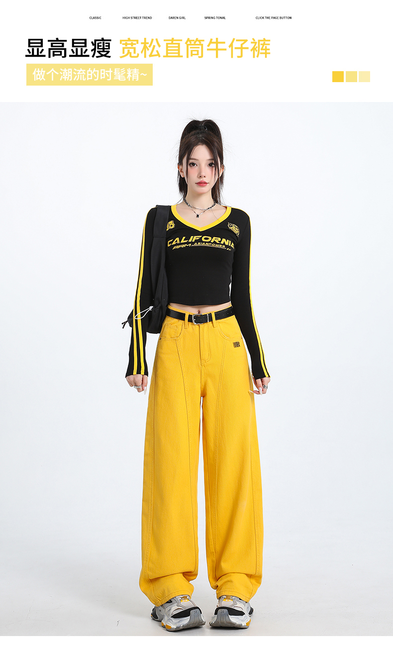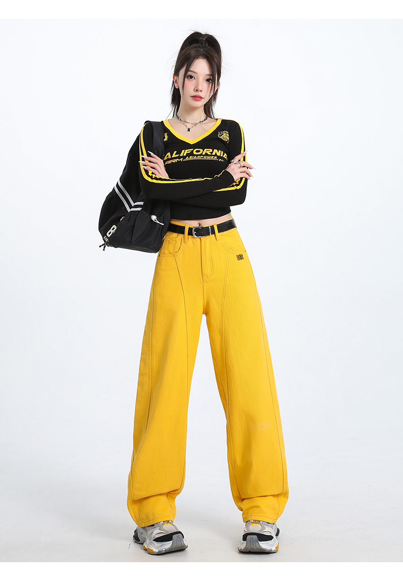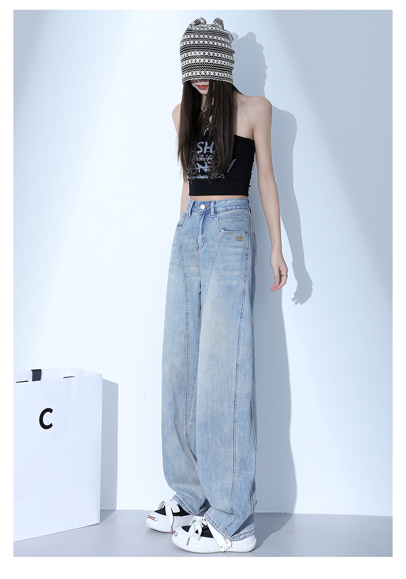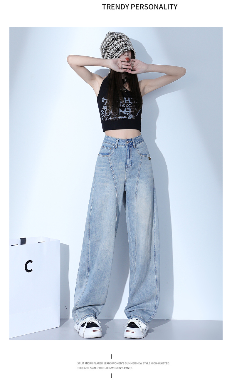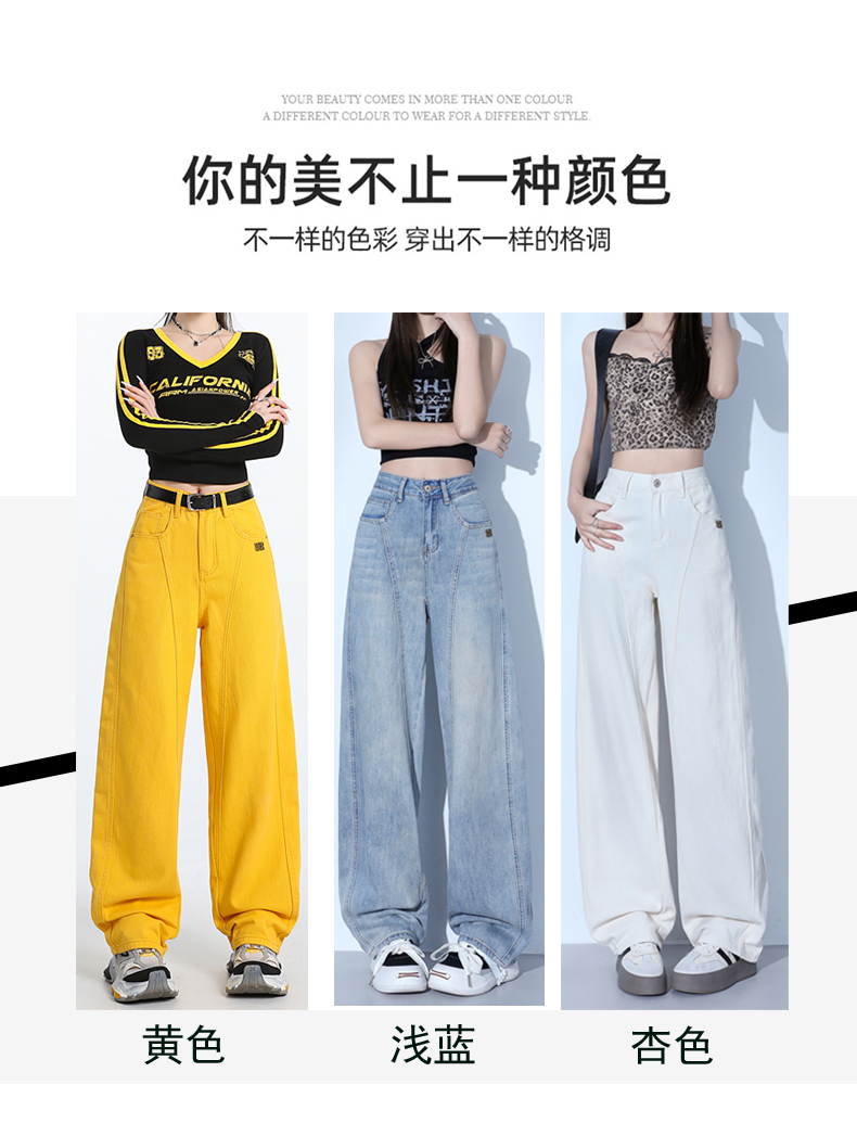 낫 모양의 와이드 레그 진, 루즈핏, 핏이 예쁘고, 바닥까지 내려오는 길이, 하늘색, 살구색, 노란색, 매우 긴 바지