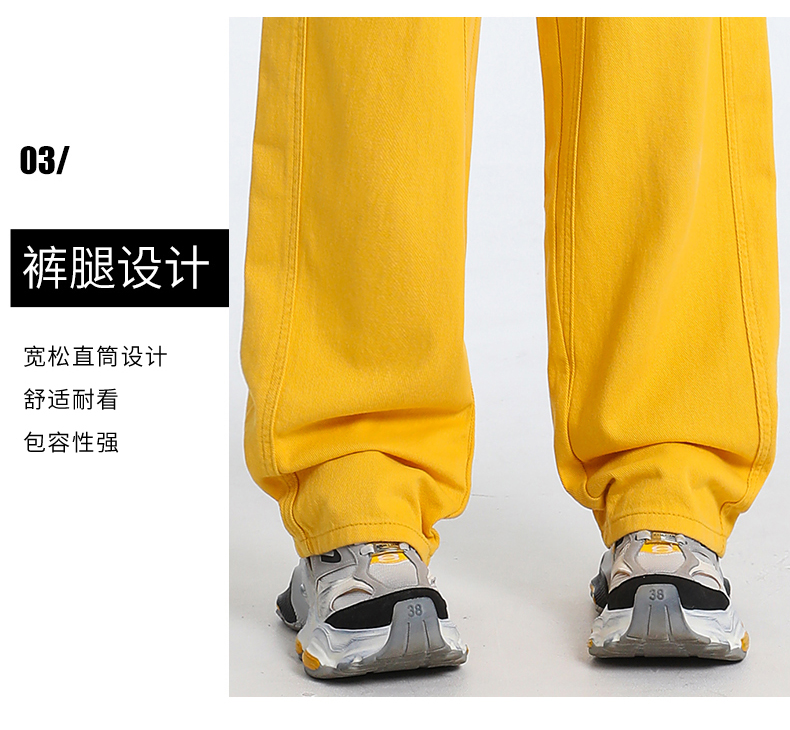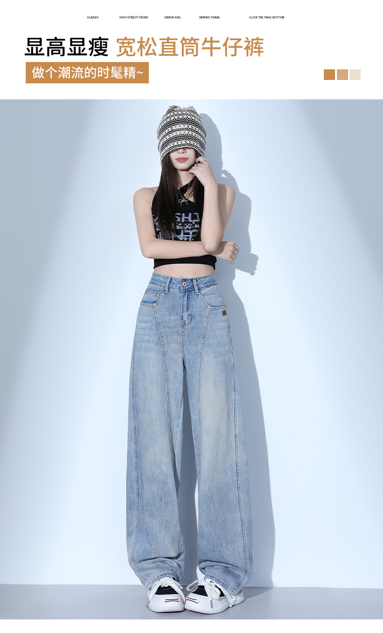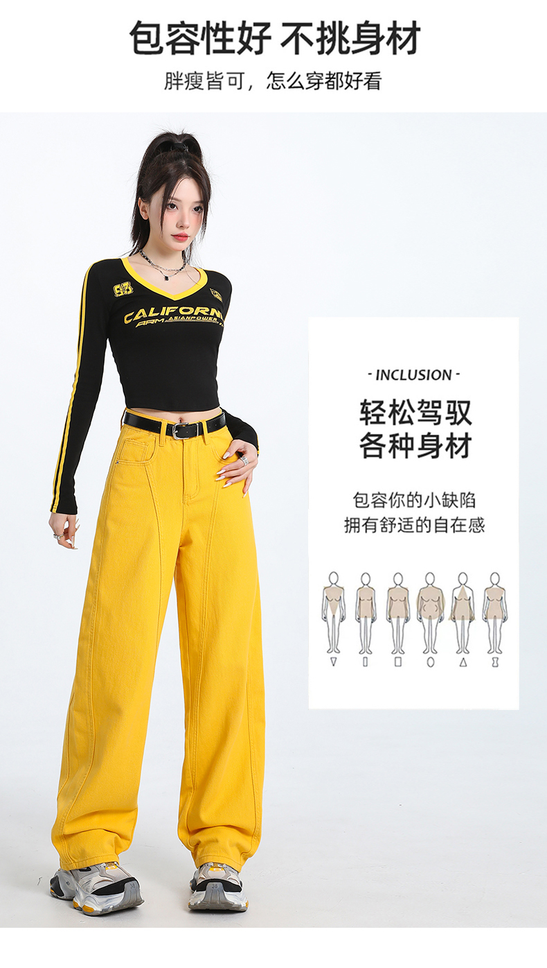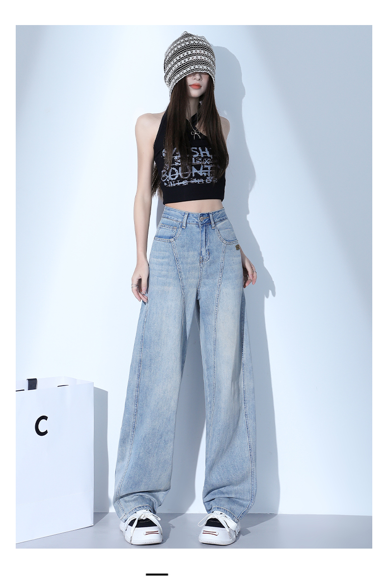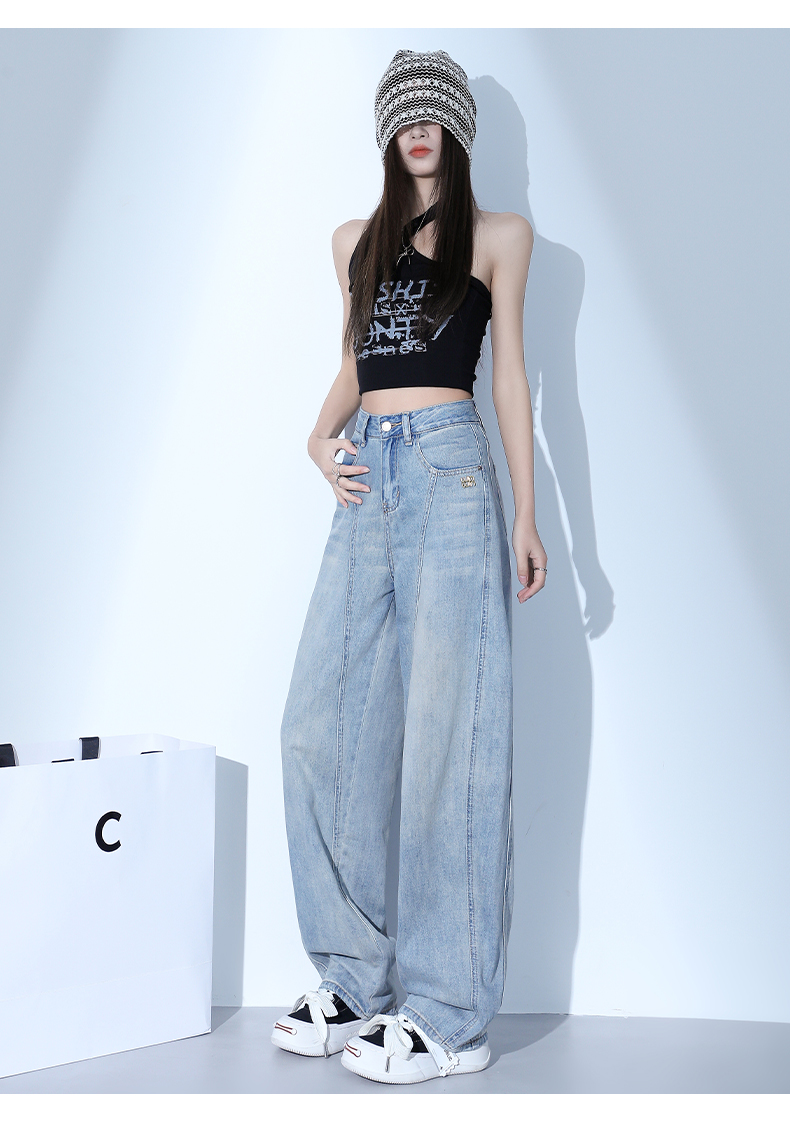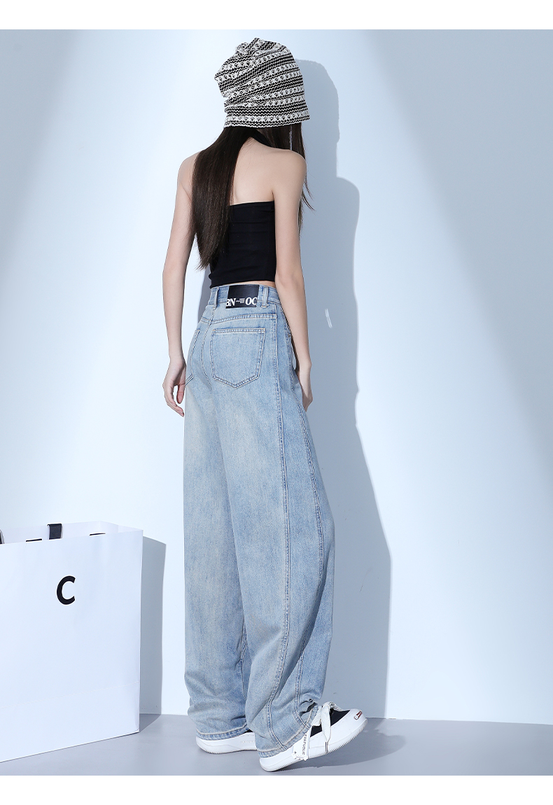 낫 모양의 와이드 레그 진, 루즈핏, 핏이 예쁘고, 바닥까지 내려오는 길이, 하늘색, 살구색, 노란색, 매우 긴 바지