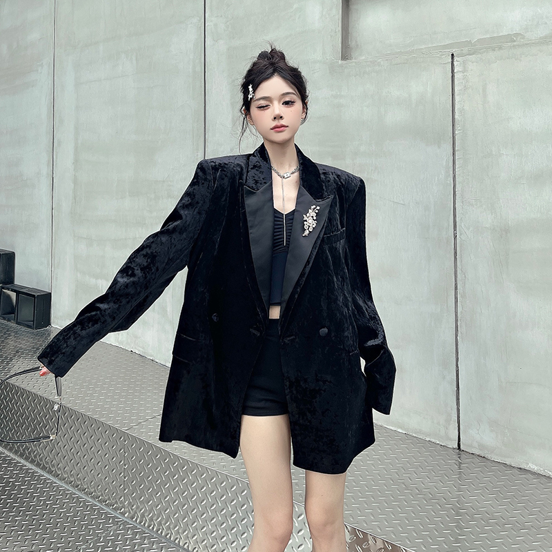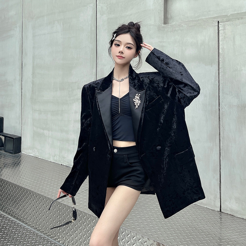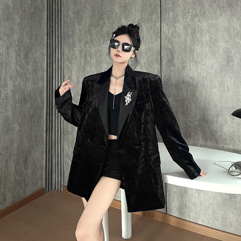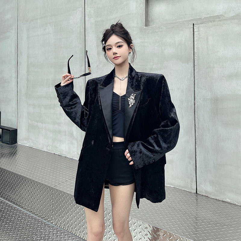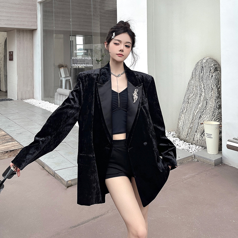 실제 사진, 실제 가격. 여성용 고급 맞춤형 블랙 벨벳 정장, 봄/가을 신상 스타일, 세련되고 품격 있는 패딩 숄더 정장 재킷.