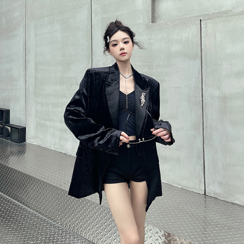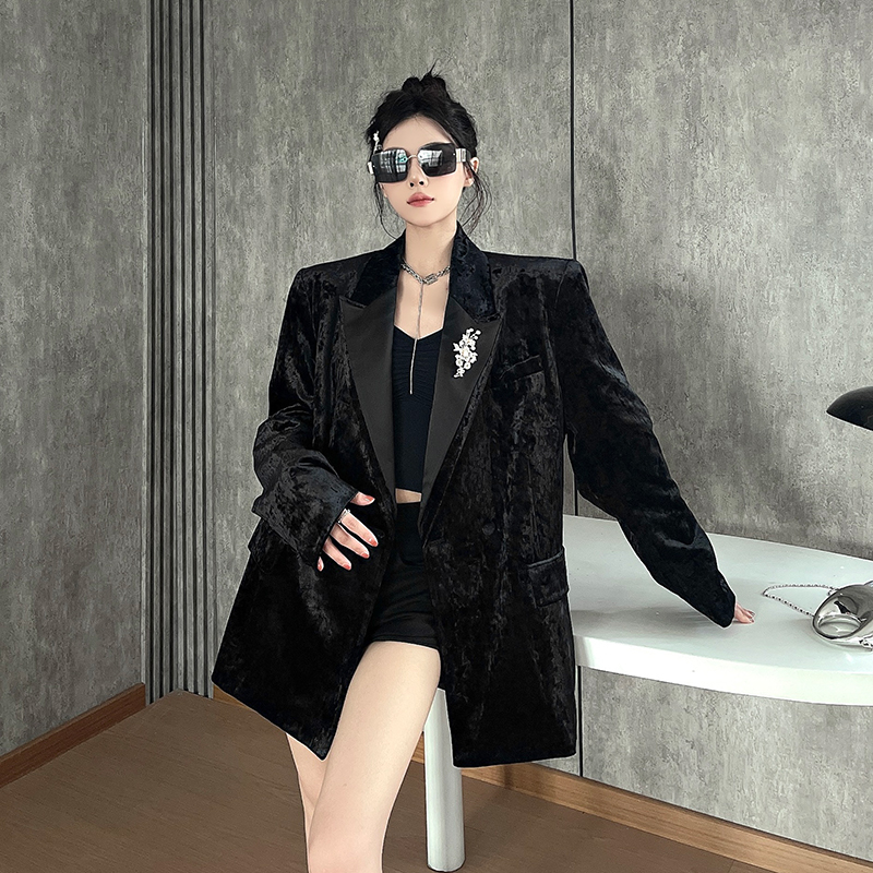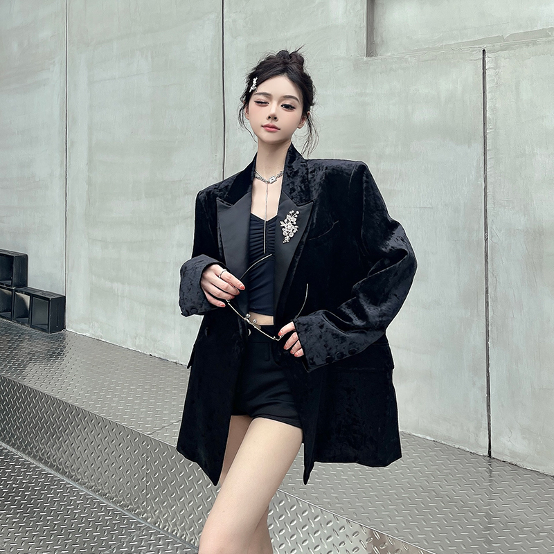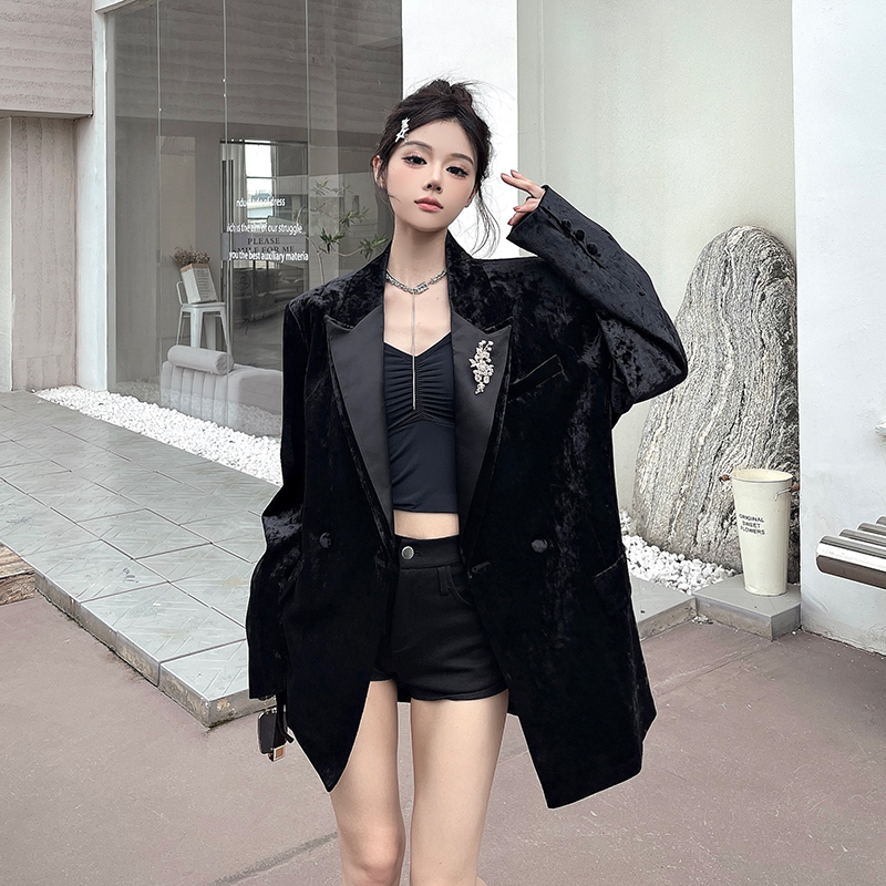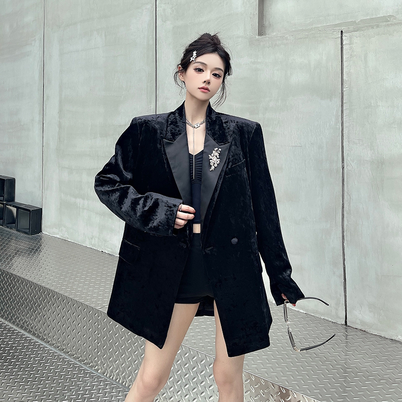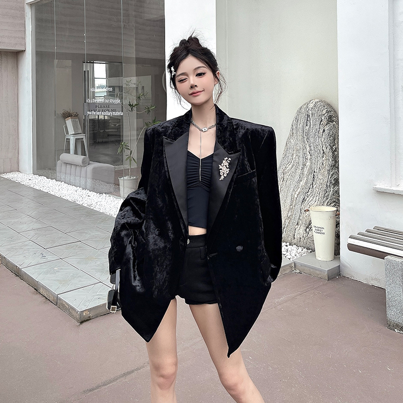 실제 사진, 실제 가격. 여성용 고급 맞춤형 블랙 벨벳 정장, 봄/가을 신상 스타일, 세련되고 품격 있는 패딩 숄더 정장 재킷.