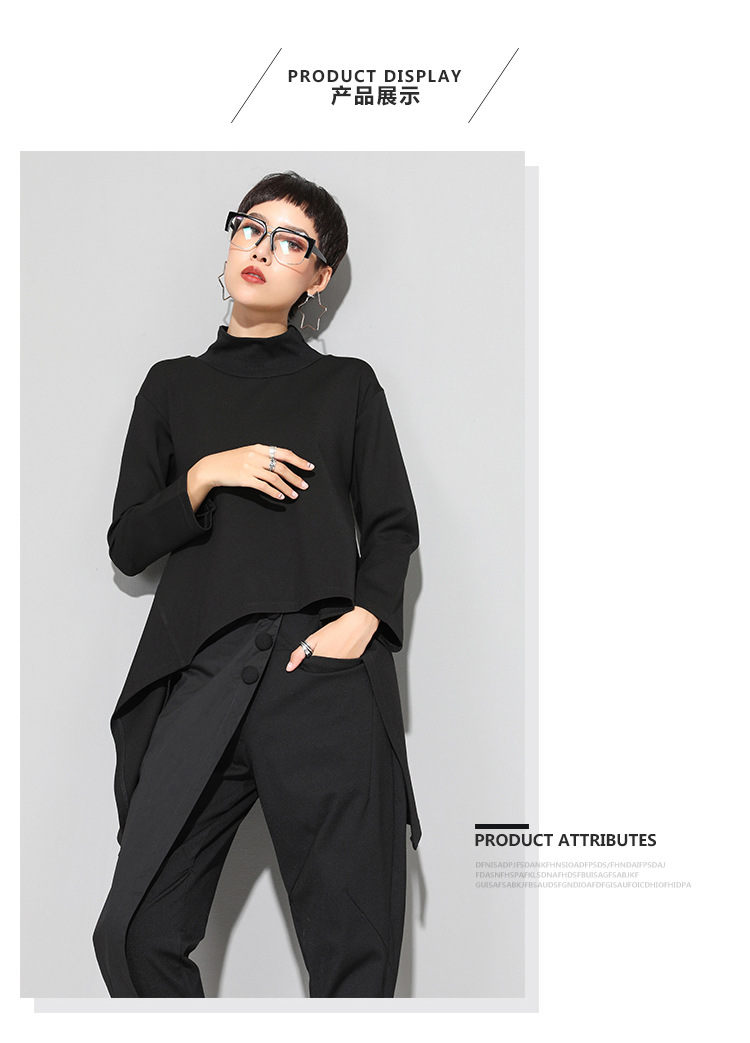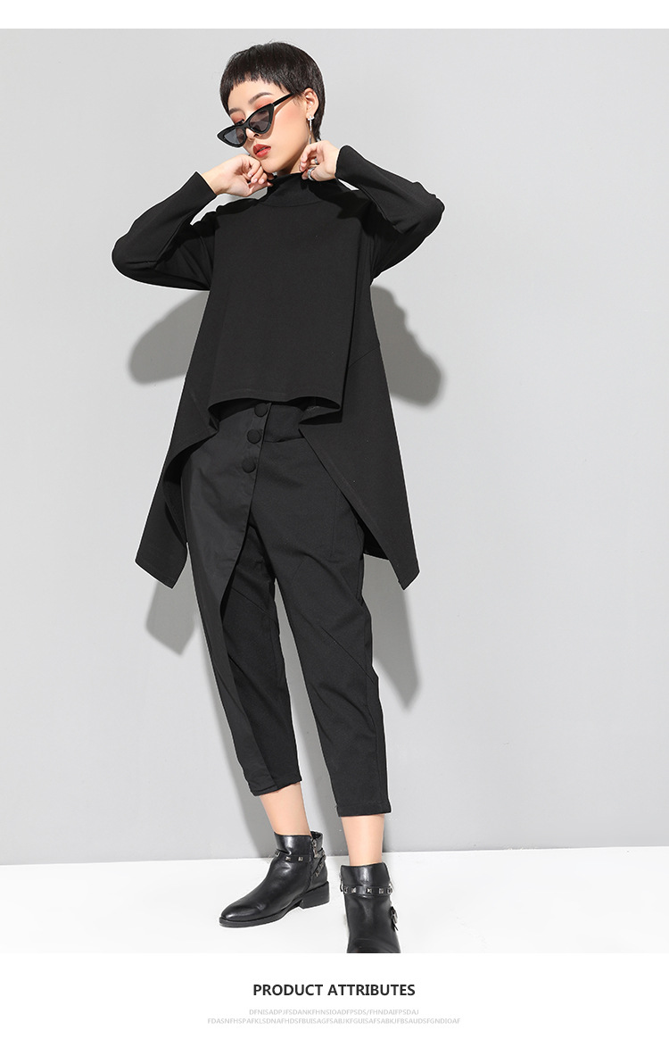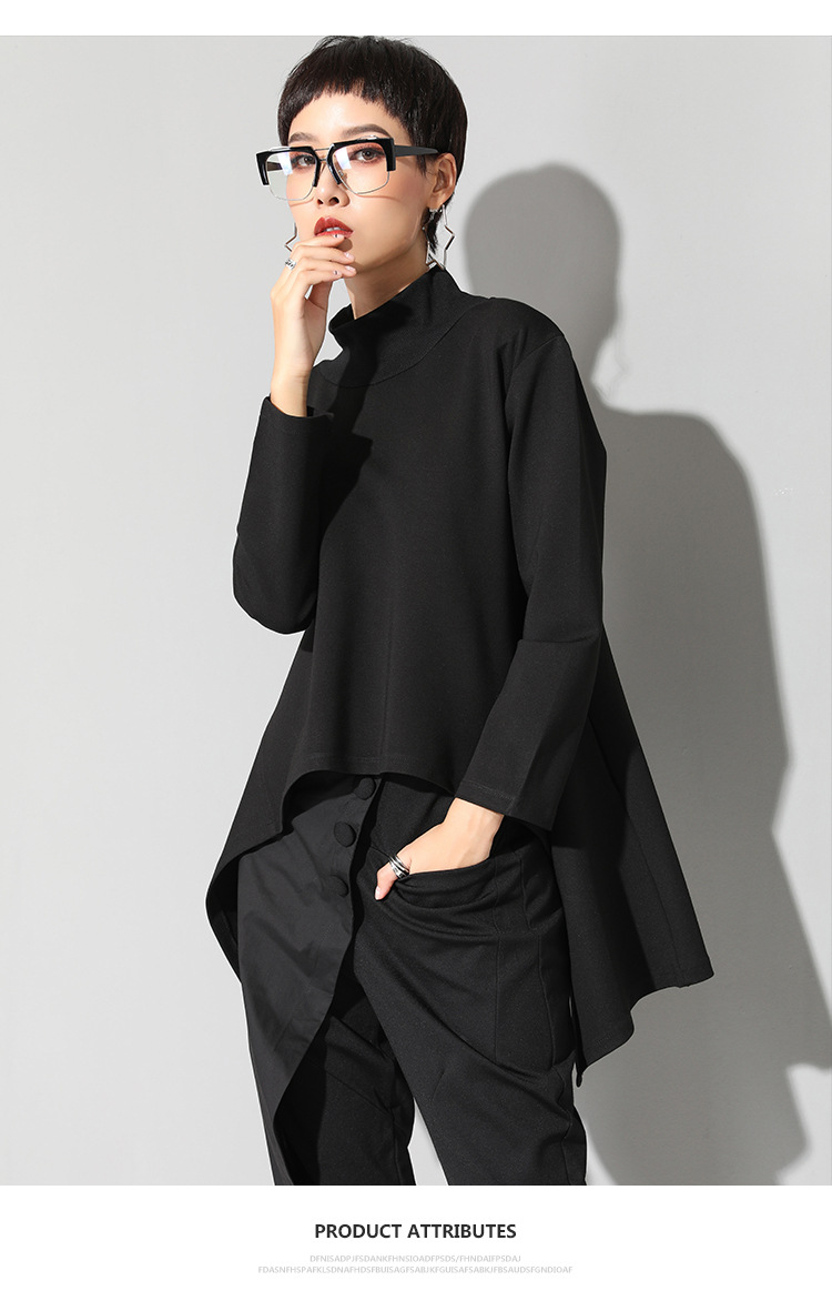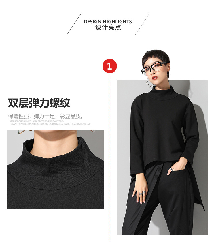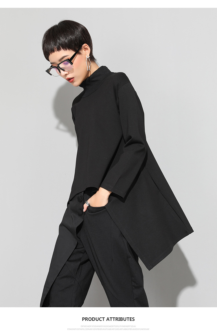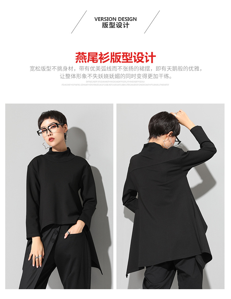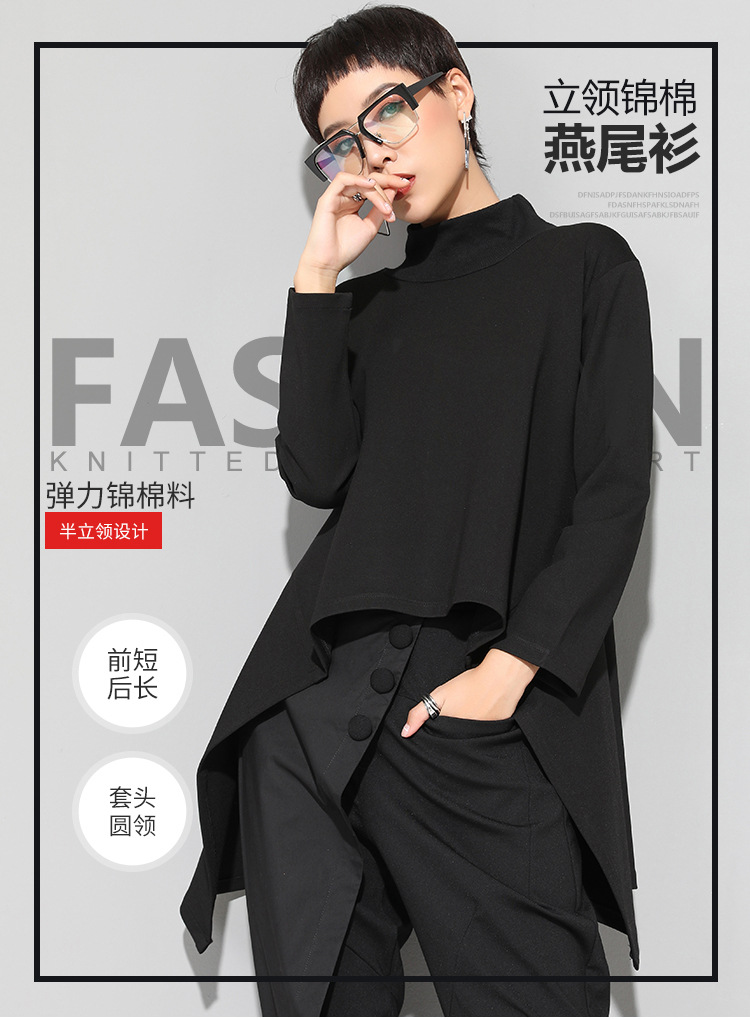 유럽과 미국의 트렌디한 여성용 가을/겨울 신상 베이스 레이어 티셔츠를 실제 촬영한 사진입니다. 활용도가 높고 슬림핏이며, 앞쪽은 짧고 뒤쪽은 긴 디자인입니다.