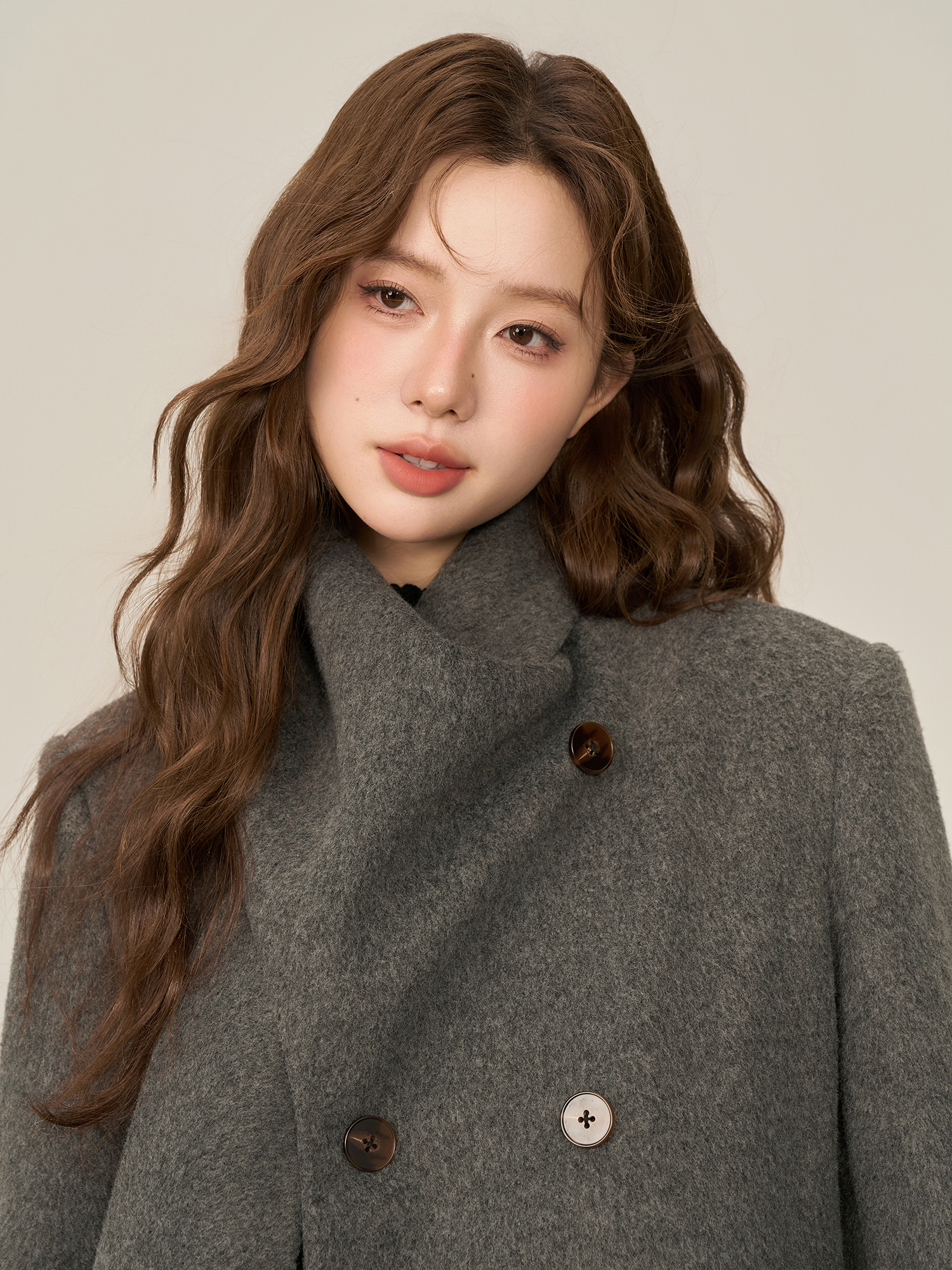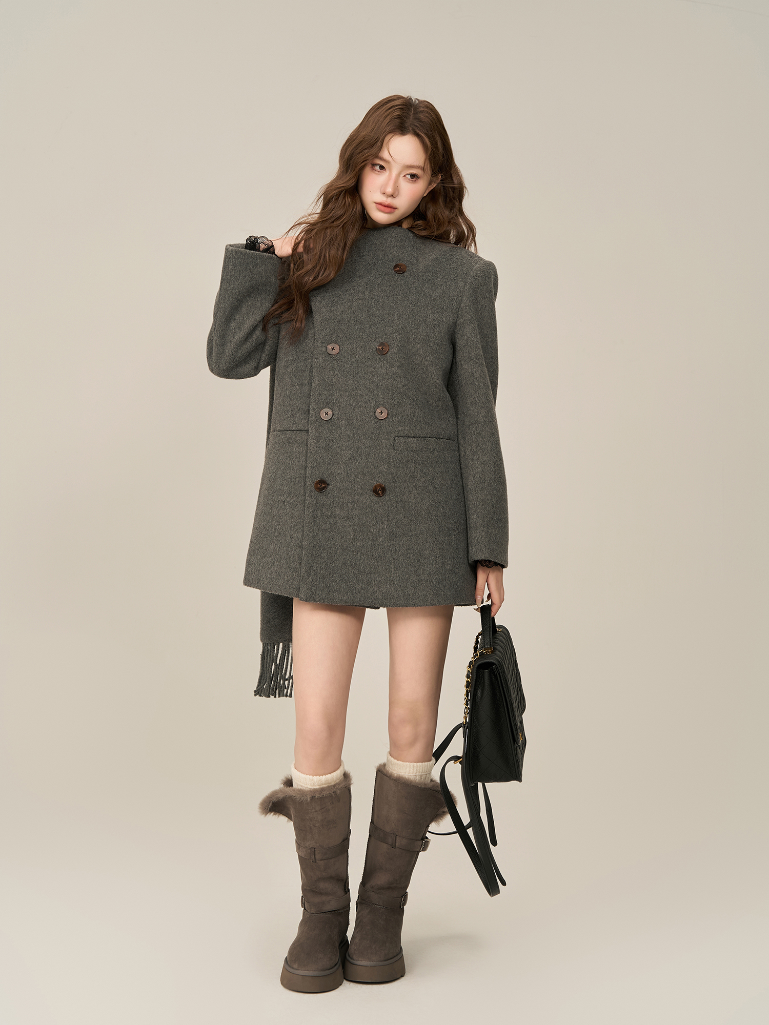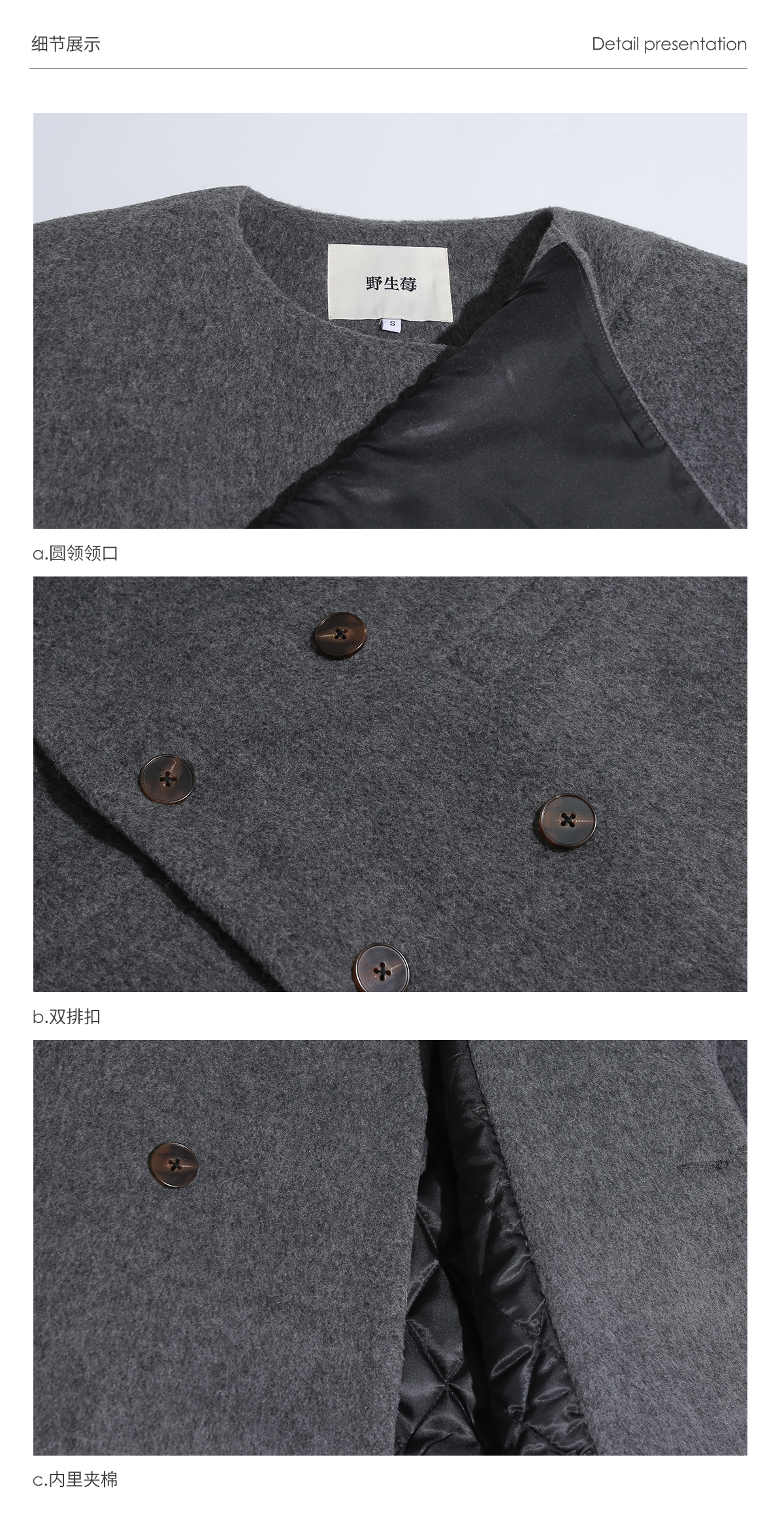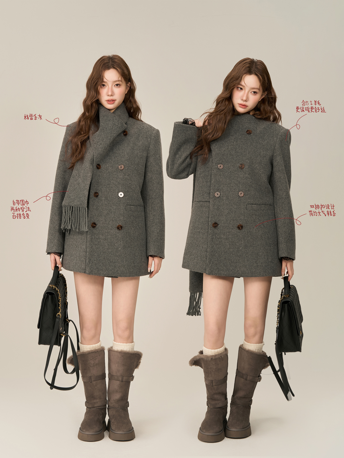 가을과 겨울에 딱 맞는 한국식의 우아한 더블브레스트 중간 길이 울 코트로, 스카프 칼라가 특징이며, 작은 야생 열매 디자인이 특징입니다.