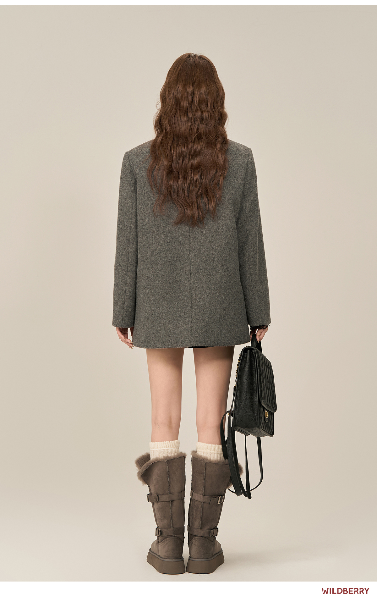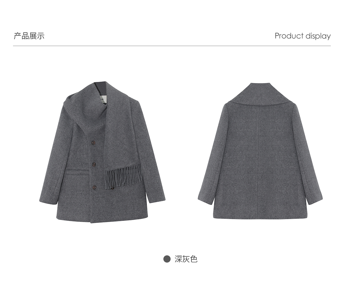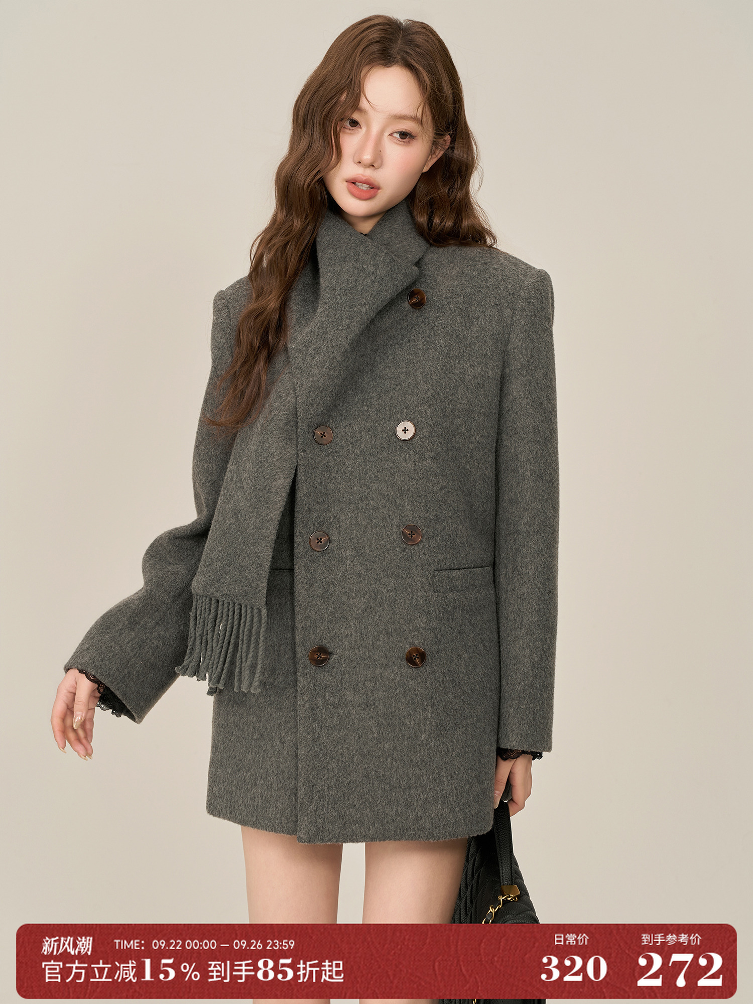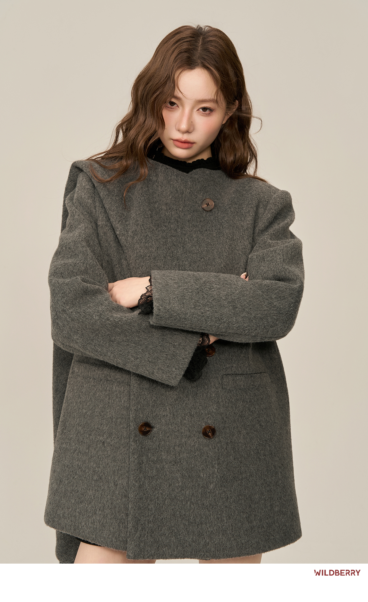 가을과 겨울에 딱 맞는 한국식의 우아한 더블브레스트 중간 길이 울 코트로, 스카프 칼라가 특징이며, 작은 야생 열매 디자인이 특징입니다.