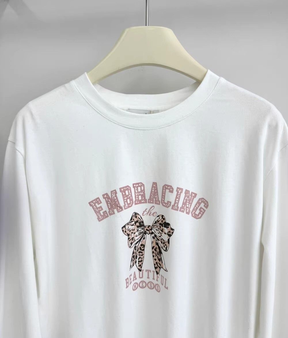 공식 이미지: 21수 순면 - 210g 100% 면, 가을 긴팔 티셔츠, 프린트가 있는 여성용 루즈 탑.