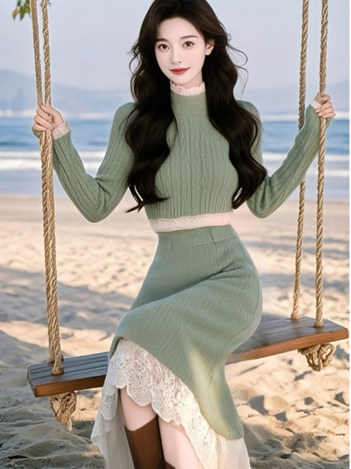 가을과 겨울을 위한 우아하고 독특하고 아름다운 녹색 니트 탑과 스커트의 투피스 세트입니다.