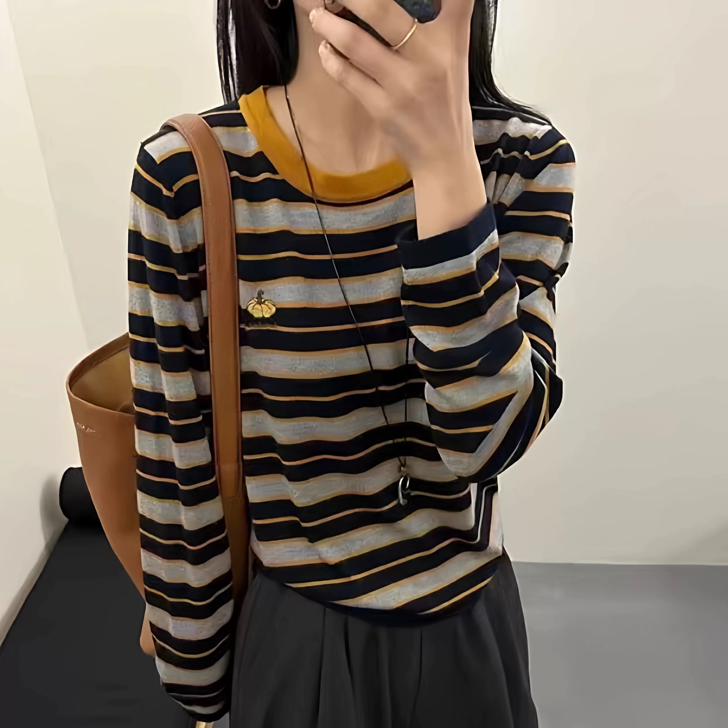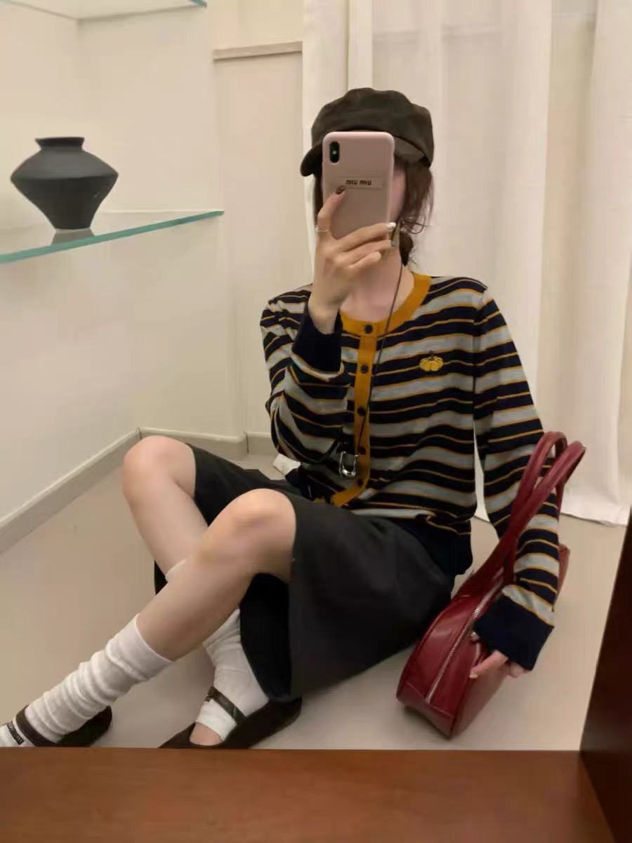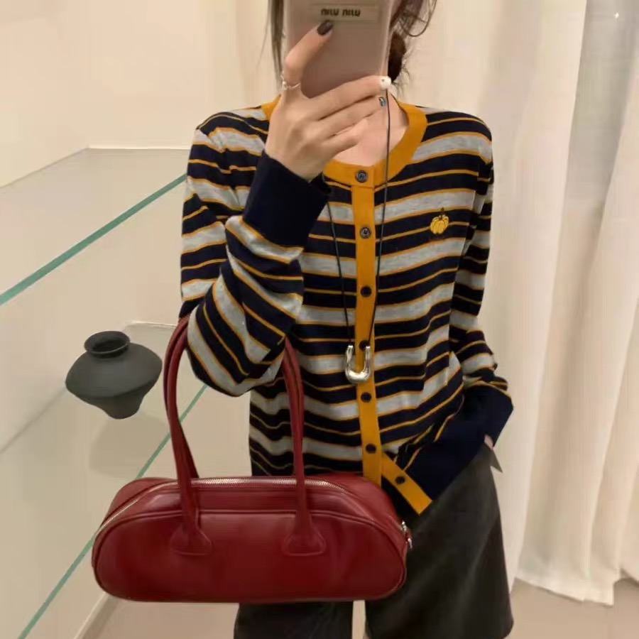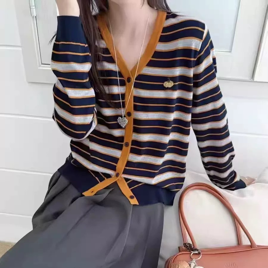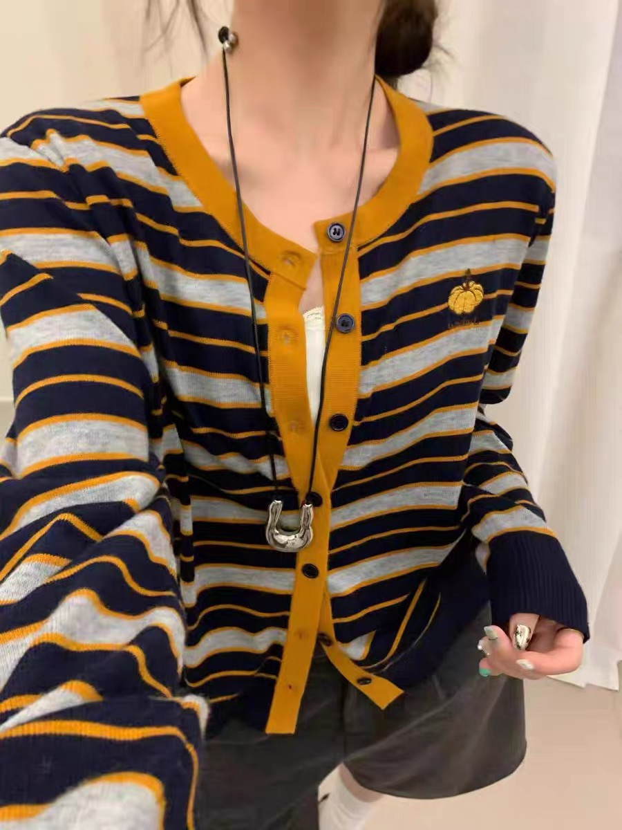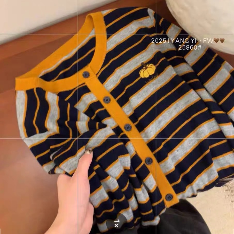 한국 스타일 V넥 긴팔 니트 카디건, 새로운 가을 2025 패션 스타일, 호박 자수 줄무늬 고급 울 여성용 카디건.