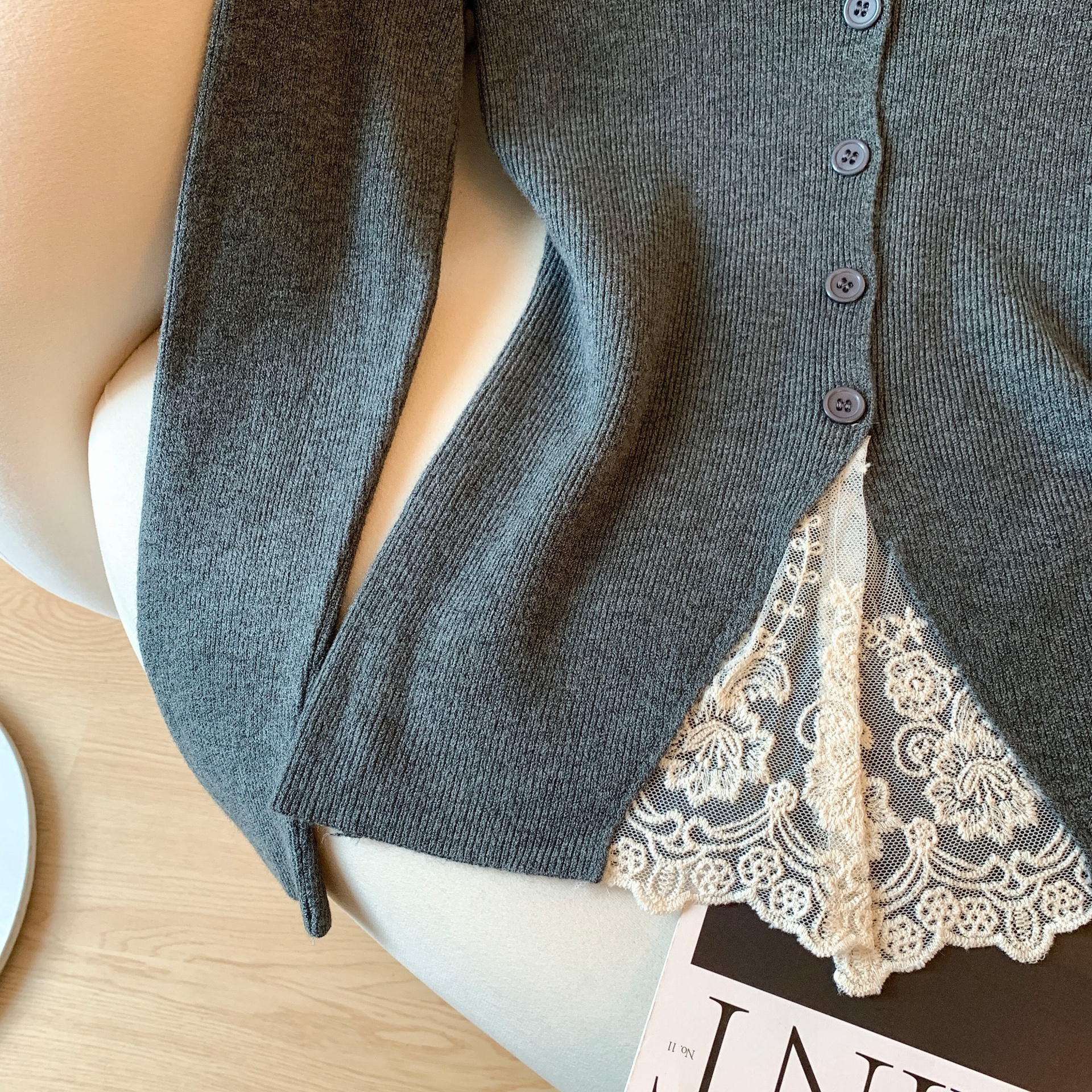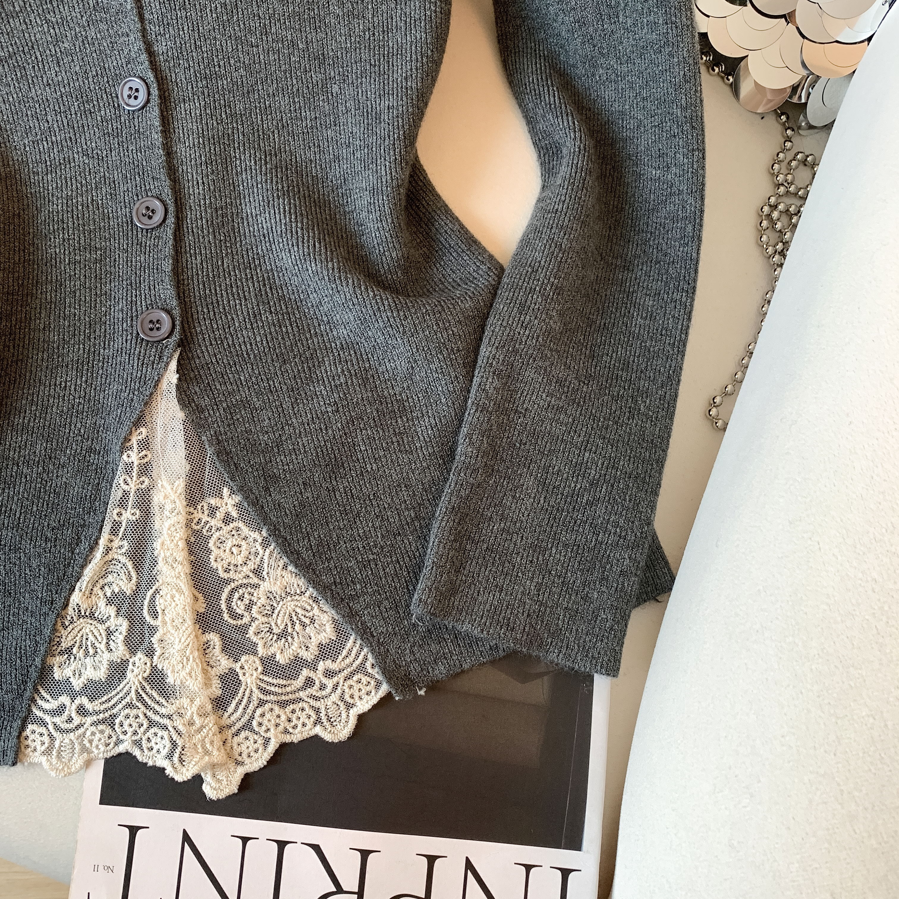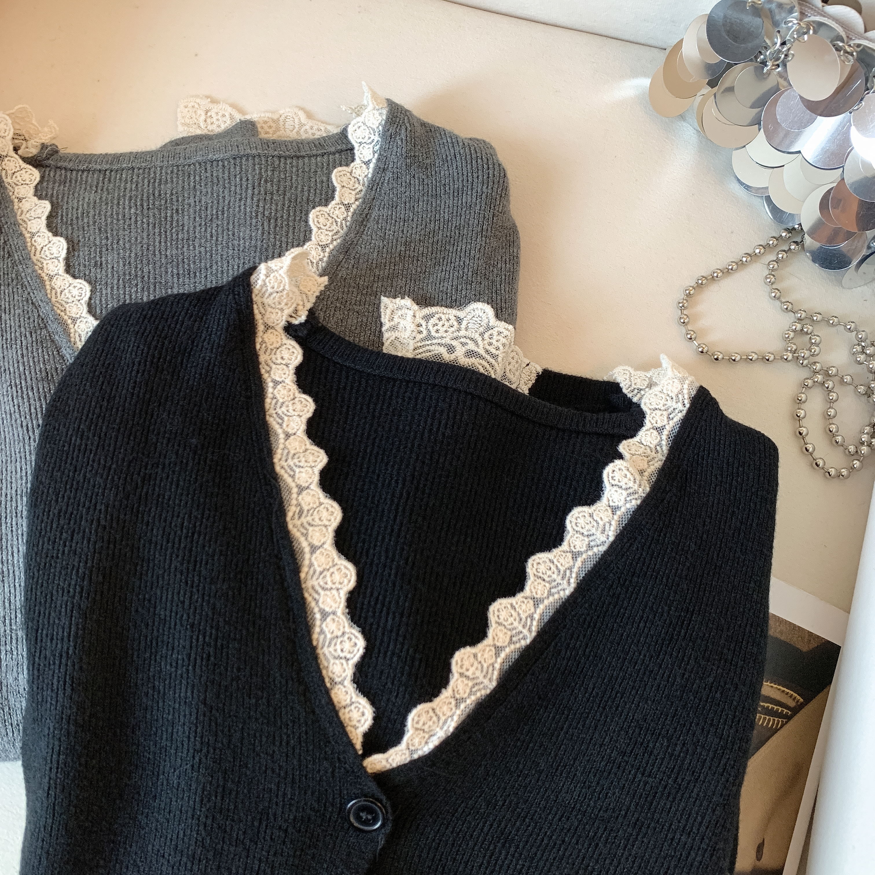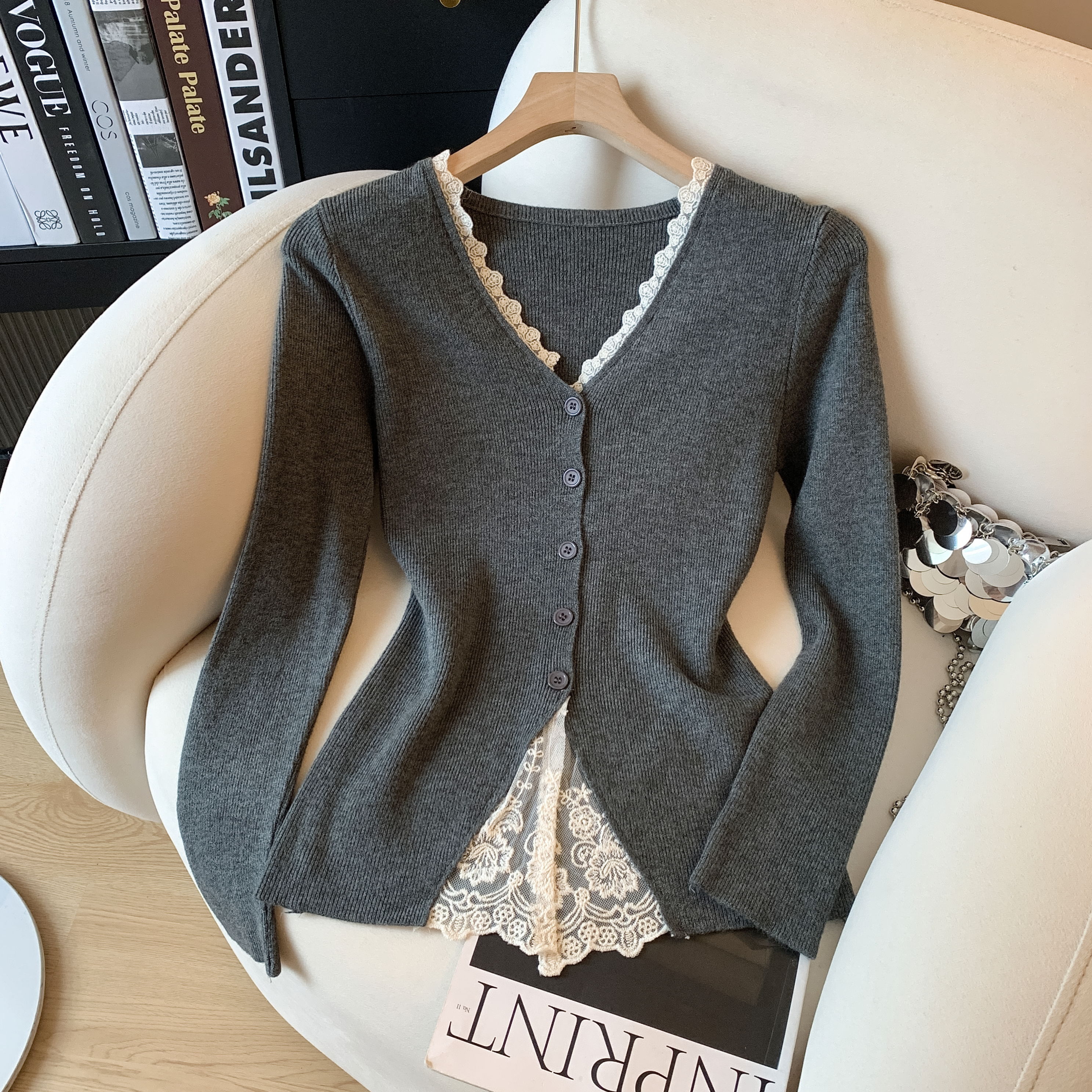 가을과 겨울에 딱 맞으며 날씬해 보이고 몸매가 예뻐 보이는 한국식 회색 레이스 트리밍 V넥 긴팔 니트 카디건의 실제 사진입니다.