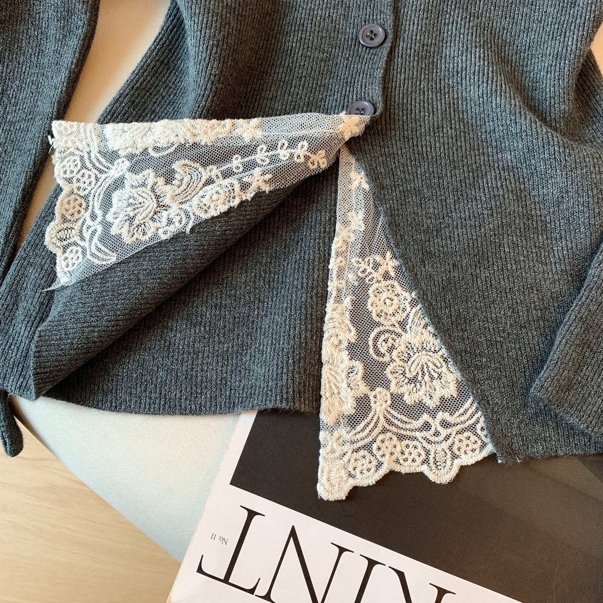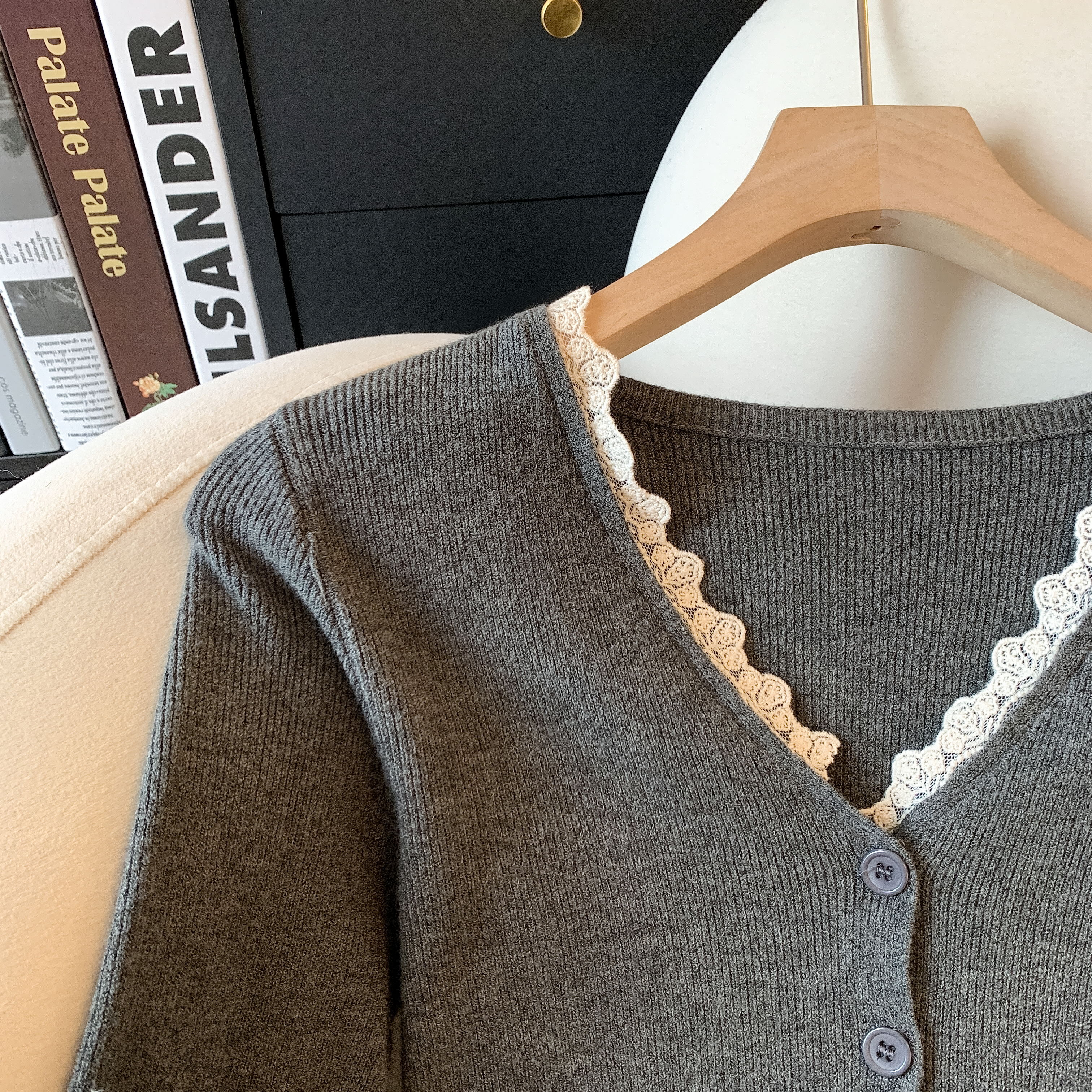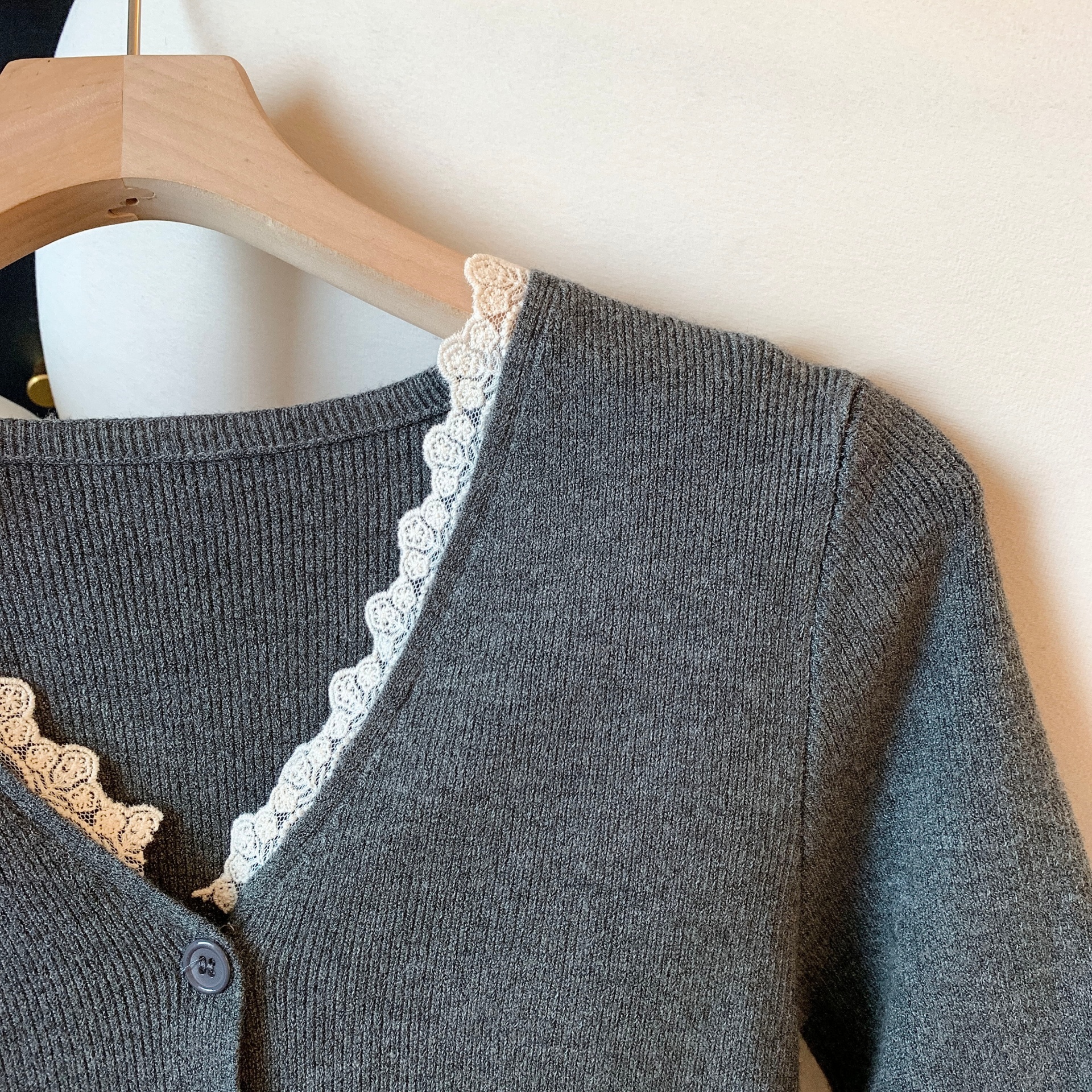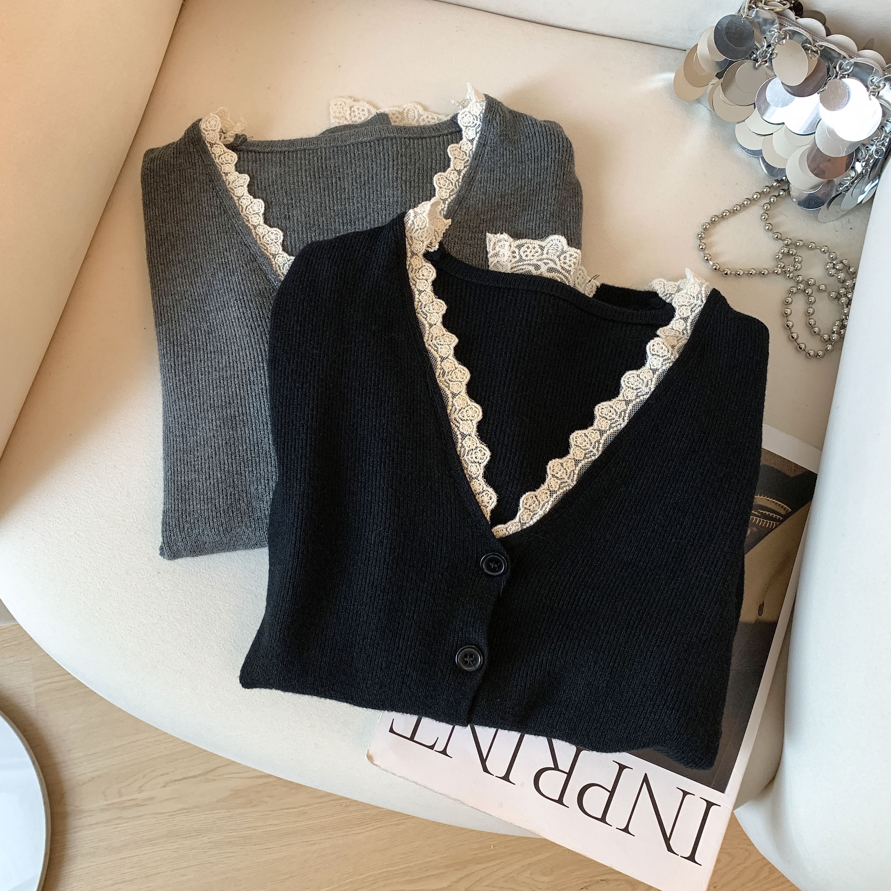 가을과 겨울에 딱 맞으며 날씬해 보이고 몸매가 예뻐 보이는 한국식 회색 레이스 트리밍 V넥 긴팔 니트 카디건의 실제 사진입니다.