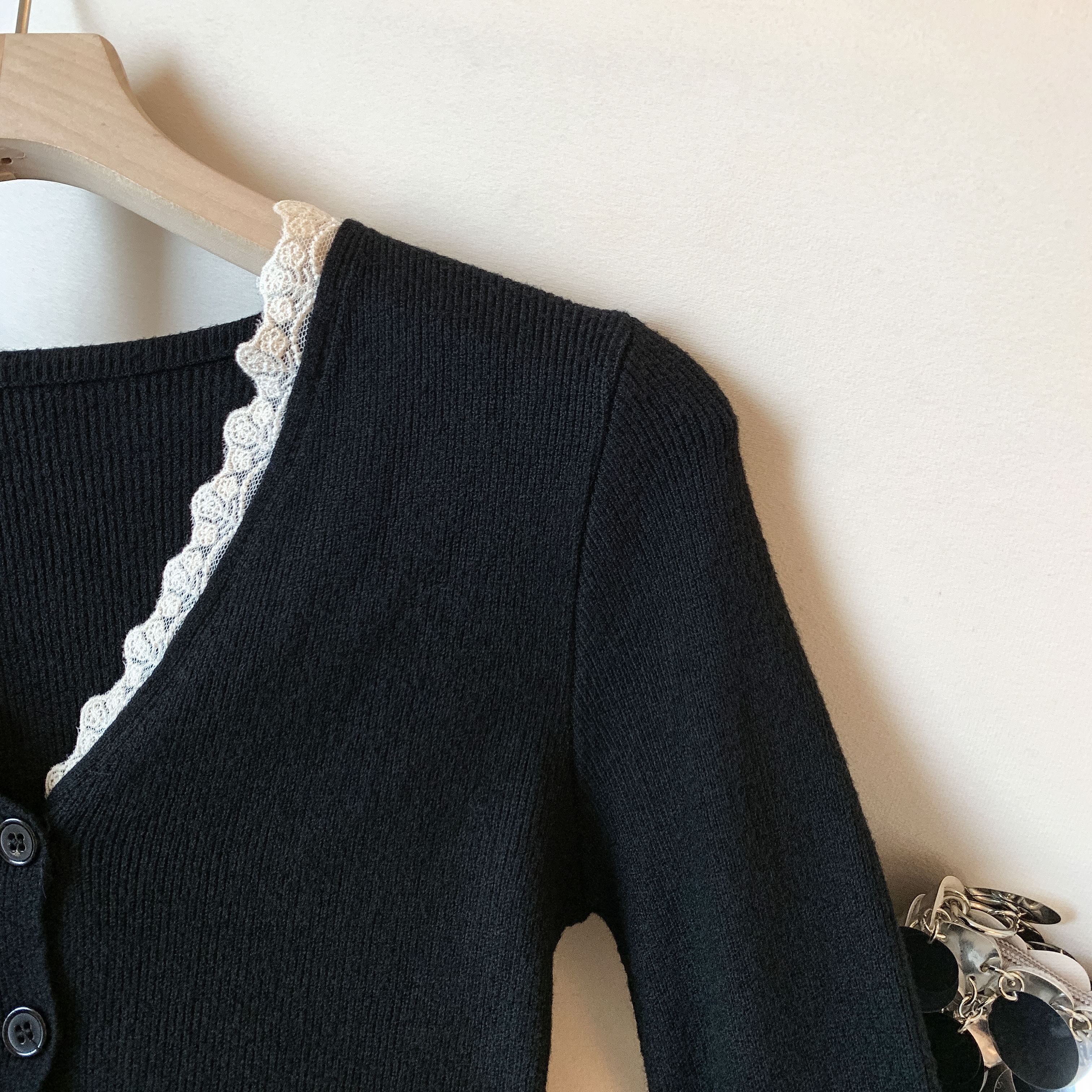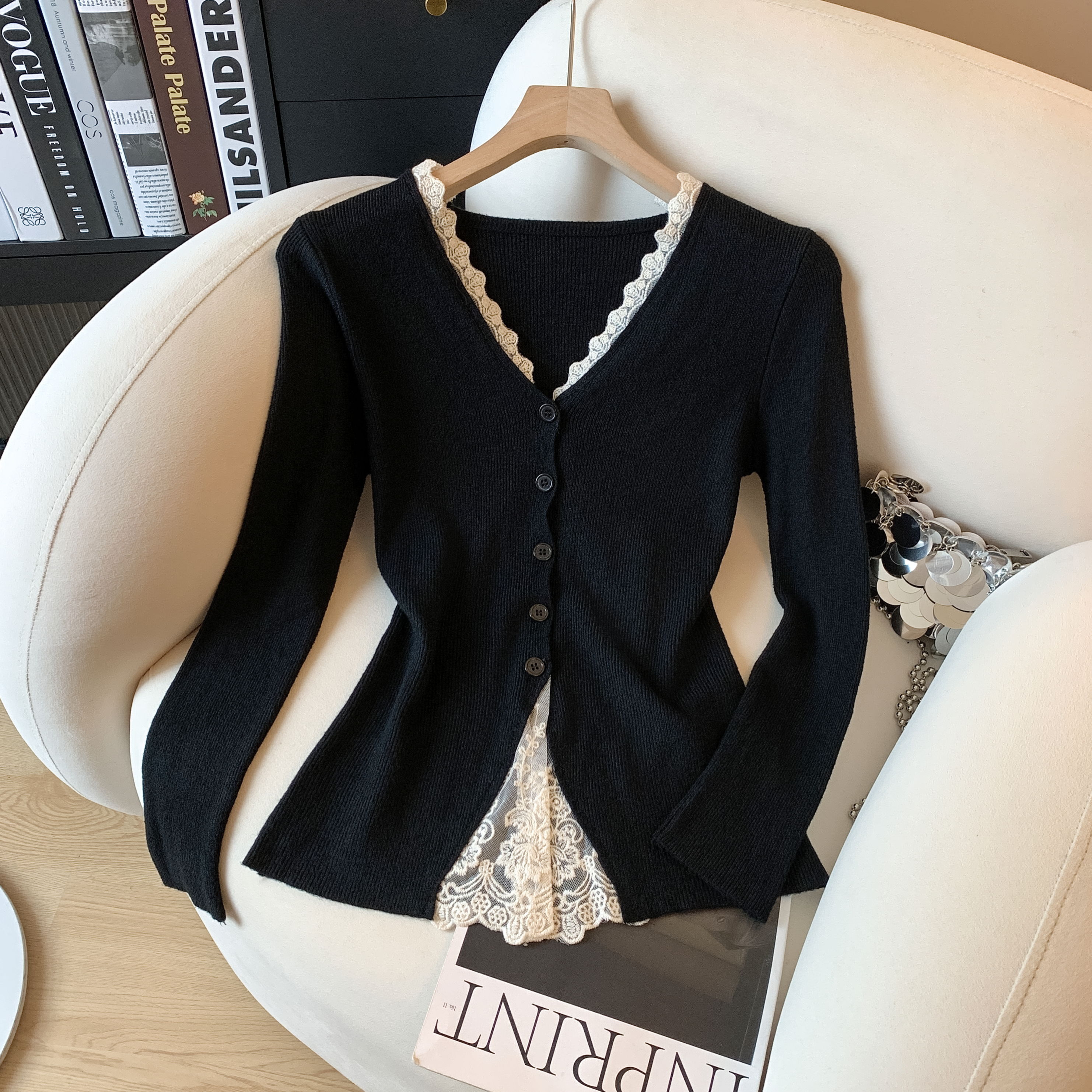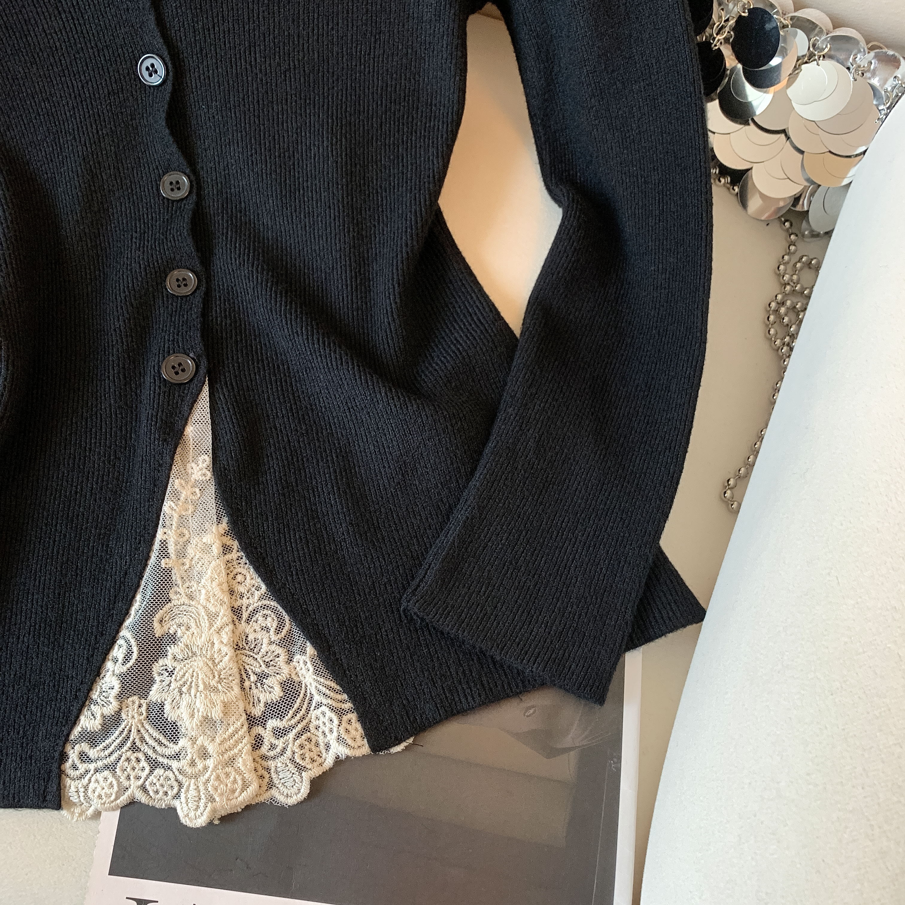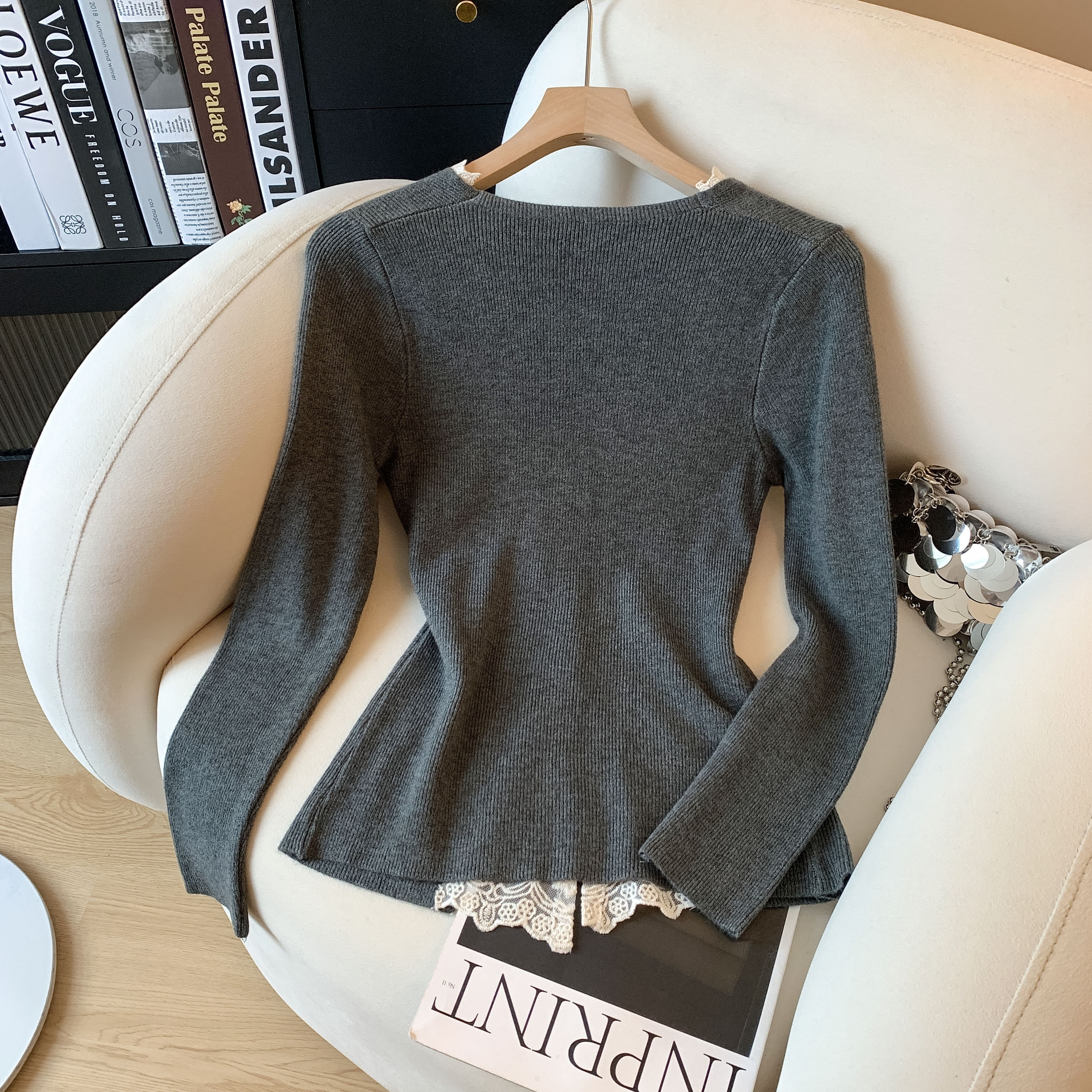 가을과 겨울에 딱 맞으며 날씬해 보이고 몸매가 예뻐 보이는 한국식 회색 레이스 트리밍 V넥 긴팔 니트 카디건의 실제 사진입니다.