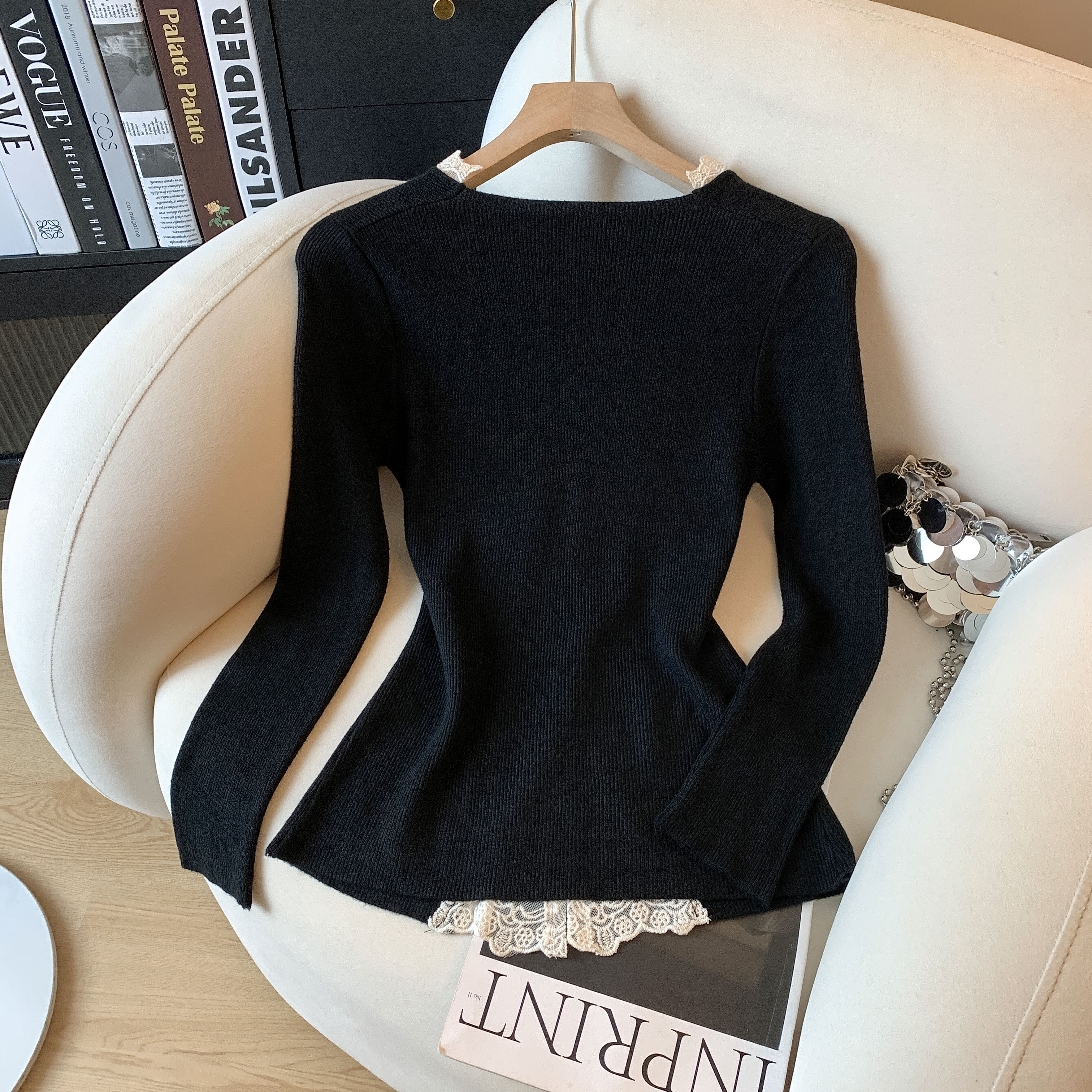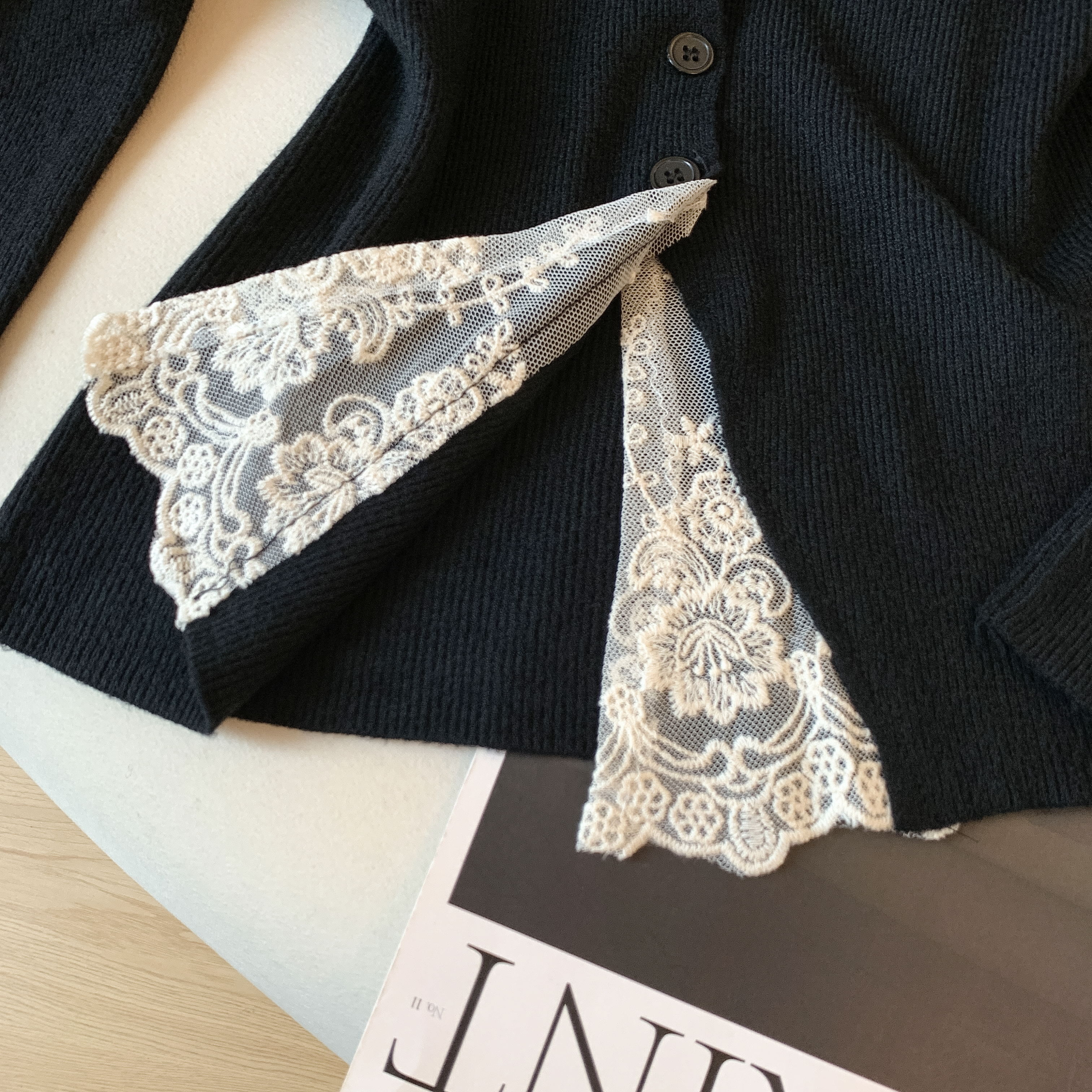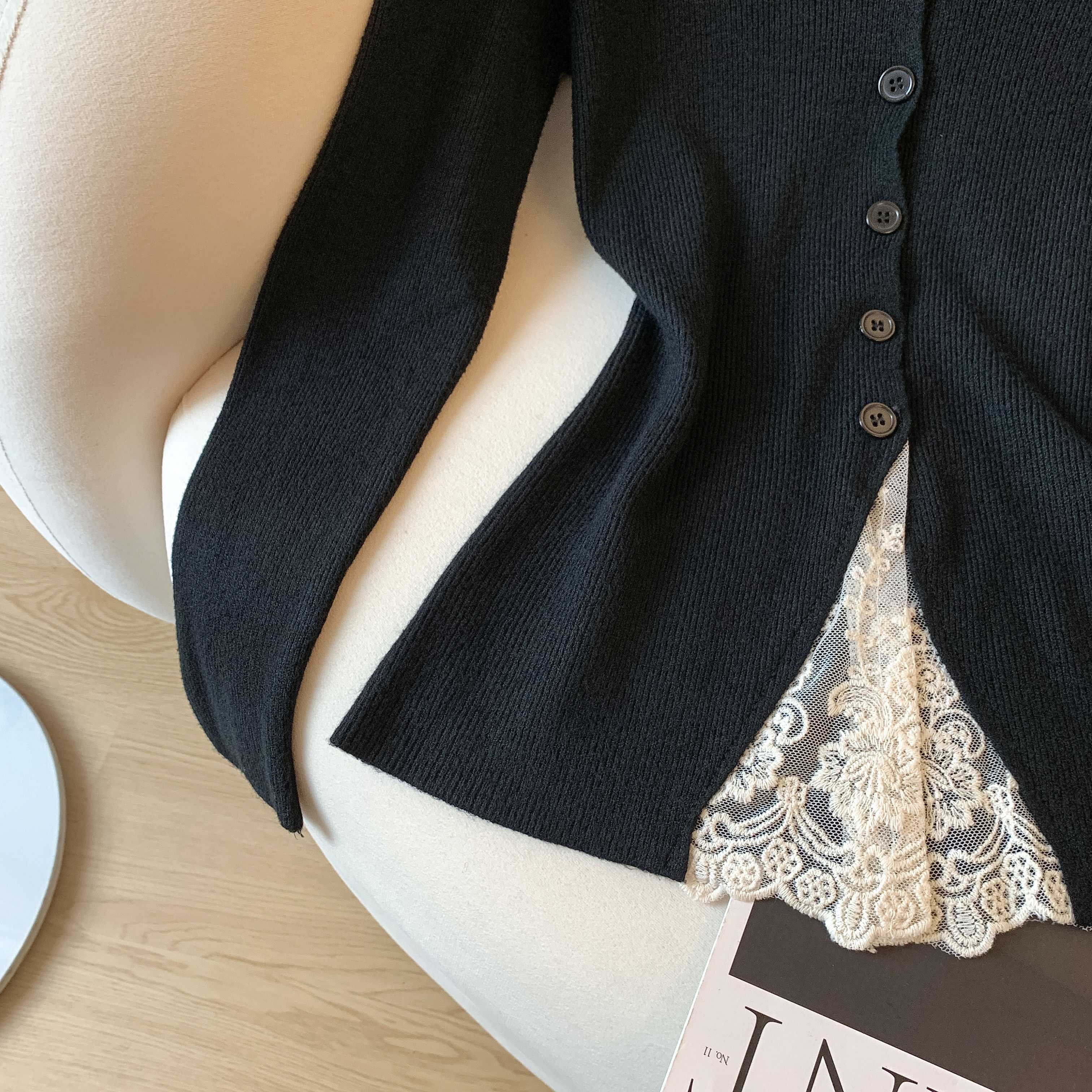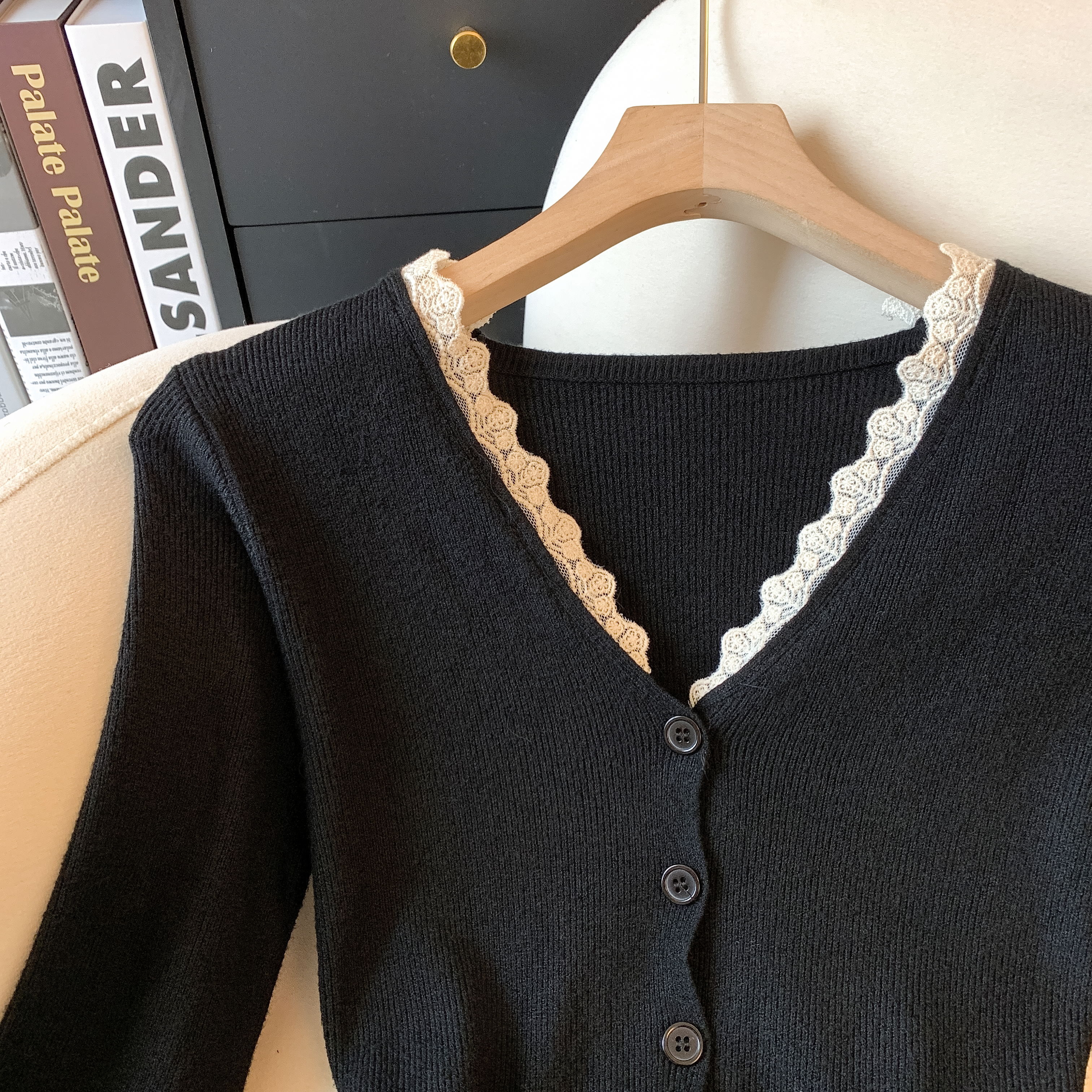 가을과 겨울에 딱 맞으며 날씬해 보이고 몸매가 예뻐 보이는 한국식 회색 레이스 트리밍 V넥 긴팔 니트 카디건의 실제 사진입니다.
