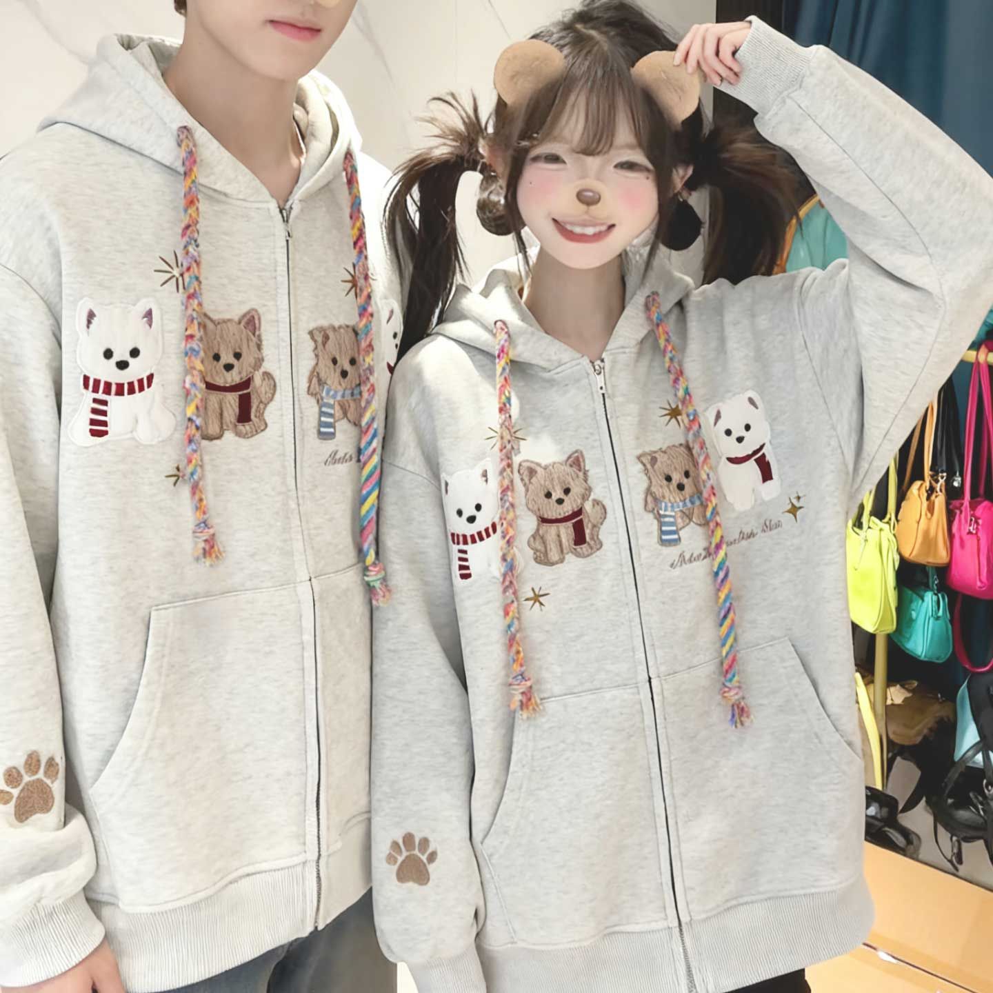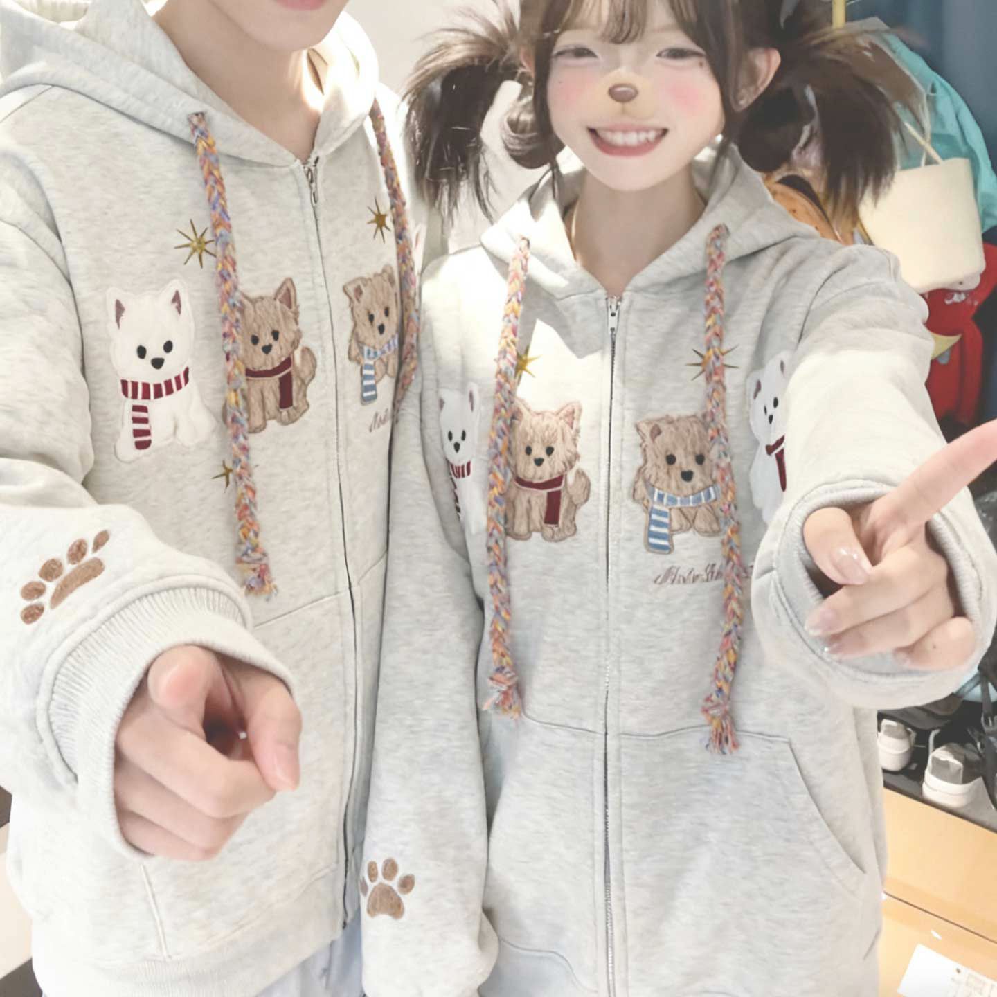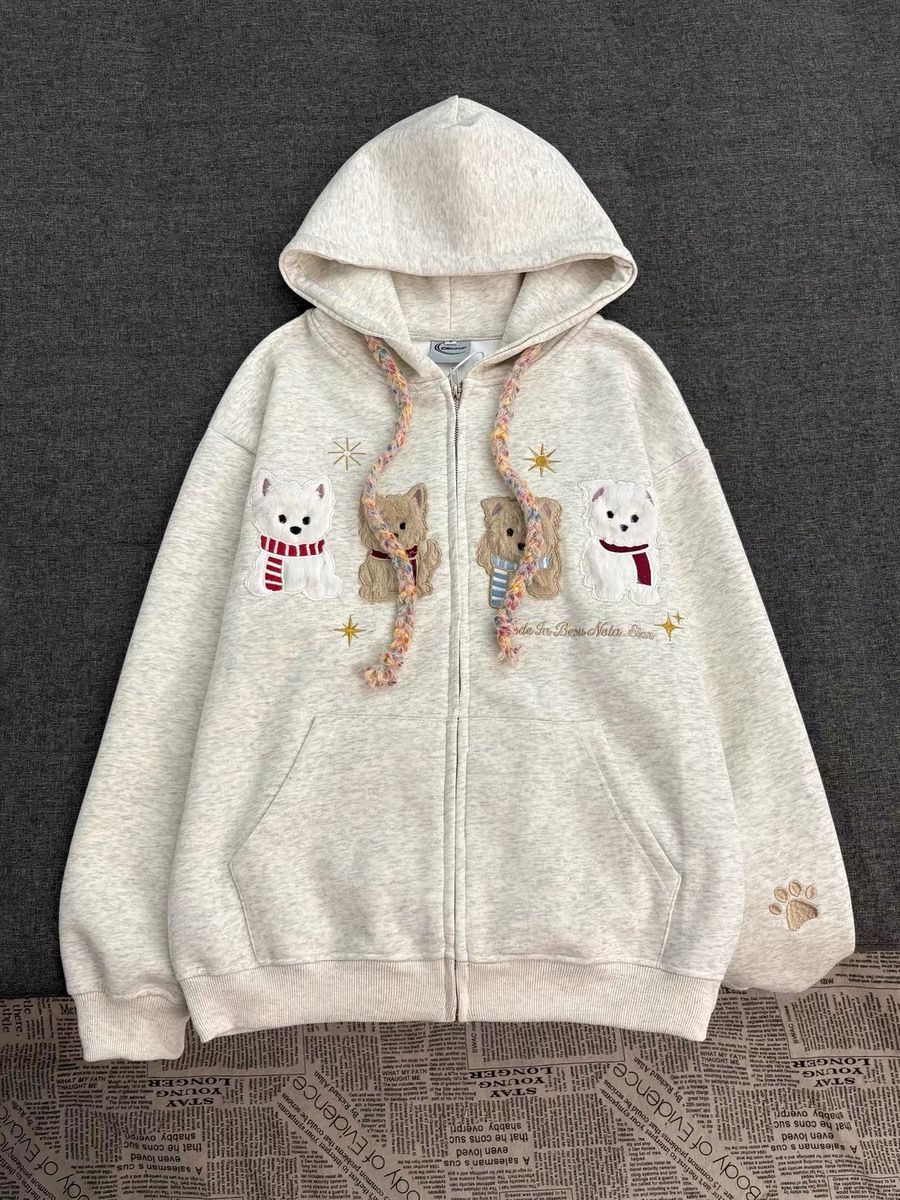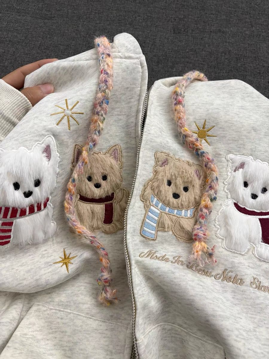 화미안 합성 소재, 정품 450g, 곰 자수 후드 커플 스웨트셔츠, 가을, 겨울용 플리스 안감 레트로 카디건, 여성용.