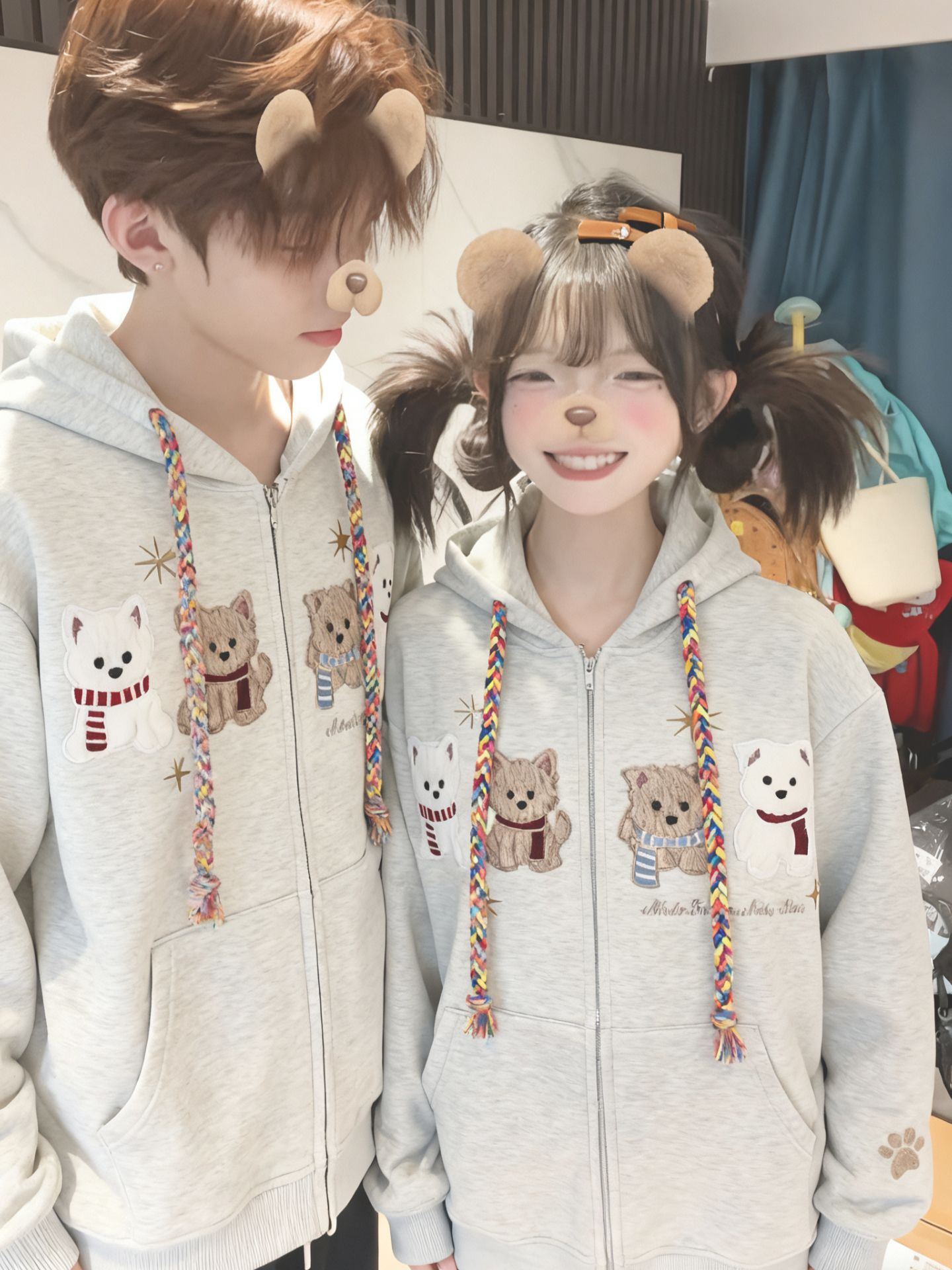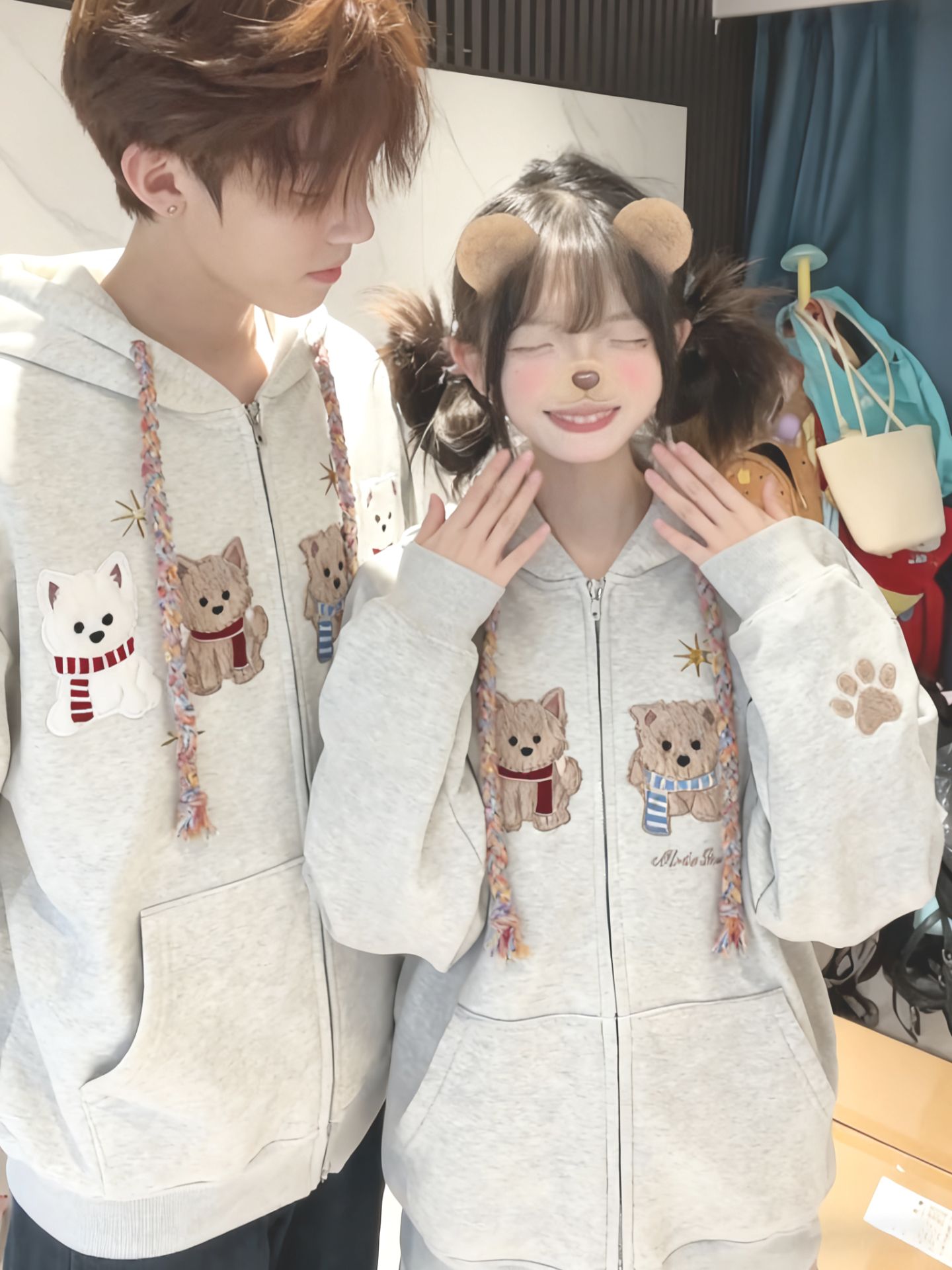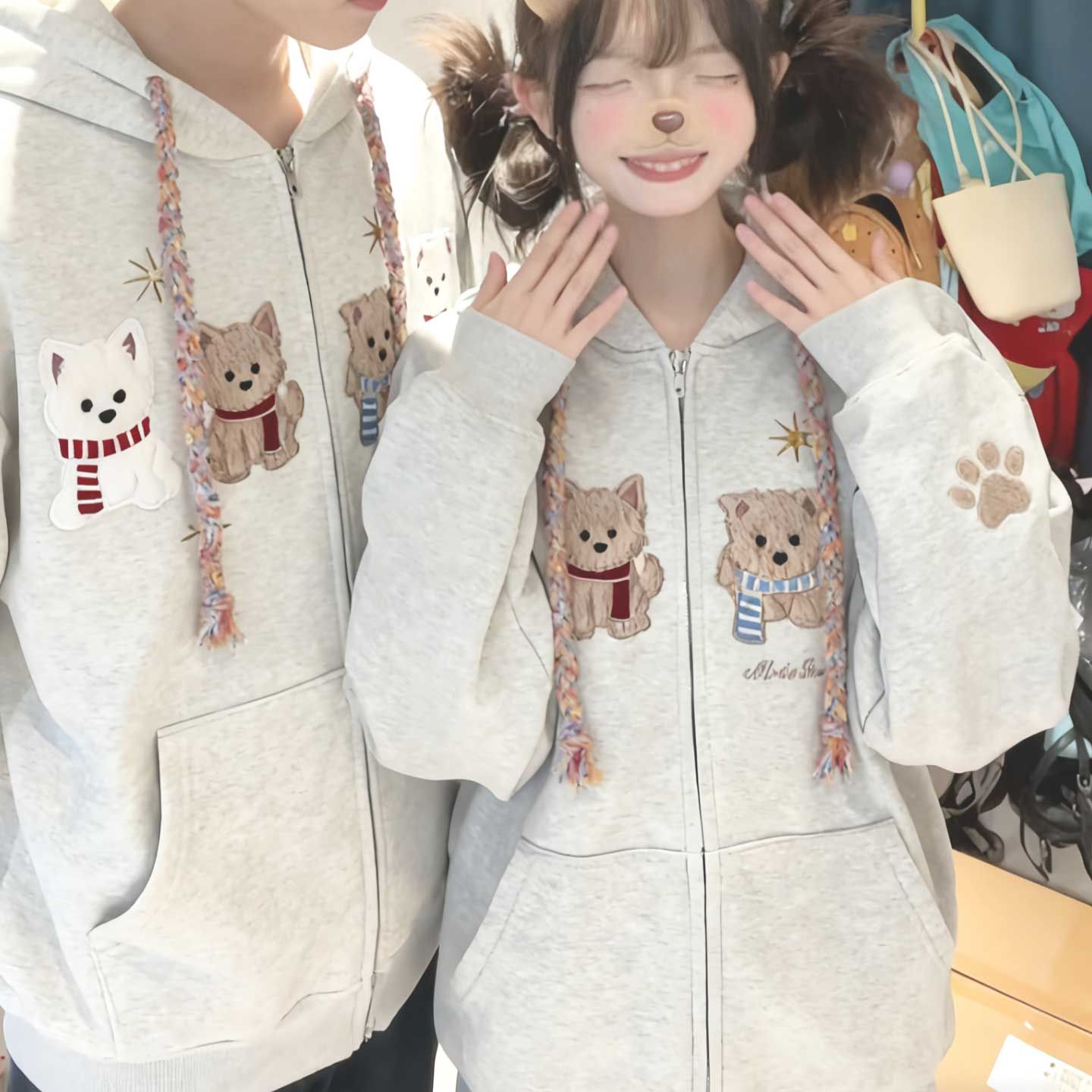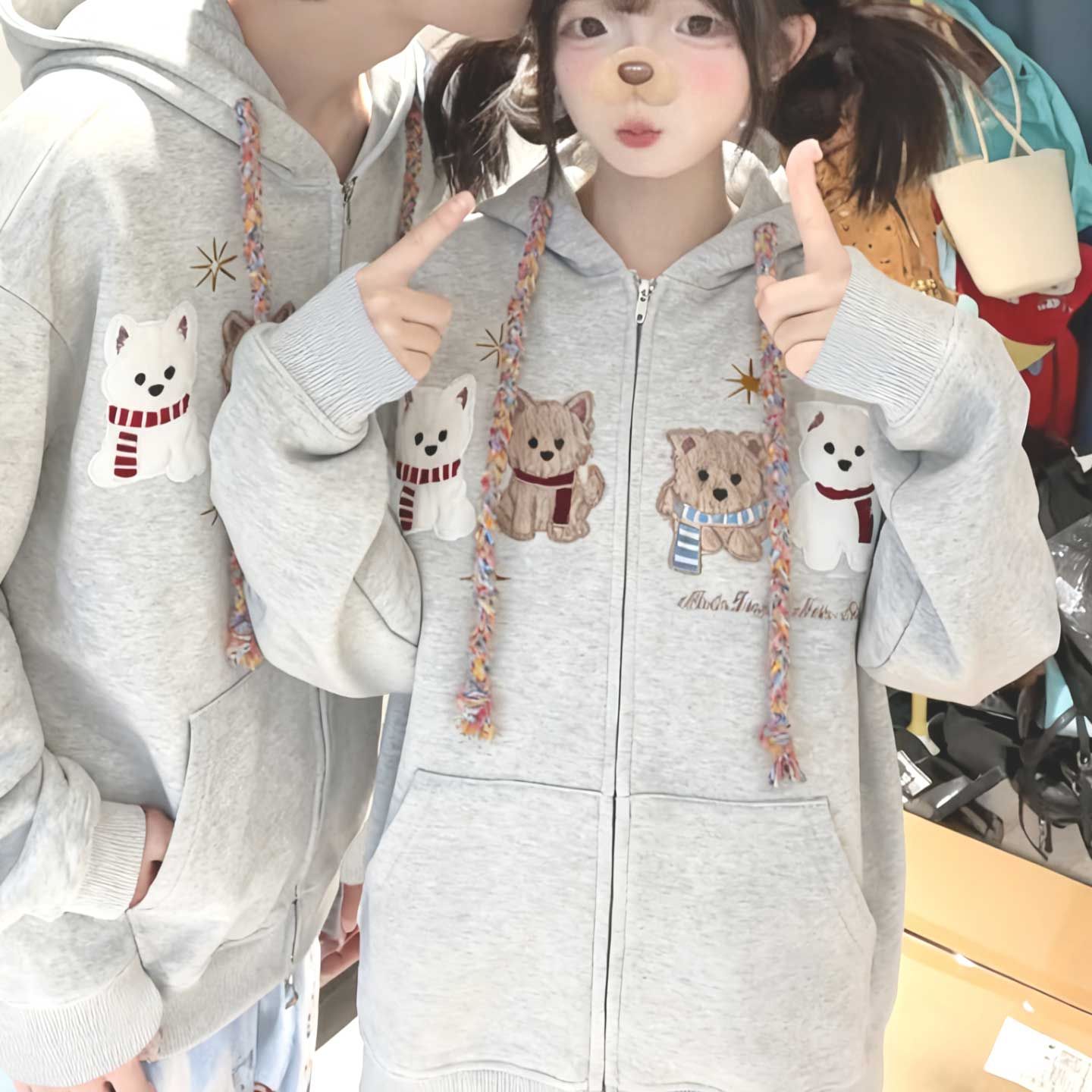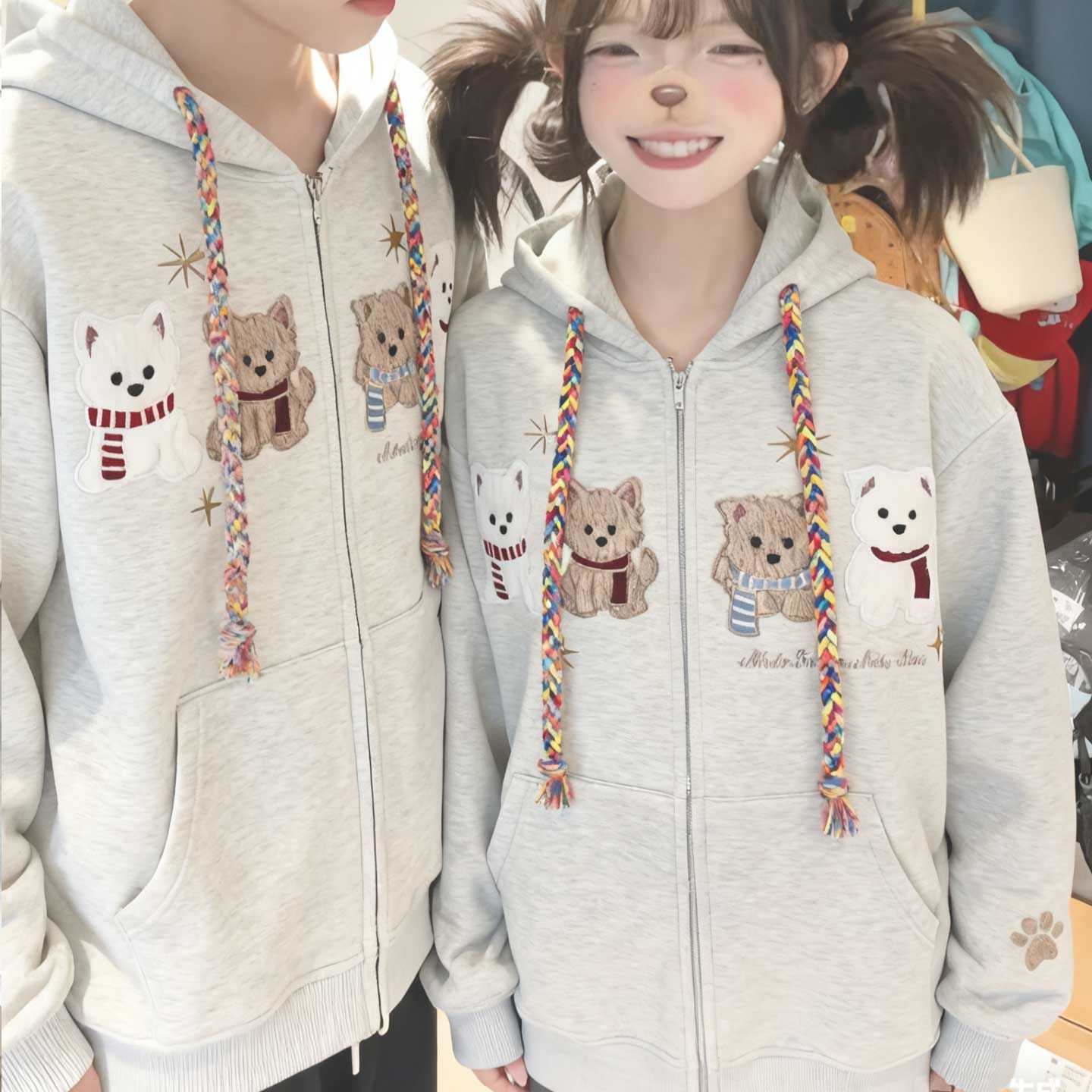 화미안 합성 소재, 정품 450g, 곰 자수 후드 커플 스웨트셔츠, 가을, 겨울용 플리스 안감 레트로 카디건, 여성용.