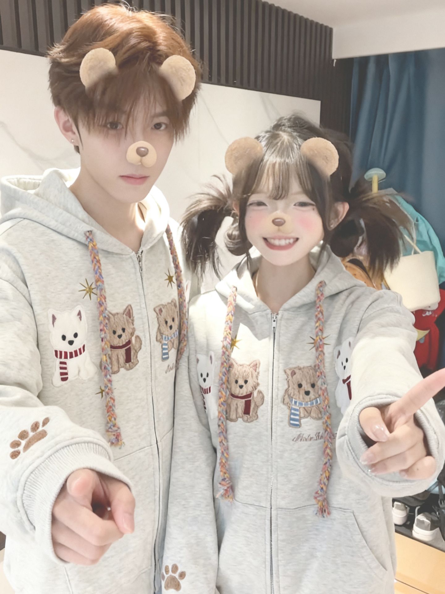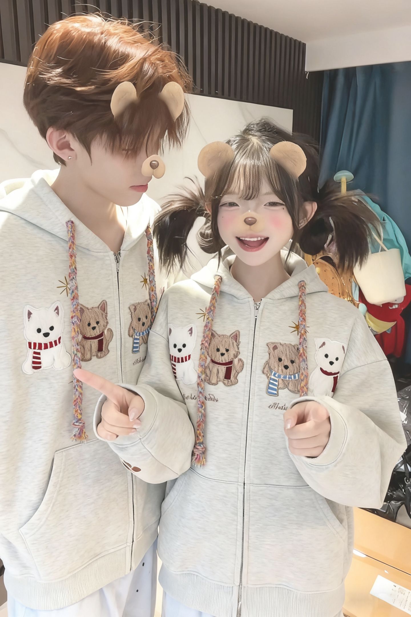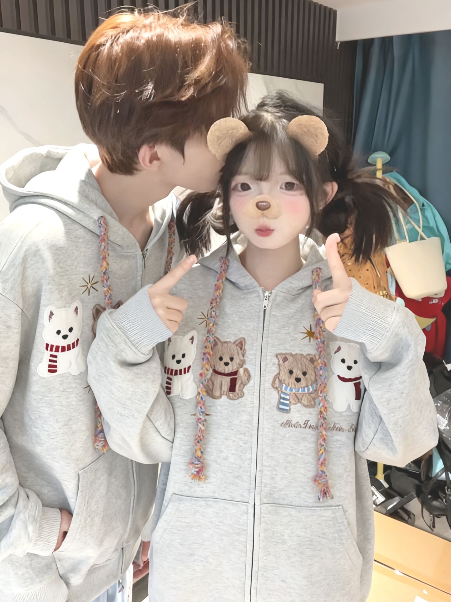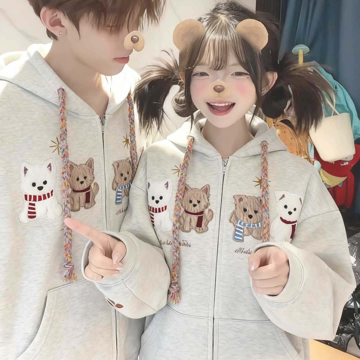 화미안 합성 소재, 정품 450g, 곰 자수 후드 커플 스웨트셔츠, 가을, 겨울용 플리스 안감 레트로 카디건, 여성용.