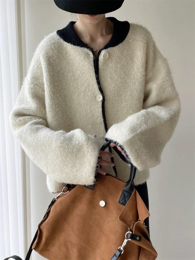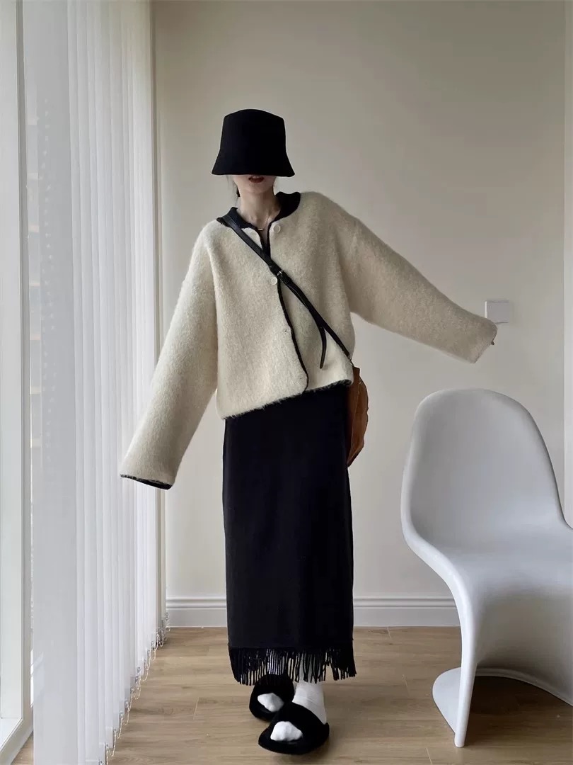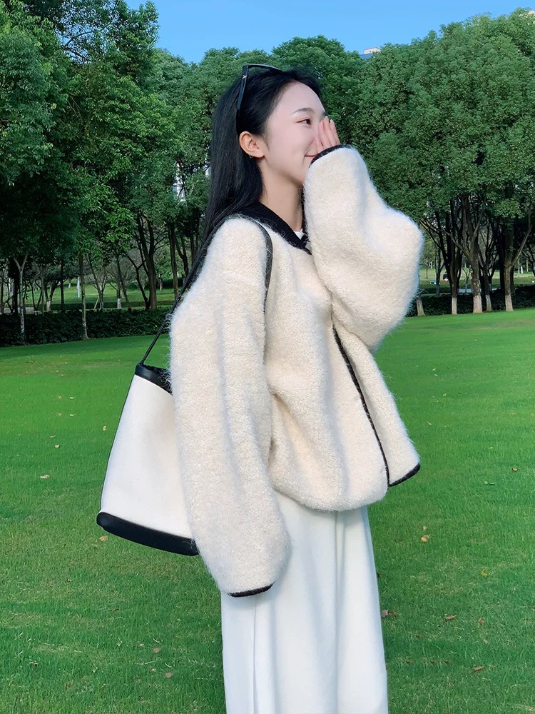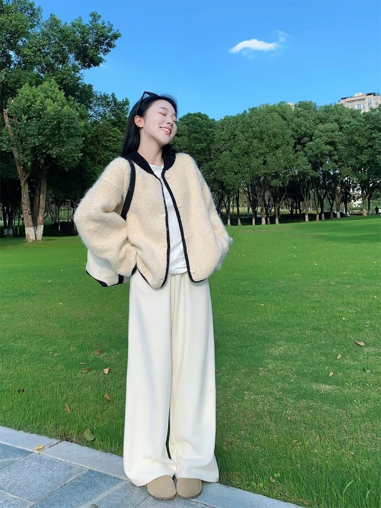 부드럽고 여유로운 스타일, 느슨한 퍼 스웨터 카디건, 와이드 레그의 느슨한 캐주얼 팬츠가 특징인 투피스 세트입니다.