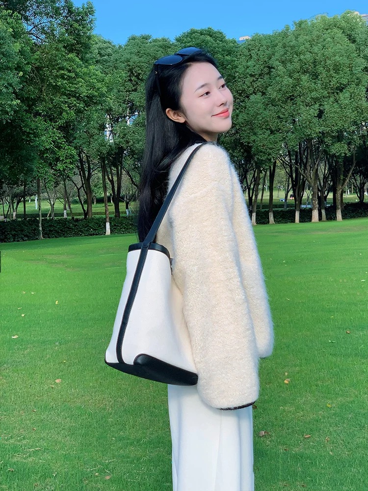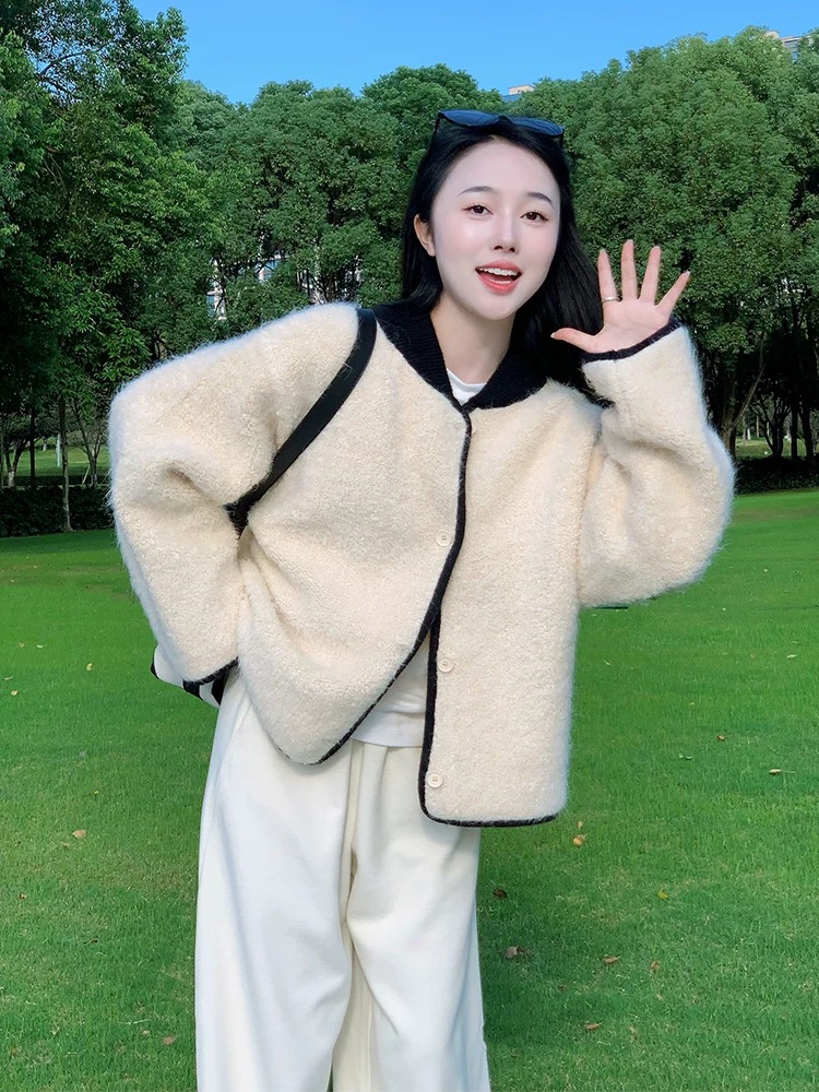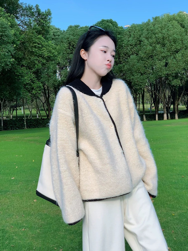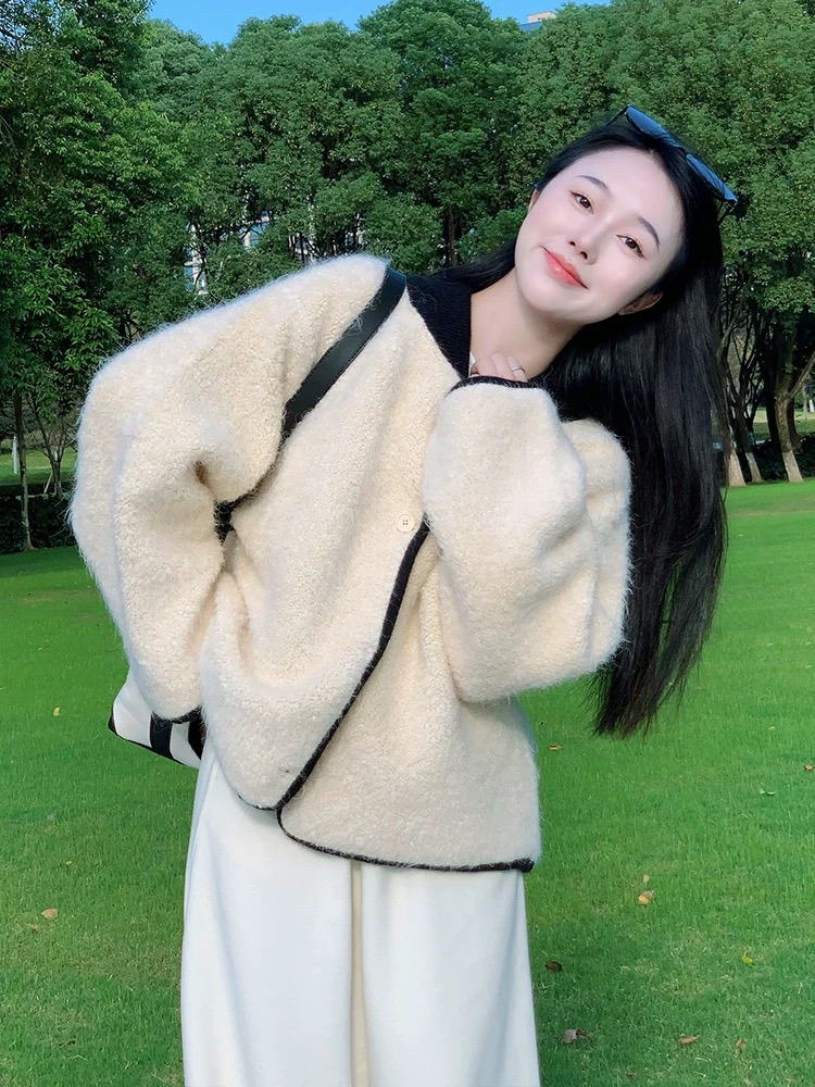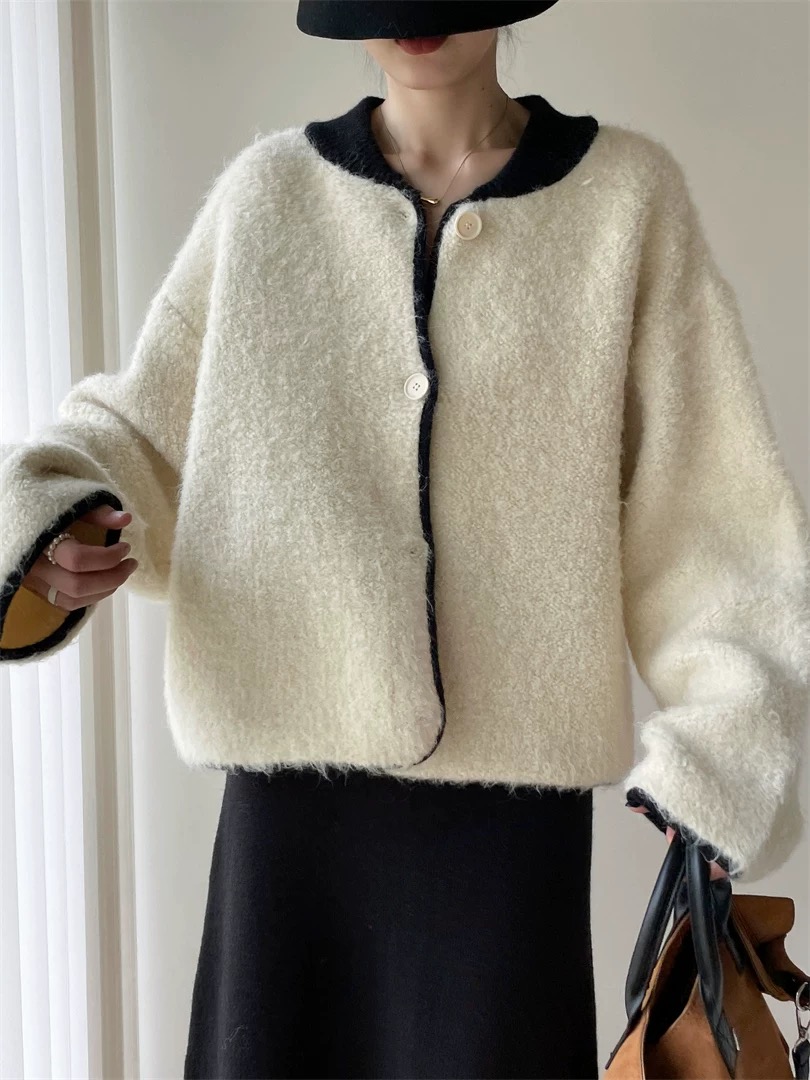 부드럽고 여유로운 스타일, 느슨한 퍼 스웨터 카디건, 와이드 레그의 느슨한 캐주얼 팬츠가 특징인 투피스 세트입니다.