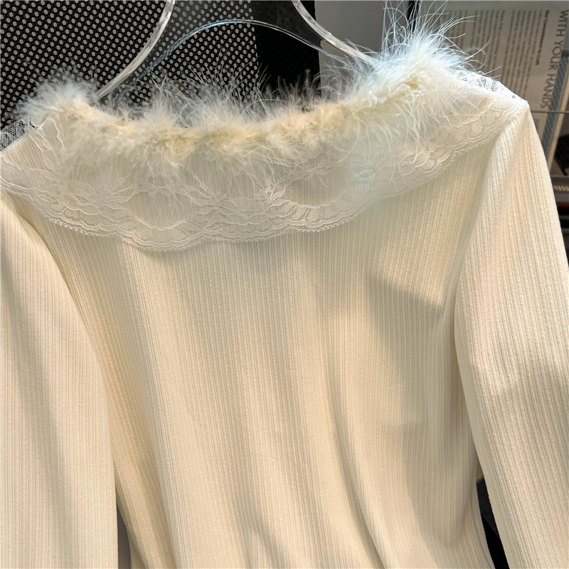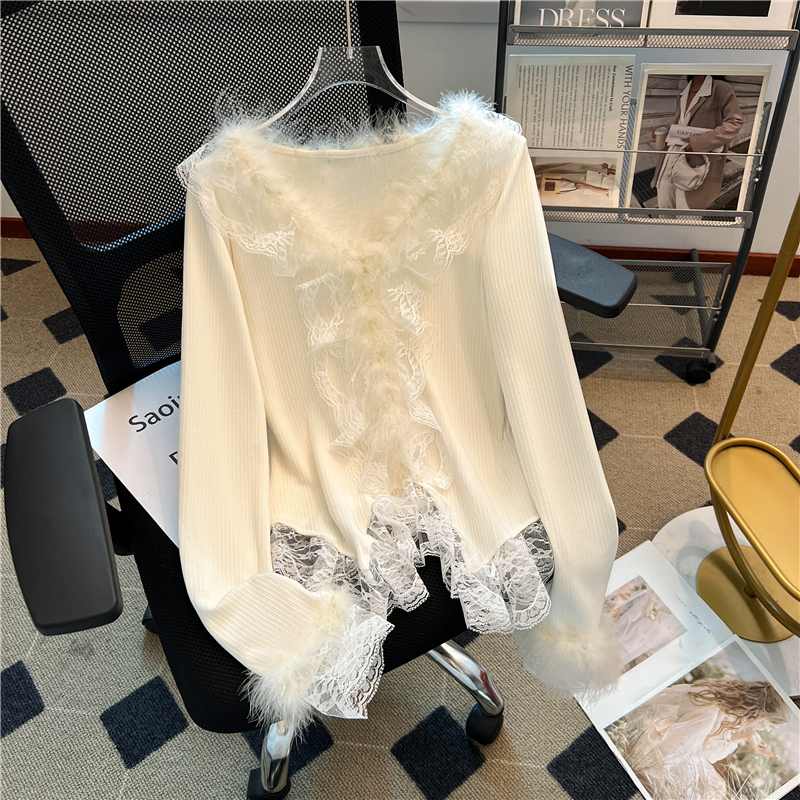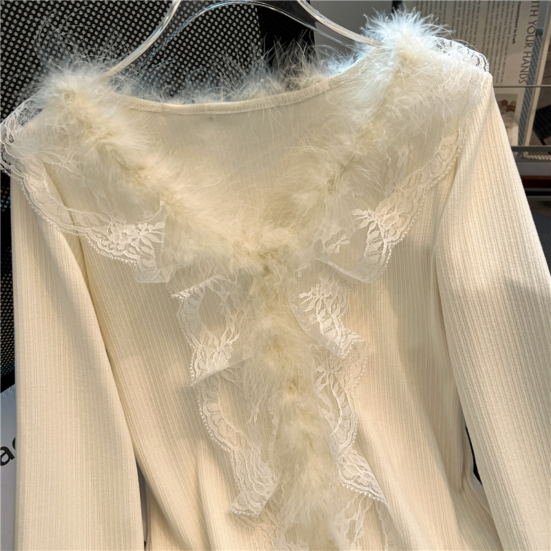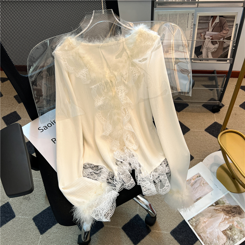 여성용 신상 가을/겨울 스타일의 순수하고 매혹적인 플러시 레이스 패치워크 탑, V넥 슬림핏 긴팔 티셔츠의 실제 사진입니다.
