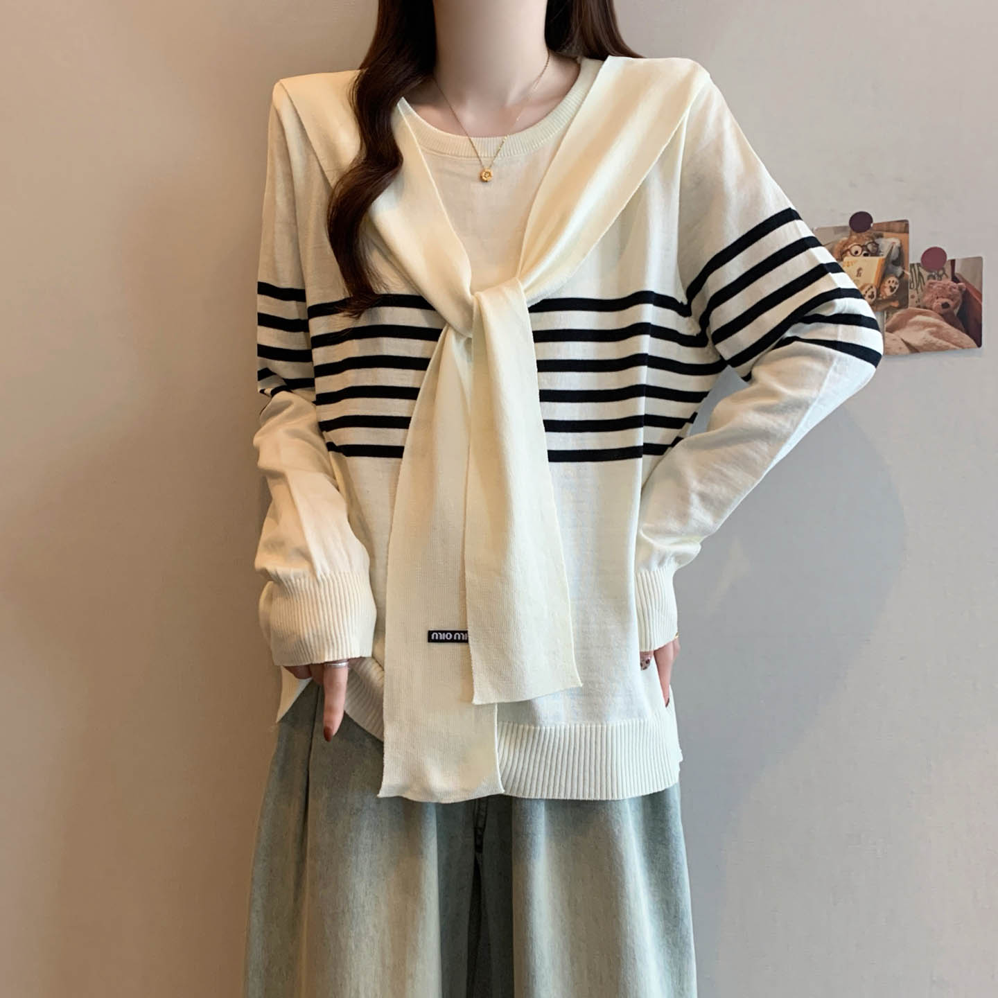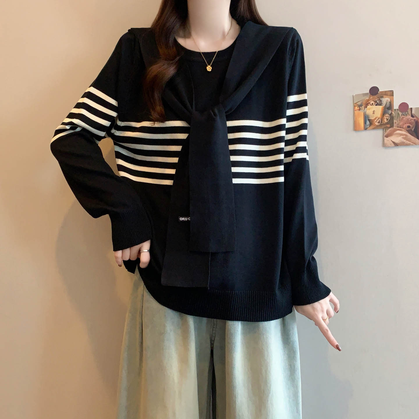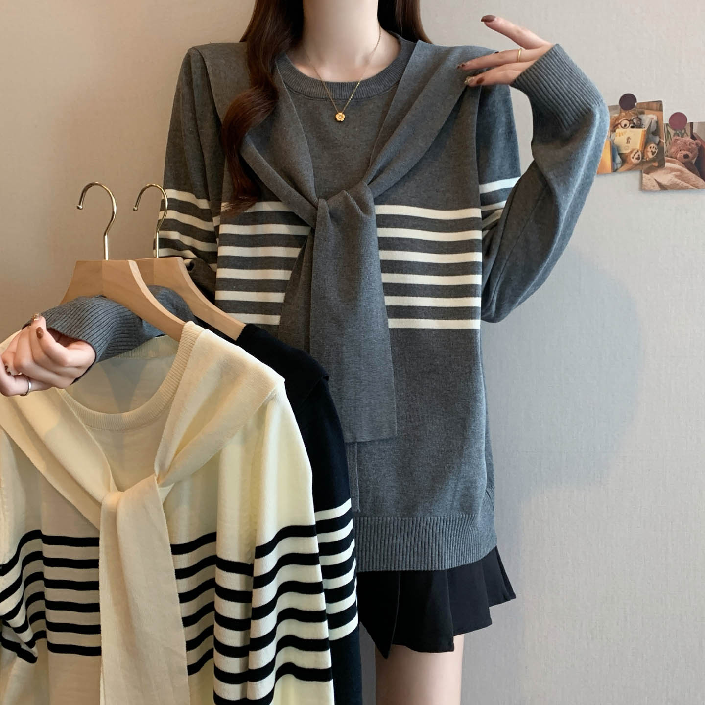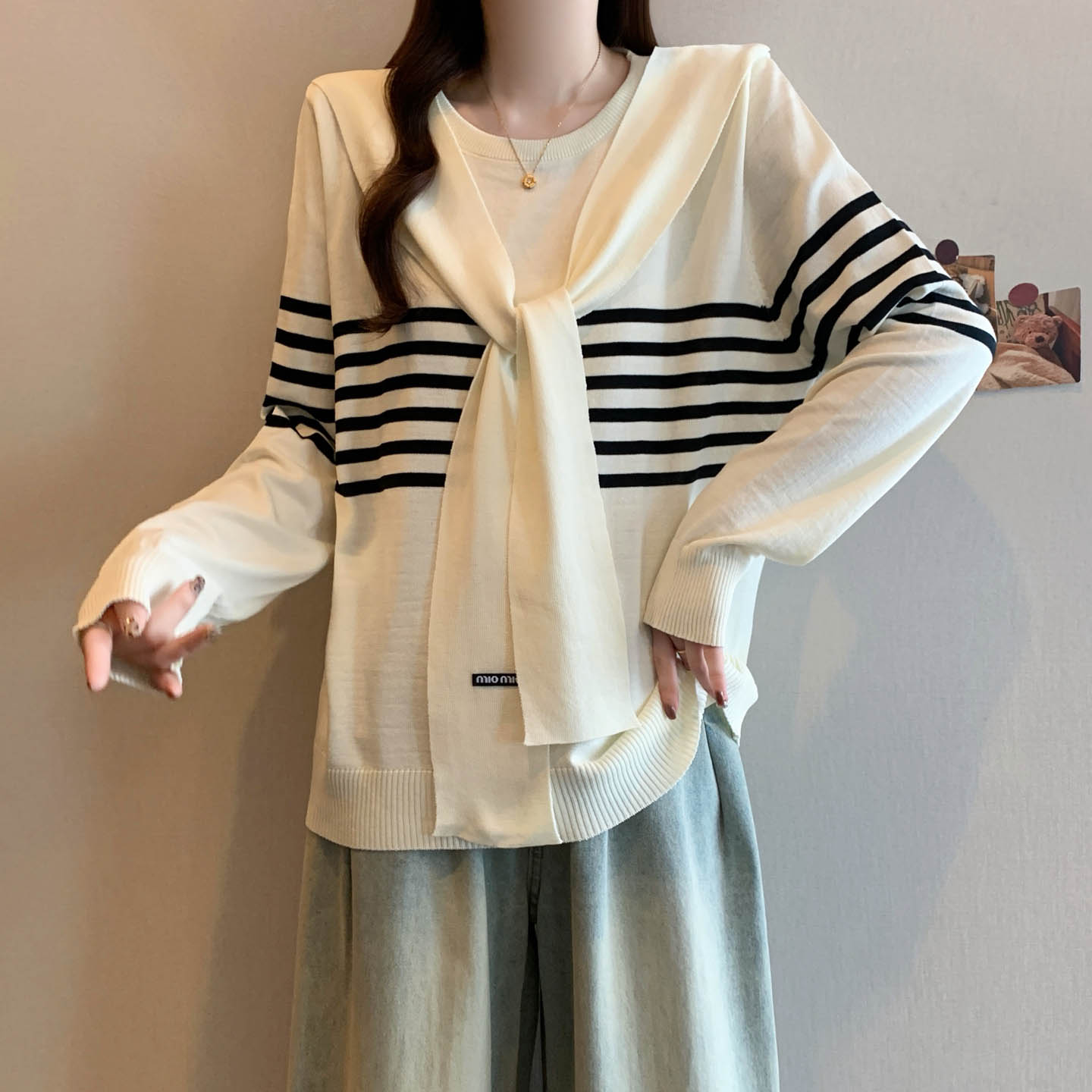 플러스 사이즈 프렌치 스트라이프 숄 스카프 칼라 긴팔 니트 스웨터의 실제 사진입니다. 플러스 사이즈 여성을 위한 새로운 가을 스타일로, 세련된 이너 스웨터입니다.
