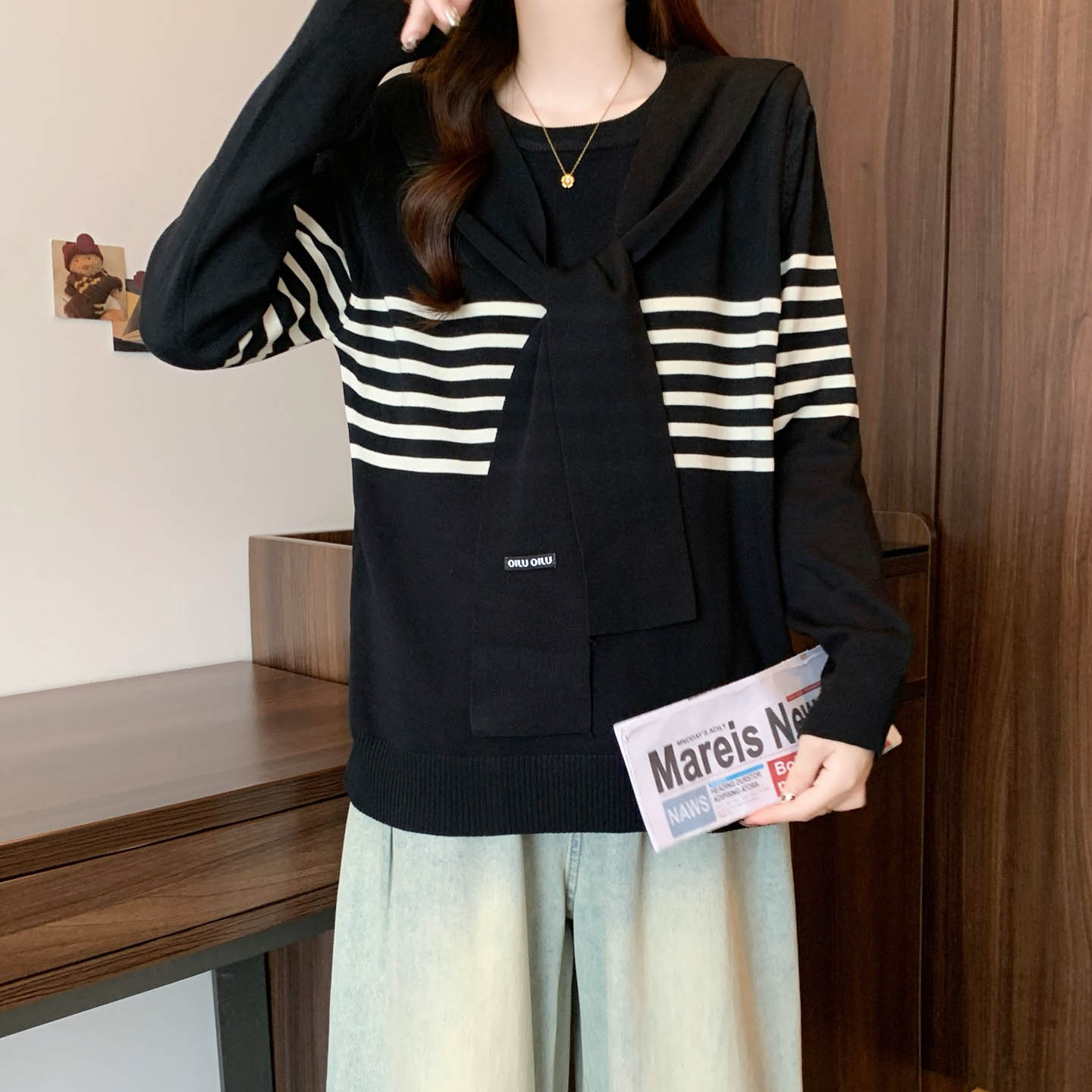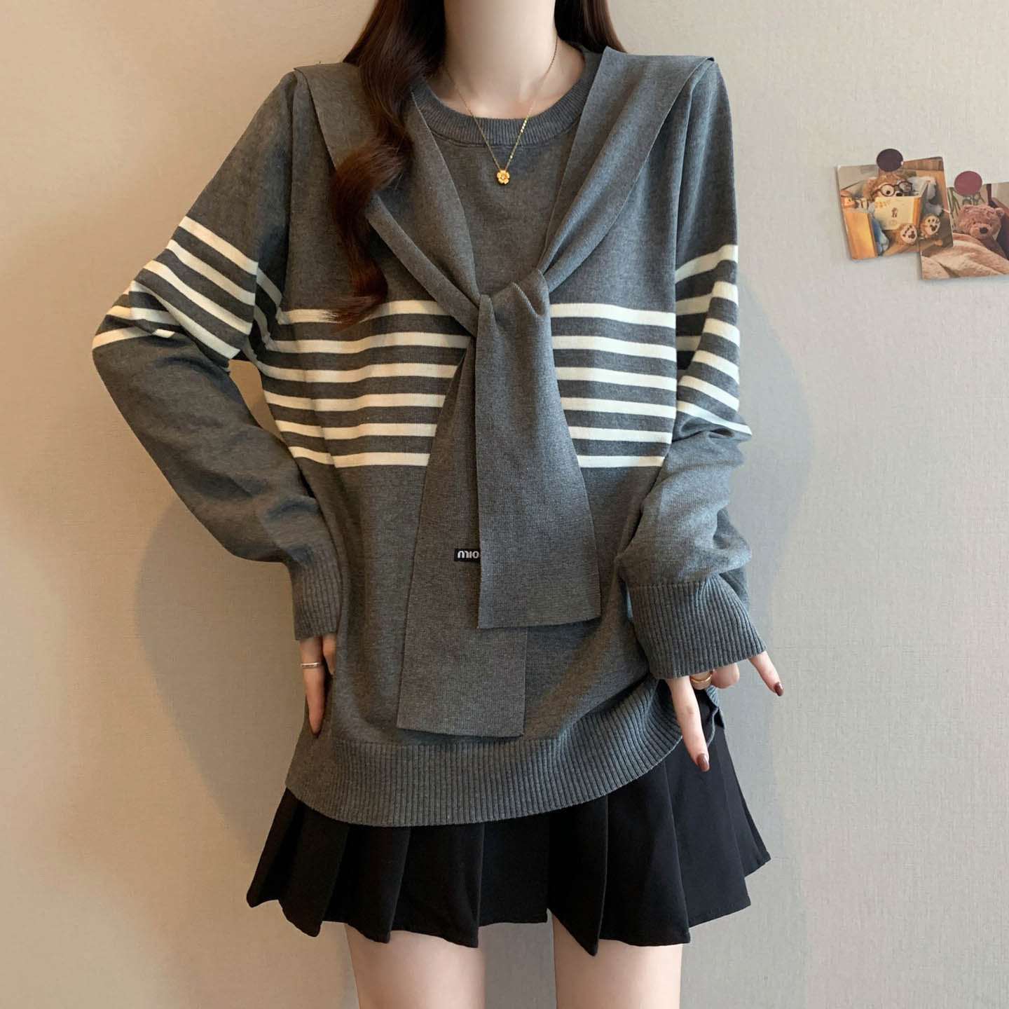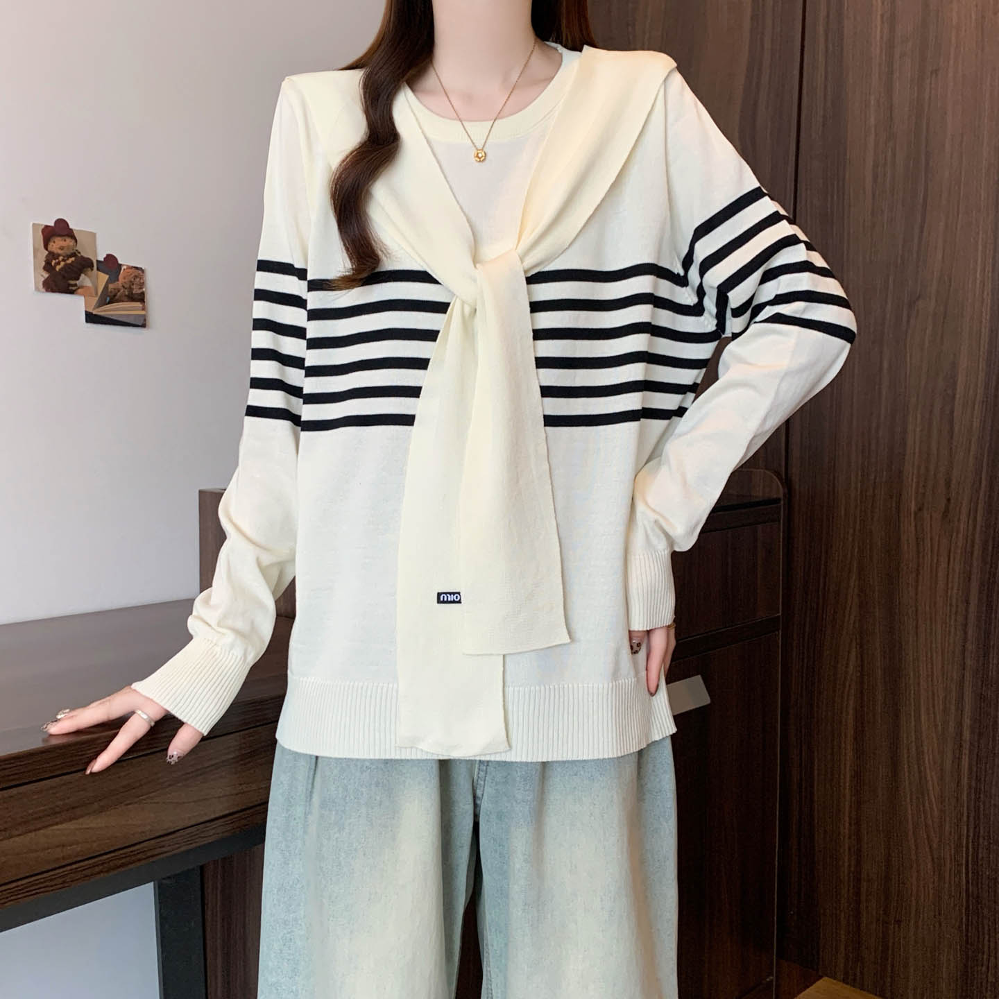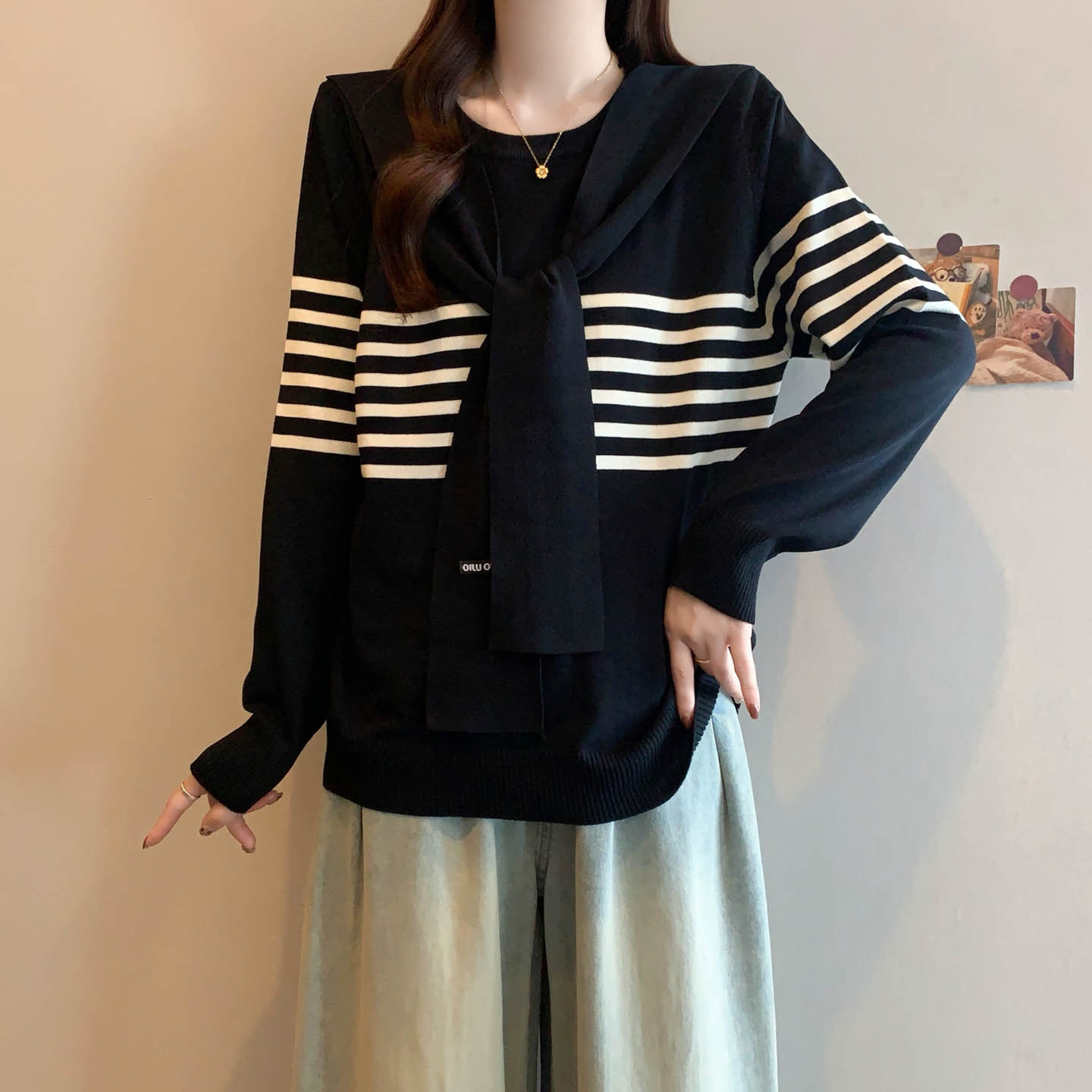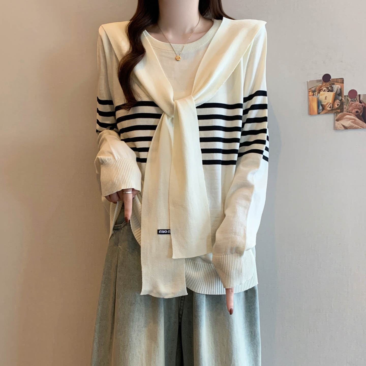 플러스 사이즈 프렌치 스트라이프 숄 스카프 칼라 긴팔 니트 스웨터의 실제 사진입니다. 플러스 사이즈 여성을 위한 새로운 가을 스타일로, 세련된 이너 스웨터입니다.