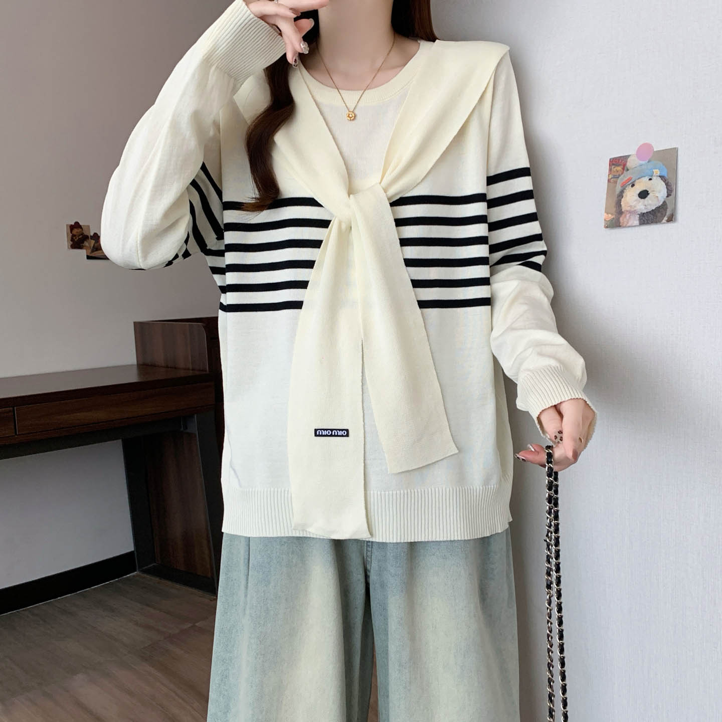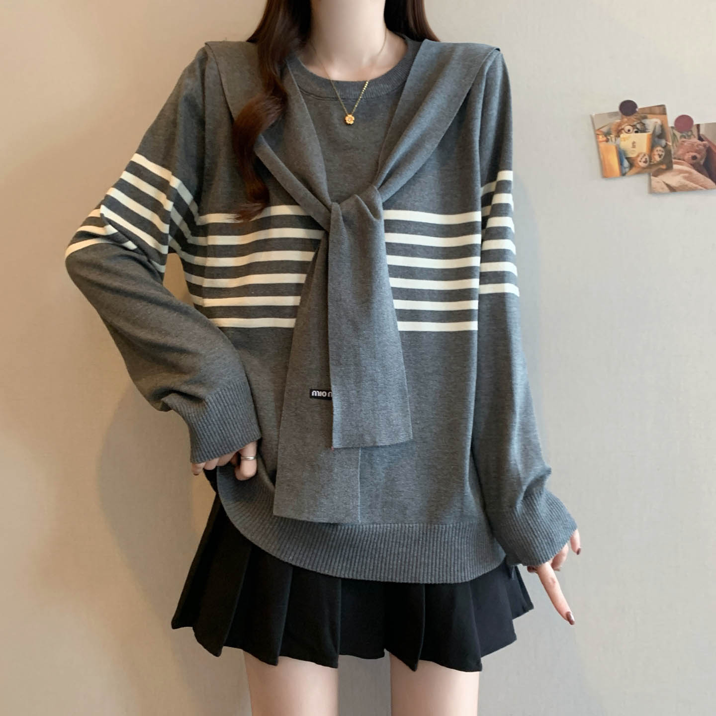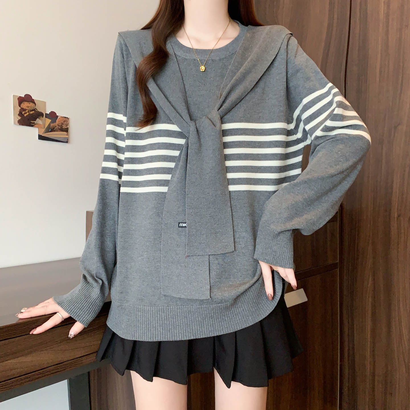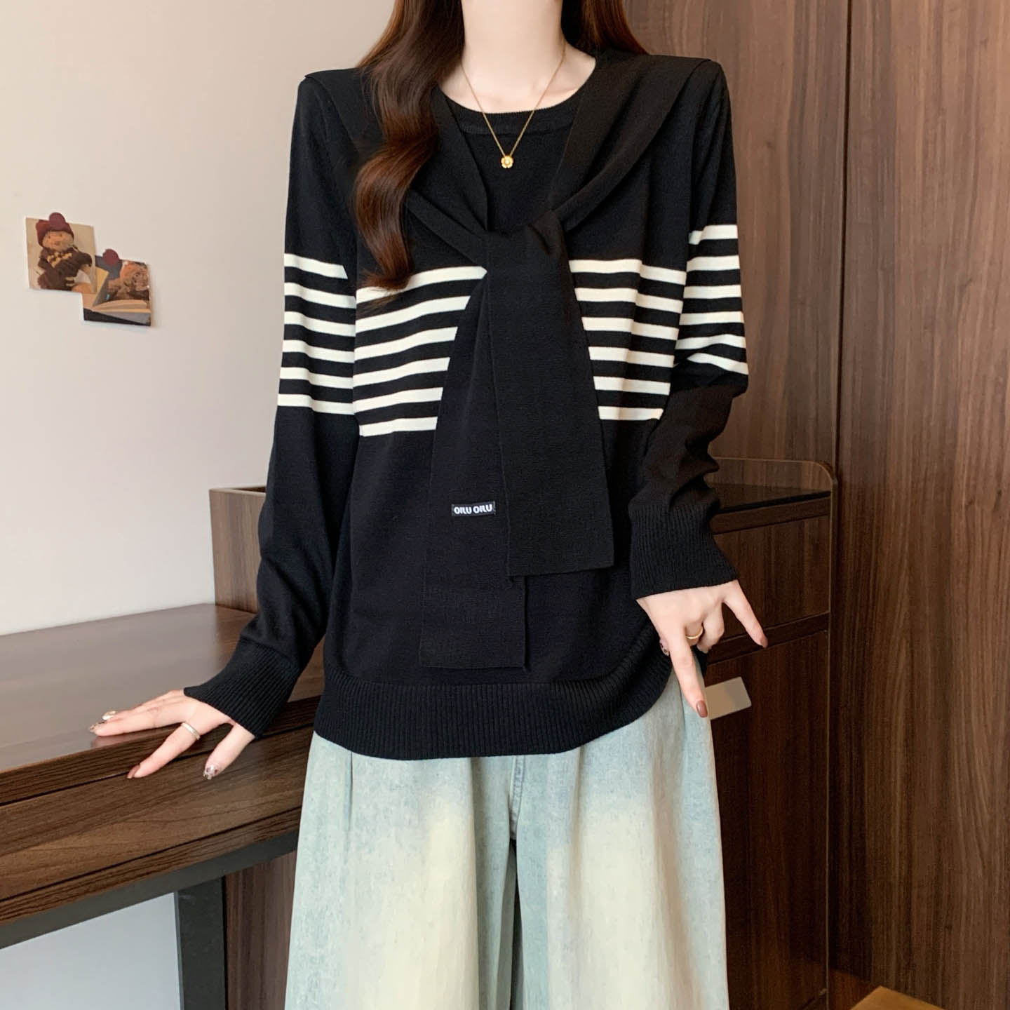 플러스 사이즈 프렌치 스트라이프 숄 스카프 칼라 긴팔 니트 스웨터의 실제 사진입니다. 플러스 사이즈 여성을 위한 새로운 가을 스타일로, 세련된 이너 스웨터입니다.