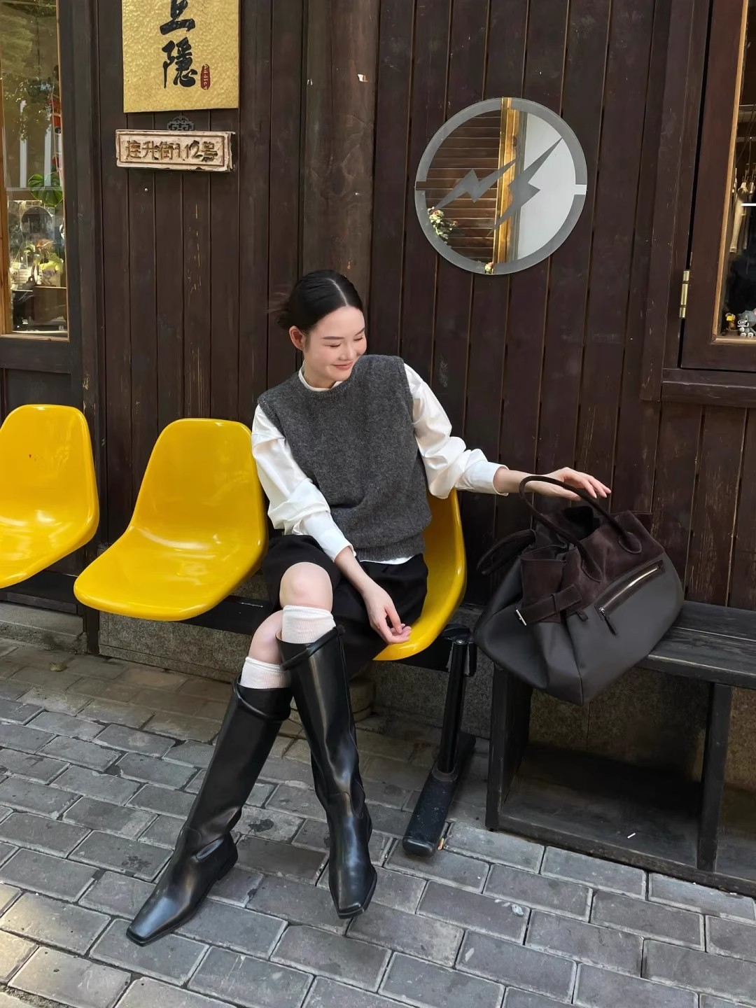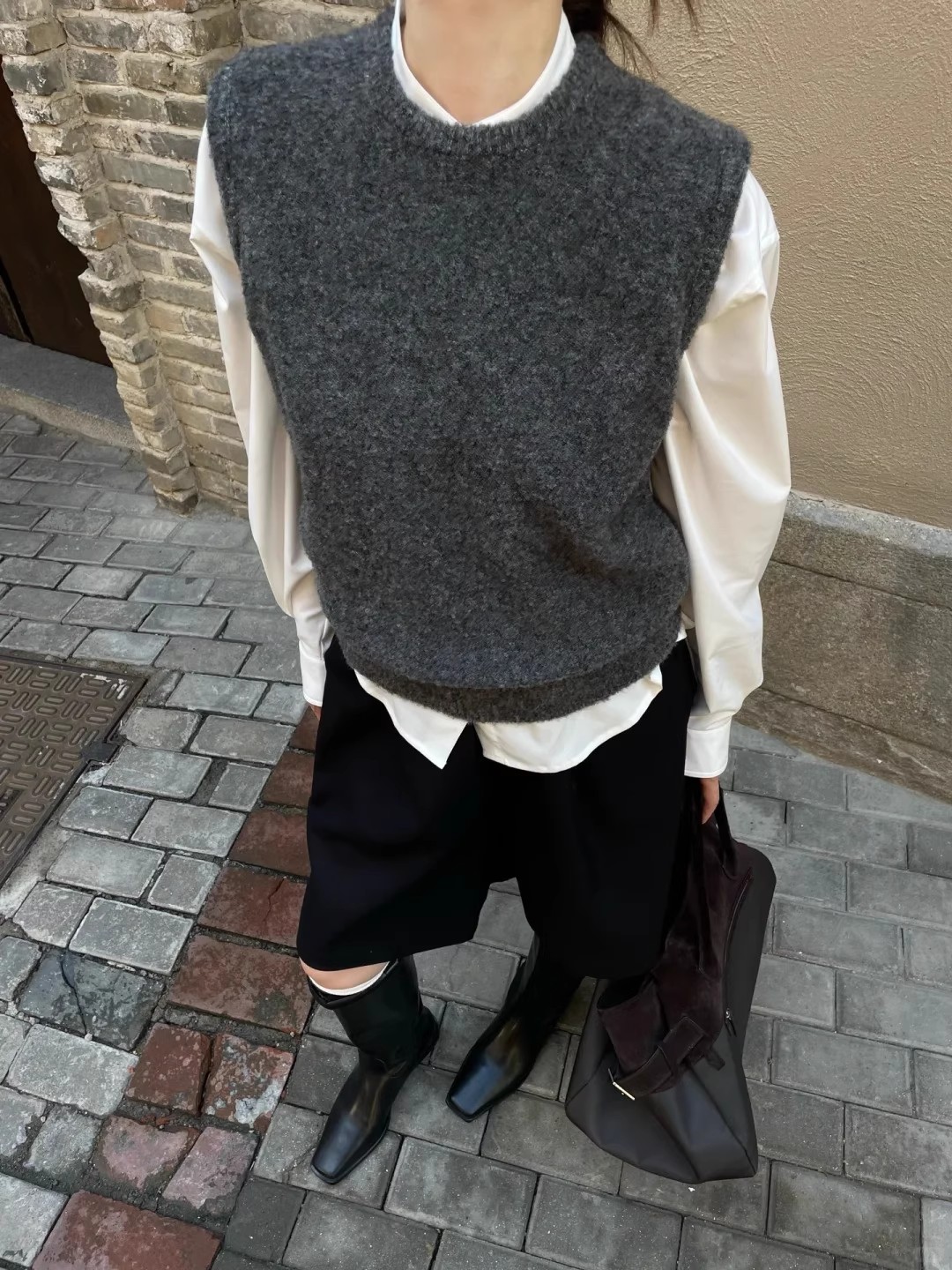 프랑스 스타일의 시크한 회색 민소매 니트 베스트로, 가을과 겨울에 스웨터나 숄더 탑과 레이어드하여 입기 좋습니다.