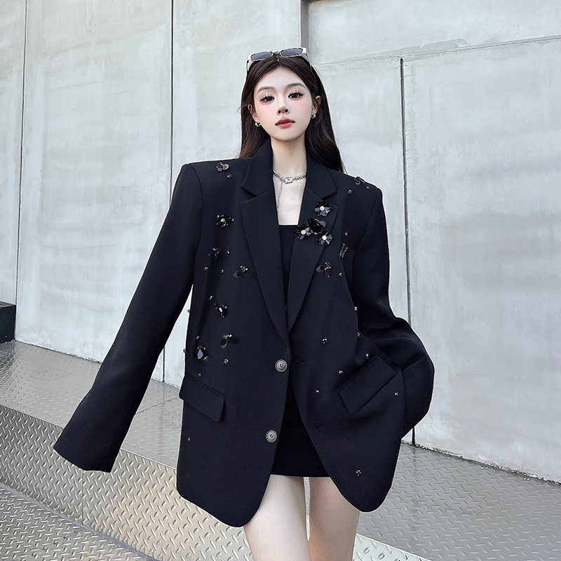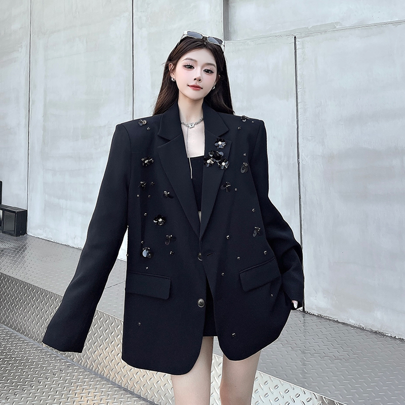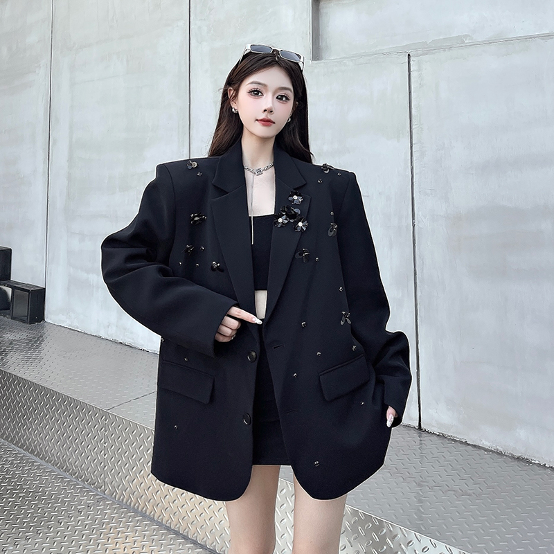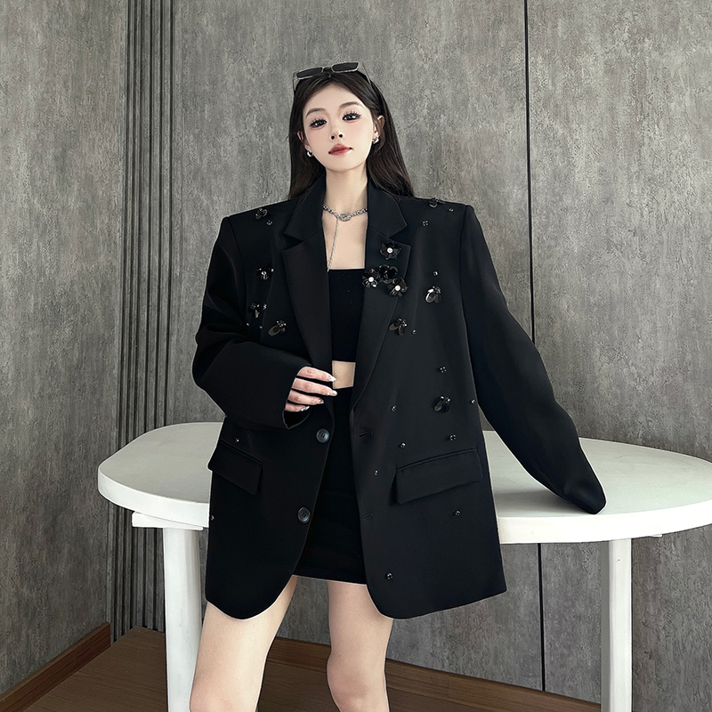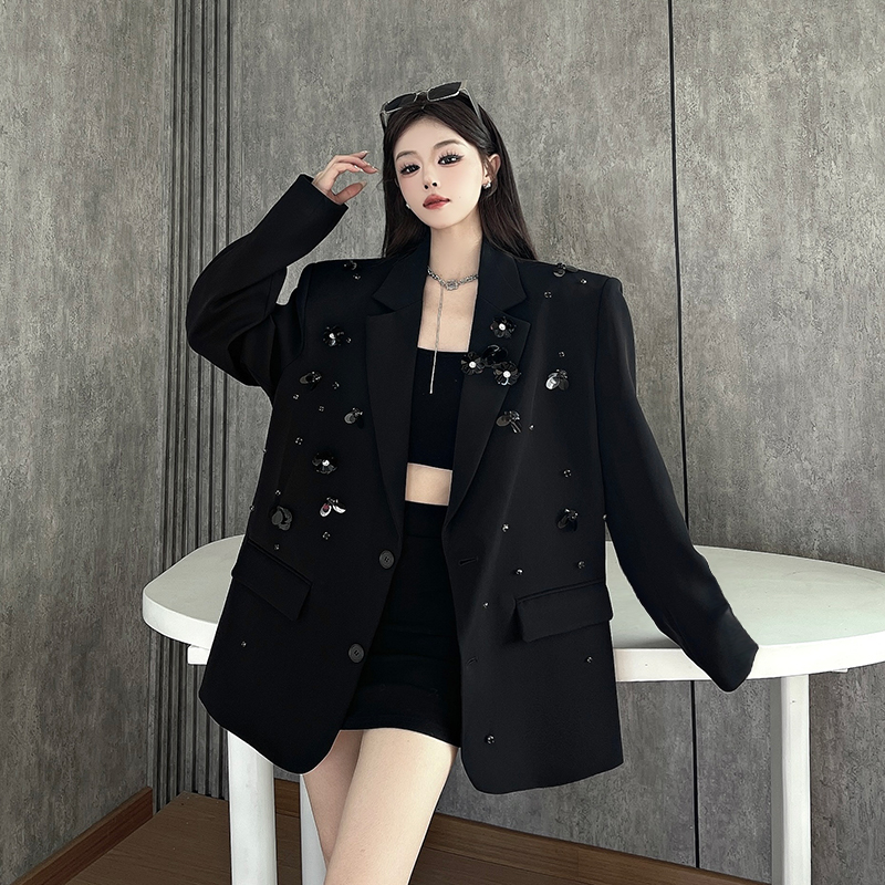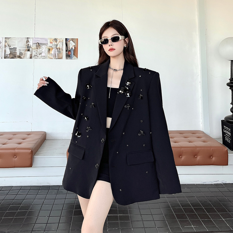 실제 사진, 실제 가격. 고급스럽고 절제된 디자인의 여성용 블랙 정장 재킷입니다. 큐빅 장식과 꽃 브로치가 돋보이는 독특한 스타일입니다.