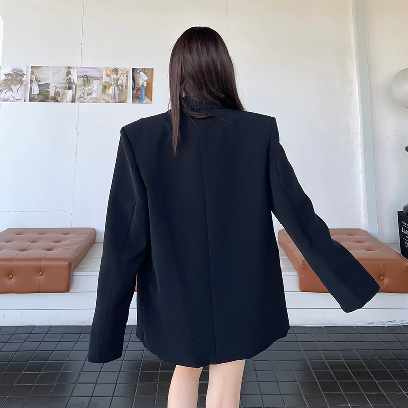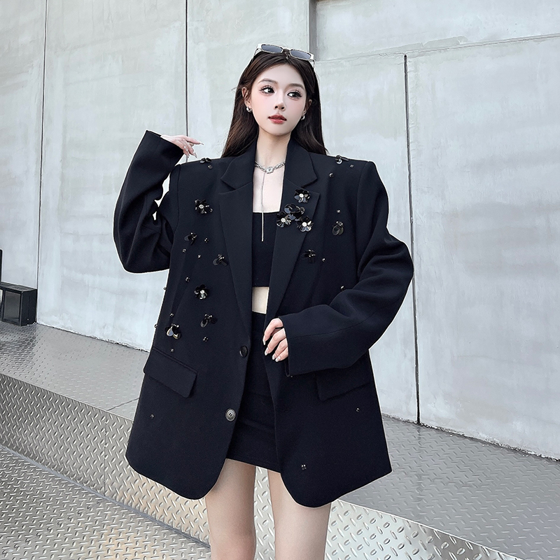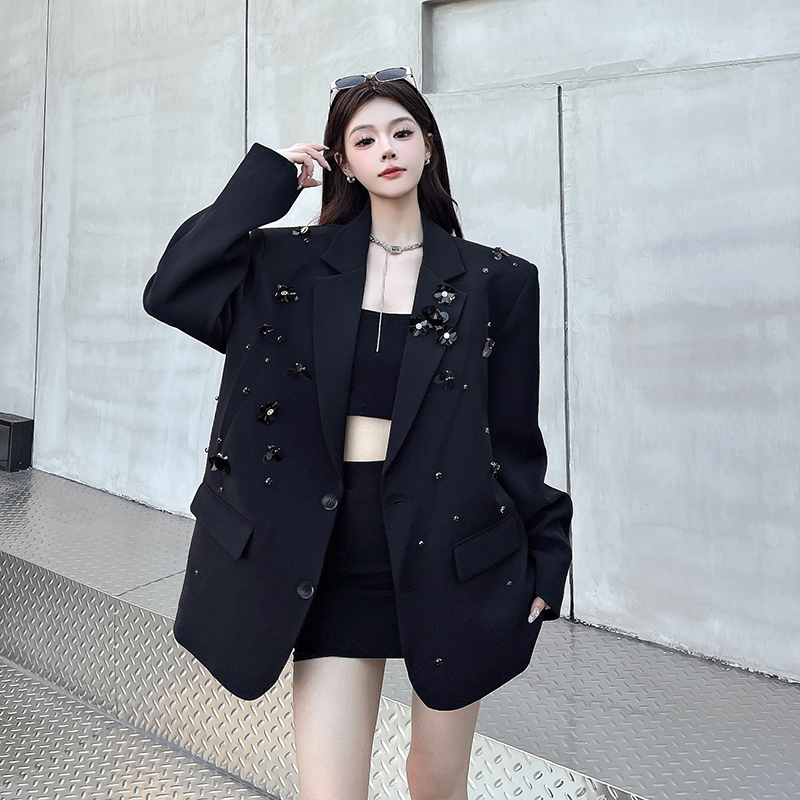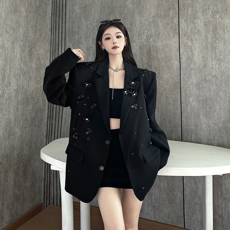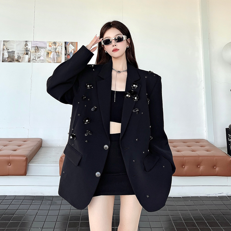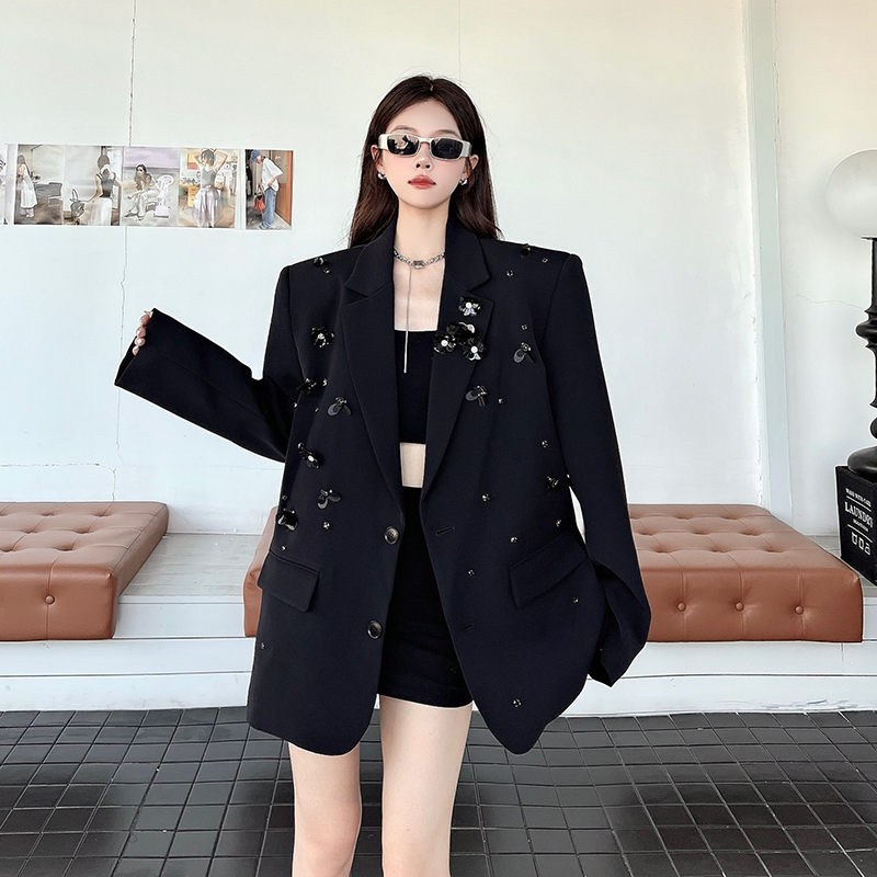 실제 사진, 실제 가격. 고급스럽고 절제된 디자인의 여성용 블랙 정장 재킷입니다. 큐빅 장식과 꽃 브로치가 돋보이는 독특한 스타일입니다.