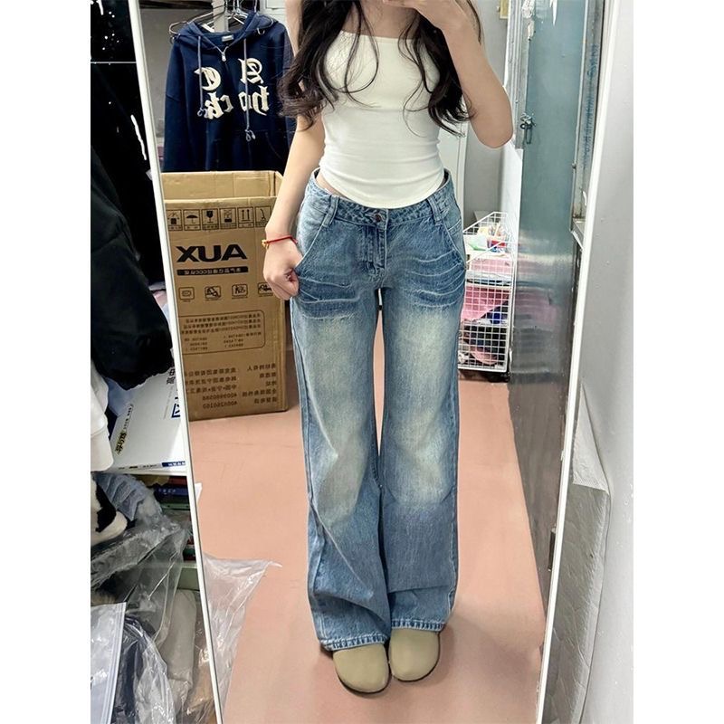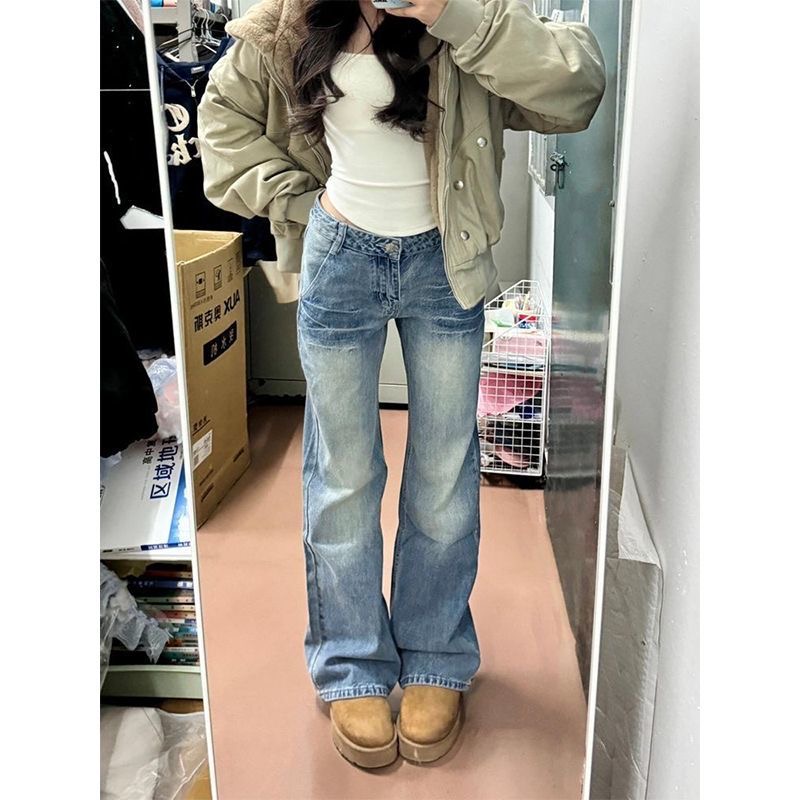 아담한 체형의 여성용 미국 하이스트리트 스타일 워싱 데님 반바지로, 살짝 퍼지는 밑단과 슬림핏이 아닌 로우웨이스트의 루즈한 와이드 레그 플레어 팬츠입니다.