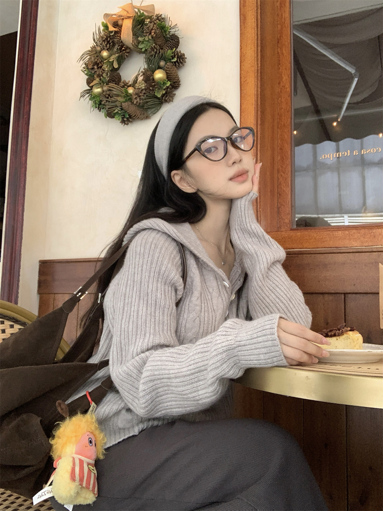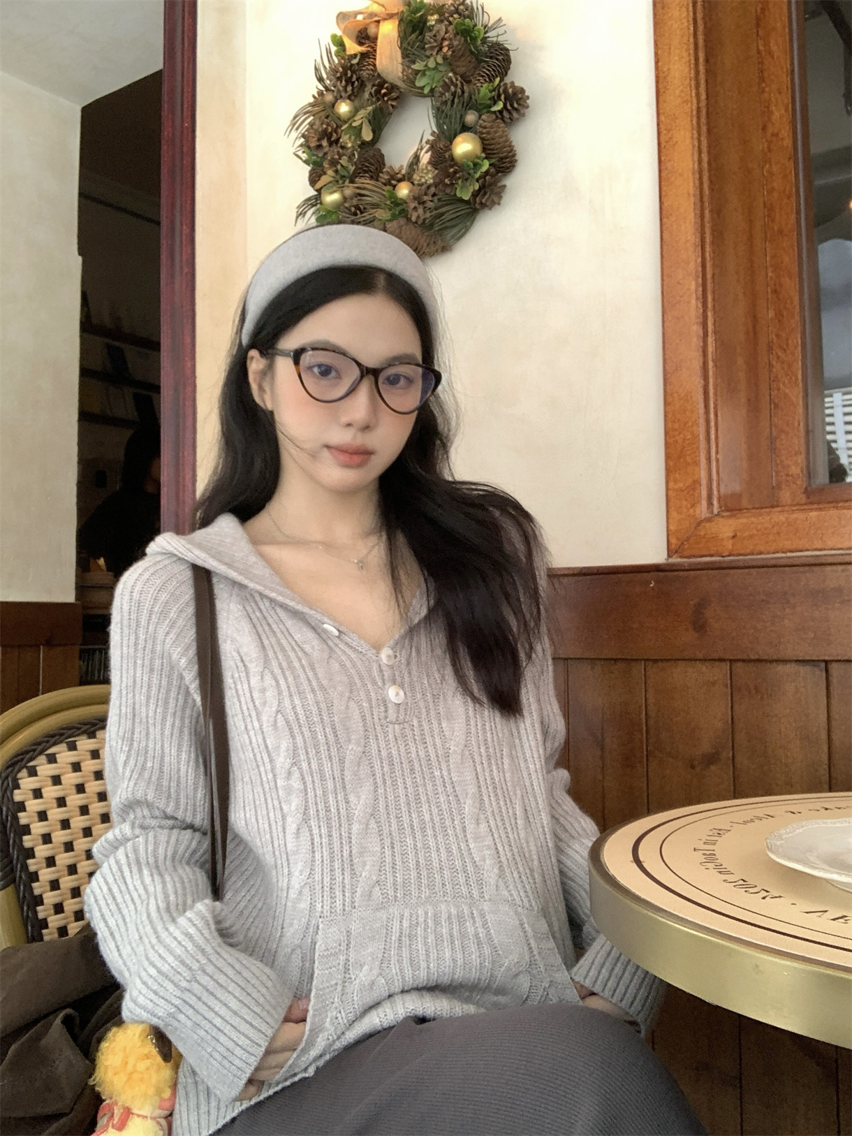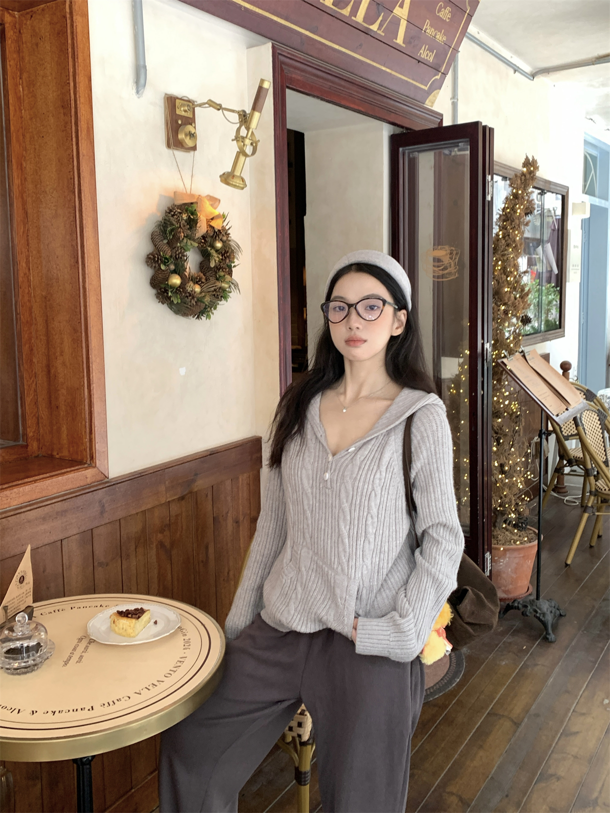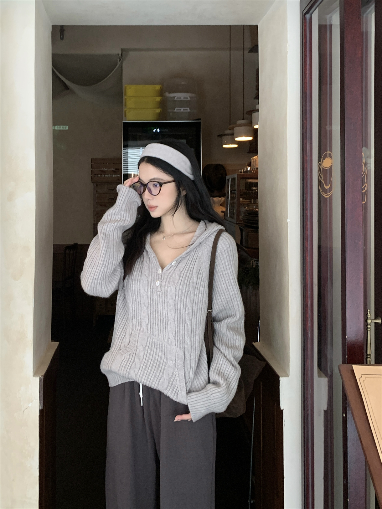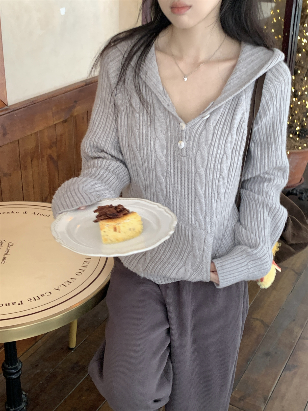 실제 사진, 실제 가격~ 가을/겨울 미국 레트로 스타일 회색 케이블 니트 후드 버튼다운 스웨터 풀오버 가디건