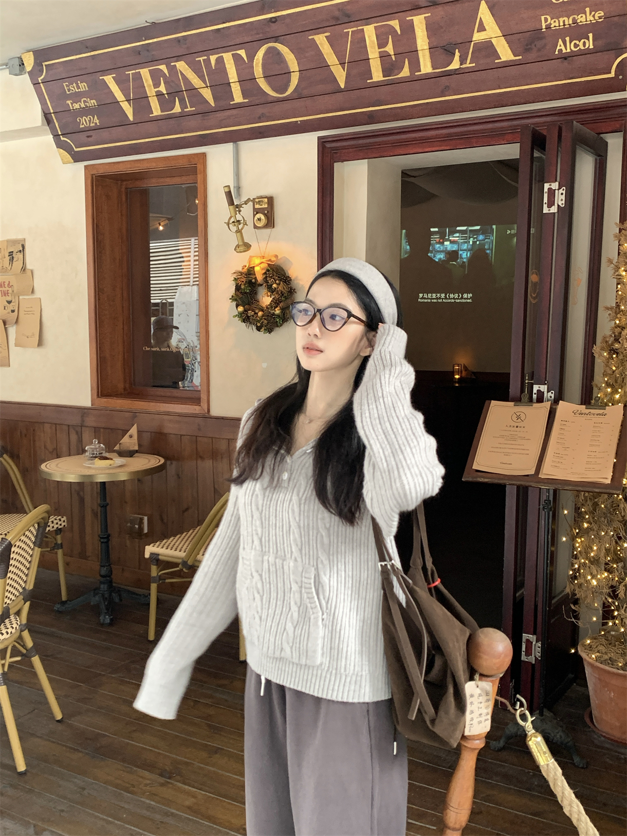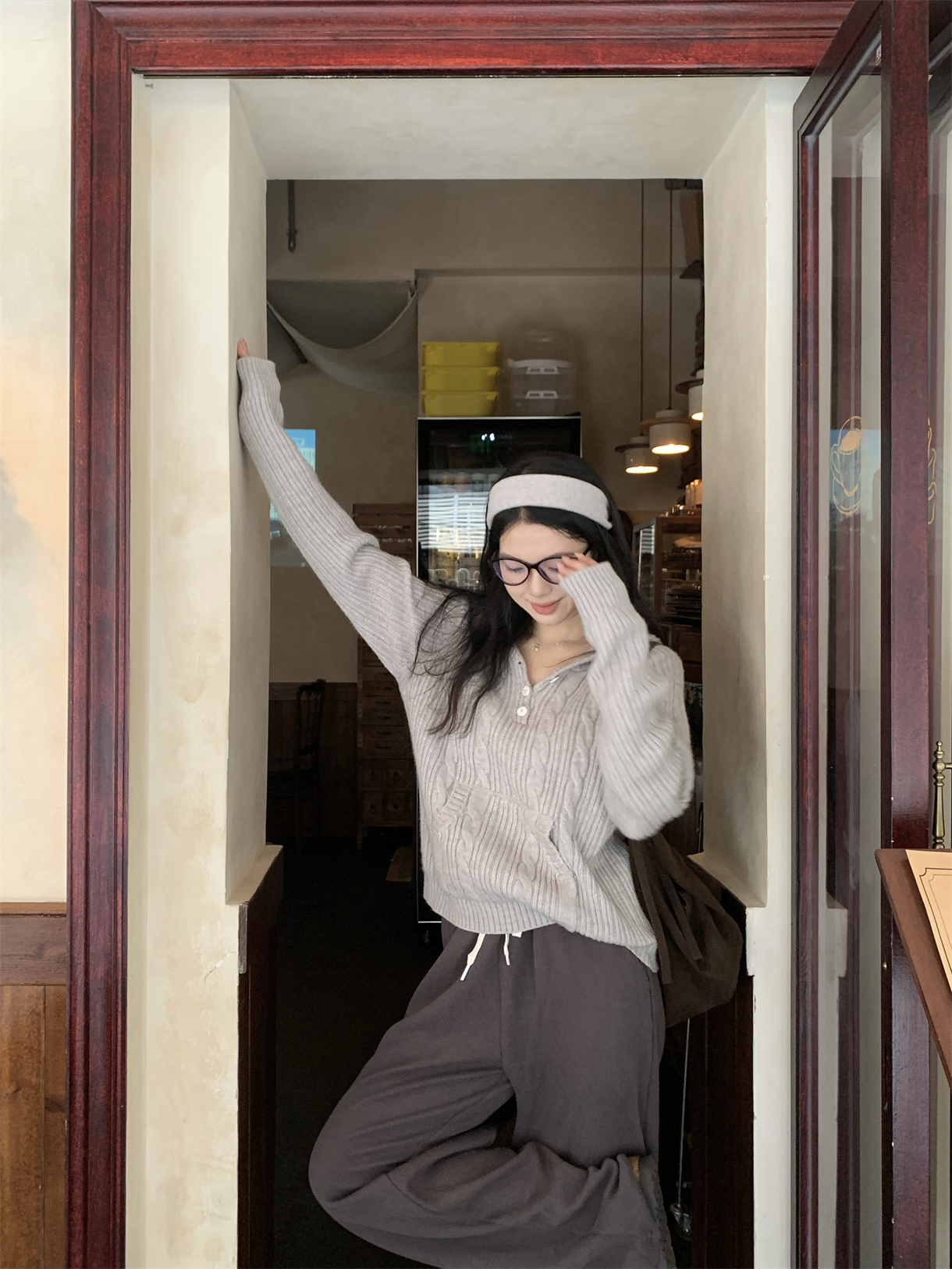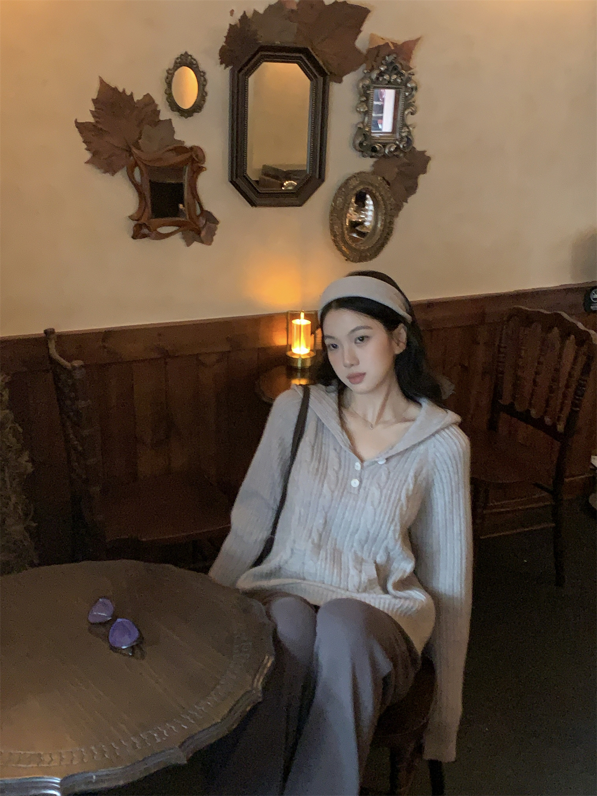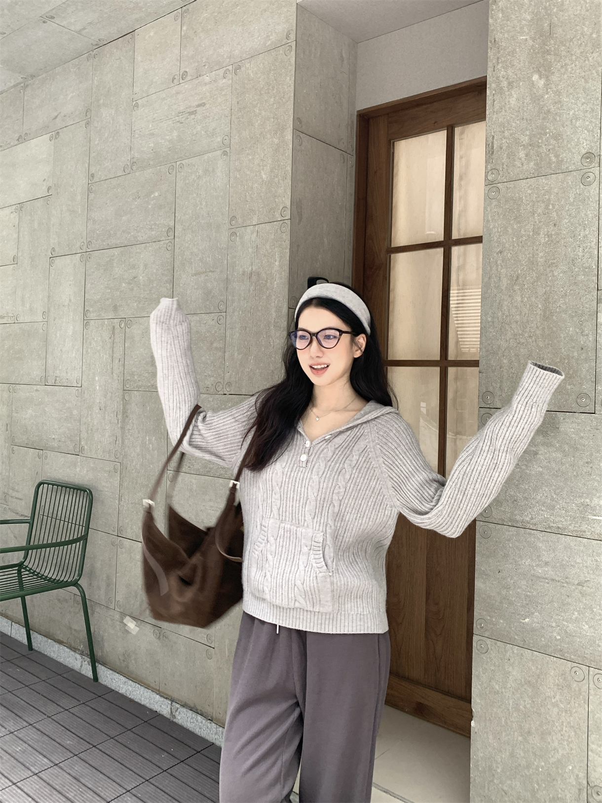 실제 사진, 실제 가격~ 가을/겨울 미국 레트로 스타일 회색 케이블 니트 후드 버튼다운 스웨터 풀오버 가디건