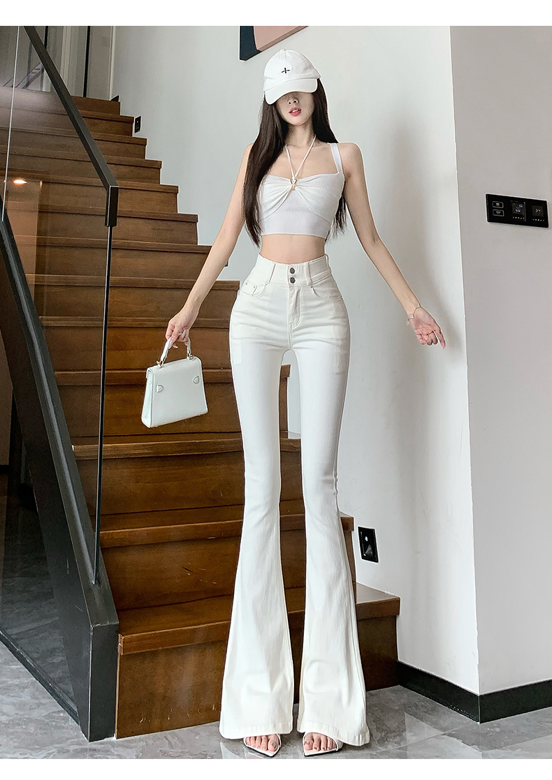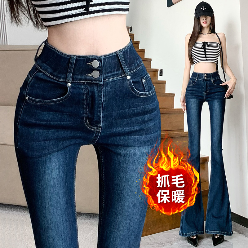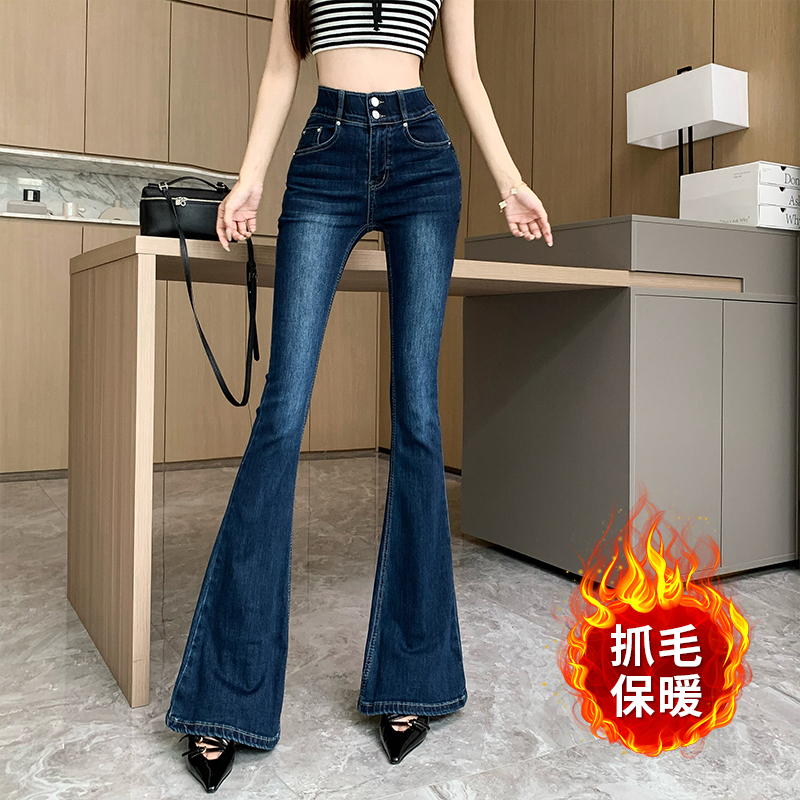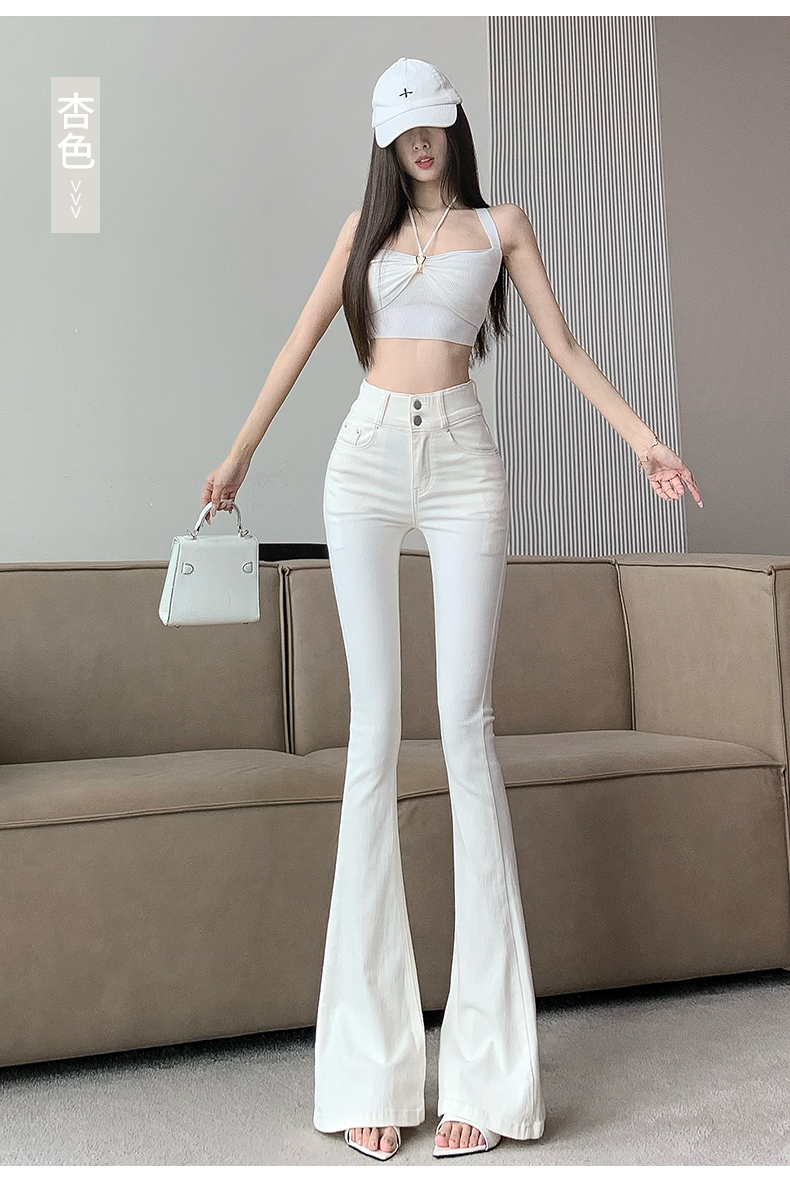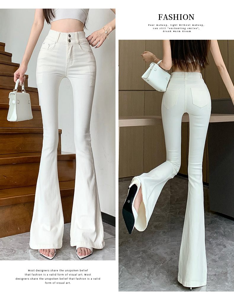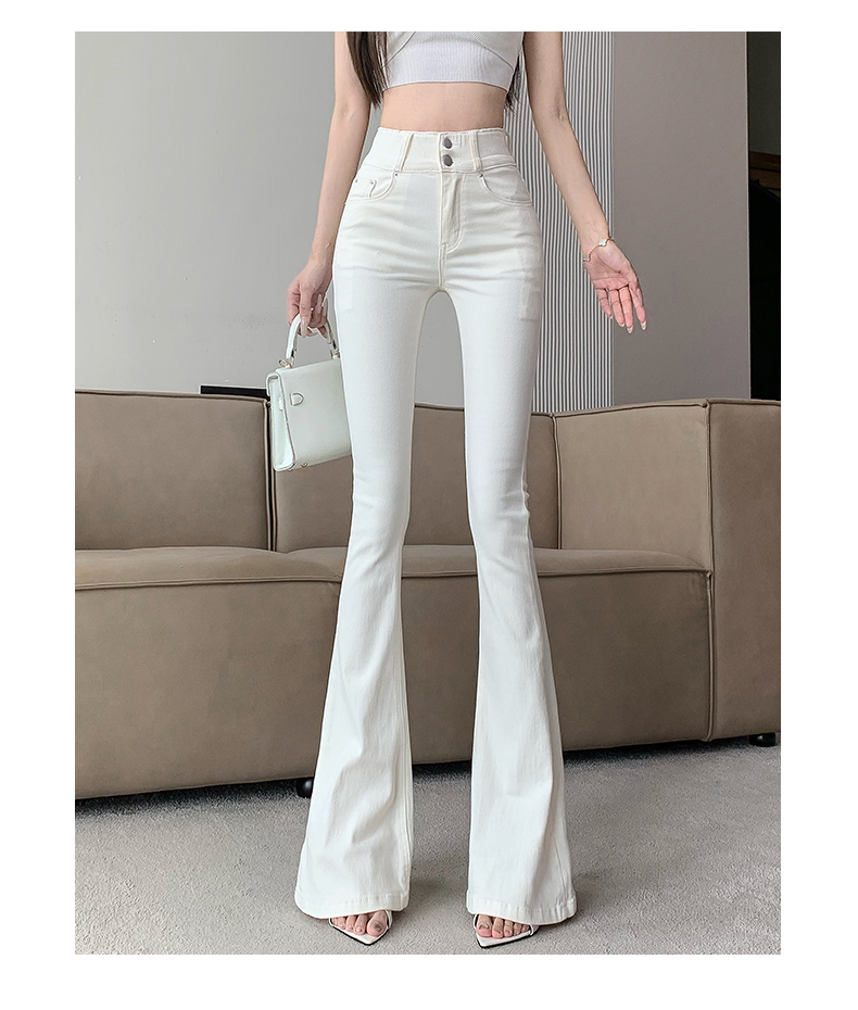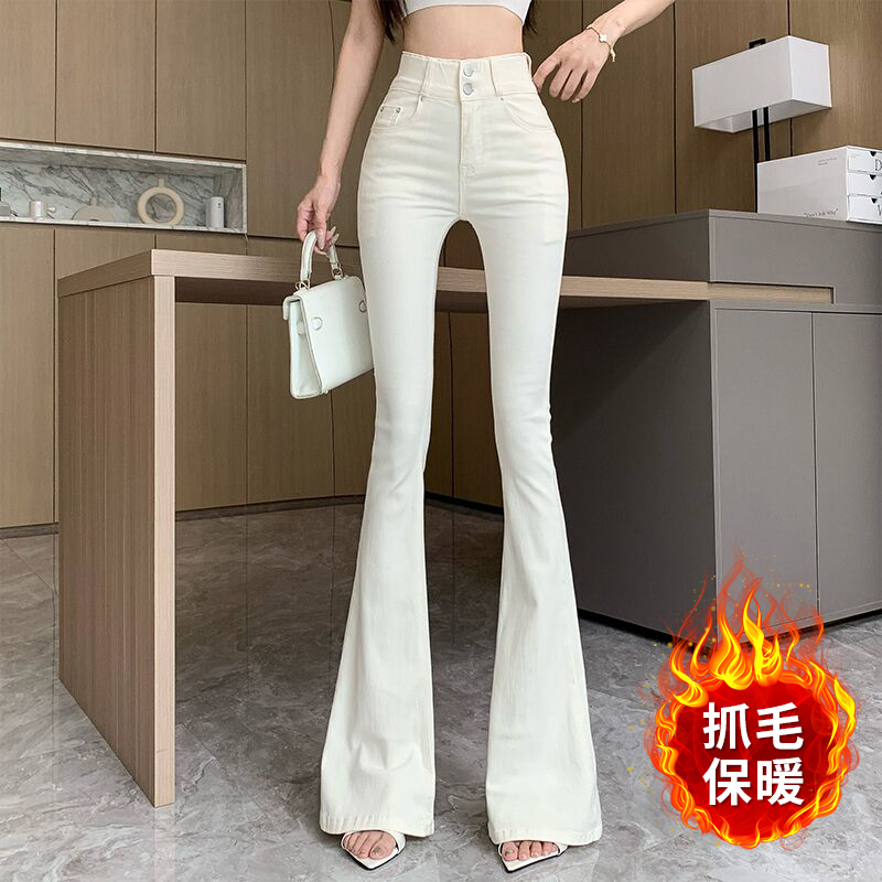실제 사진은 여성용 오프화이트 색상의 플리스 안감 따뜻한 플레어 진을 보여줍니다. 하이웨이스트, 슬림핏, 신축성 있는 소재, 바닥까지 내려오는 길이, 내장형 힙 패드가 특징입니다.
