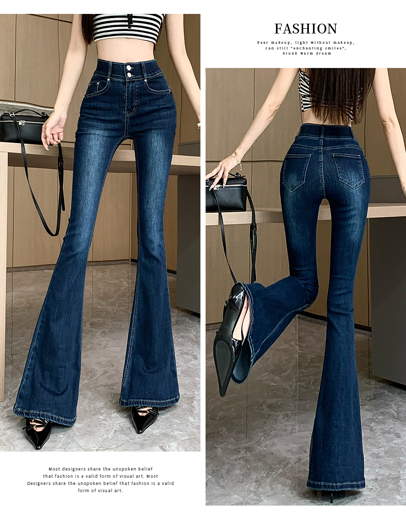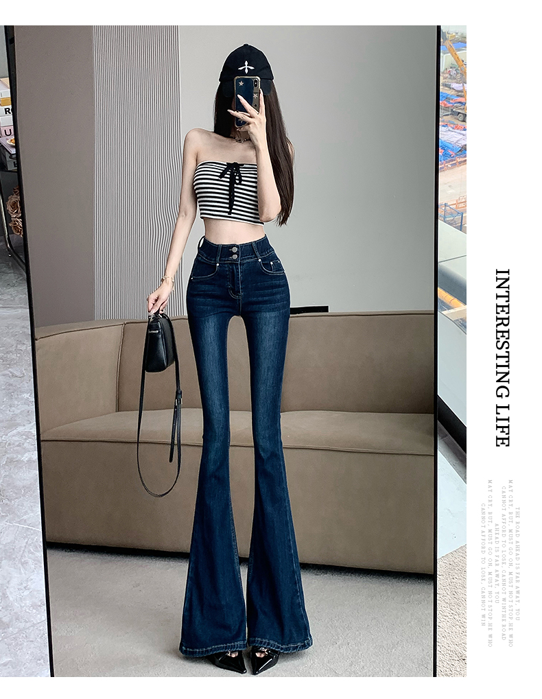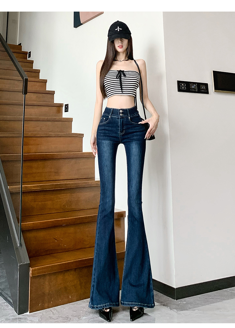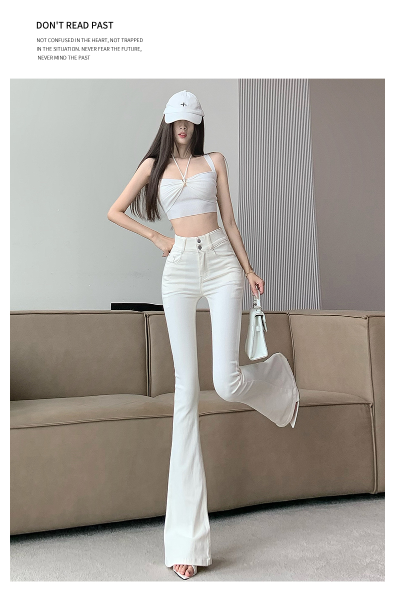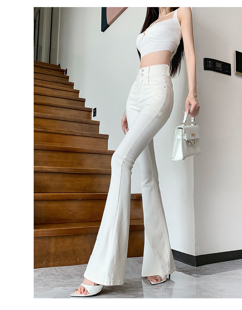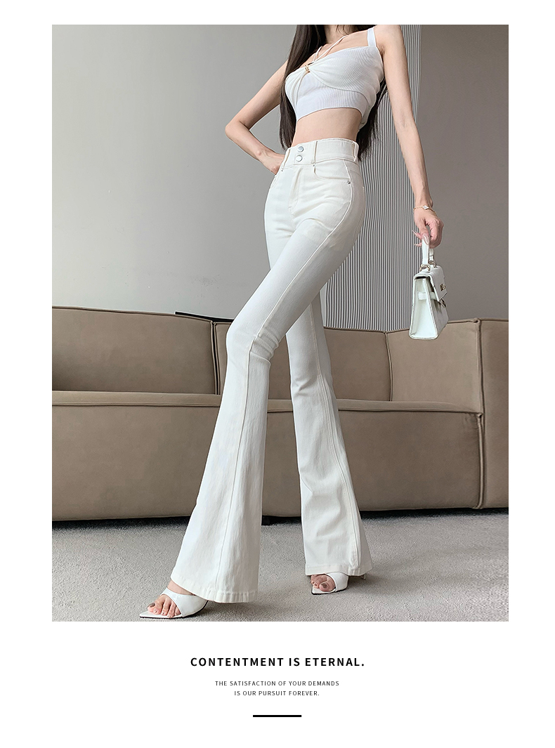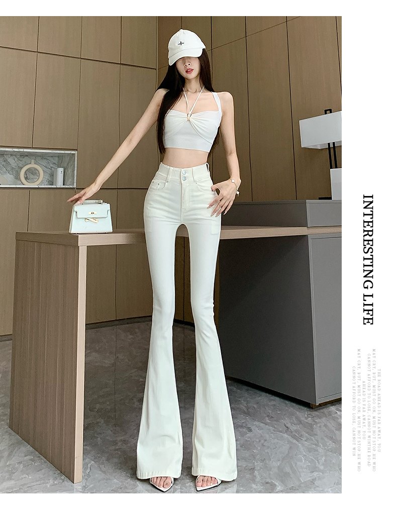 실제 사진은 여성용 오프화이트 색상의 플리스 안감 따뜻한 플레어 진을 보여줍니다. 하이웨이스트, 슬림핏, 신축성 있는 소재, 바닥까지 내려오는 길이, 내장형 힙 패드가 특징입니다.